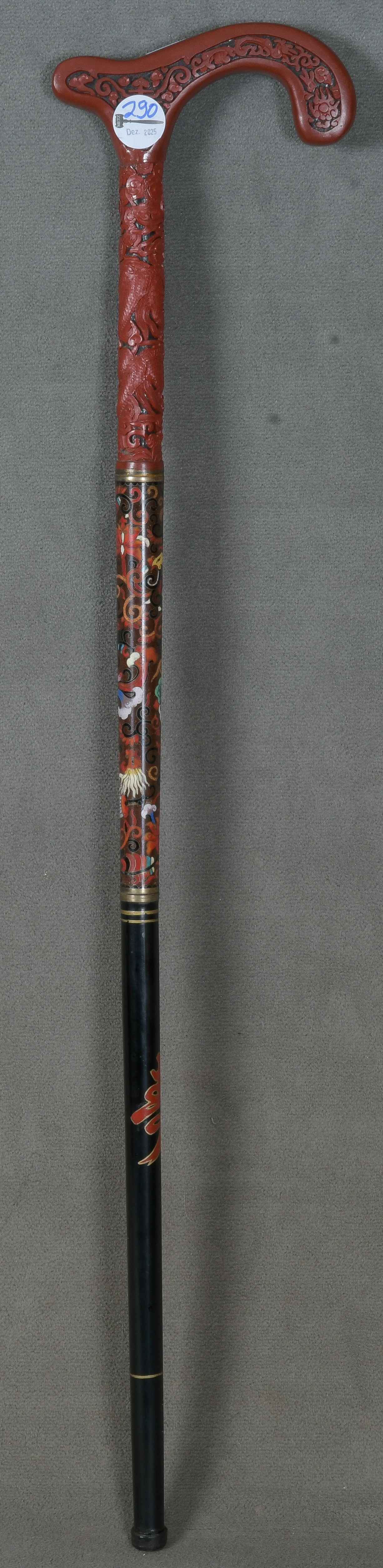 - Katalog-Nr: 290Spazierstock. Asien. Ebonisiertes Massivholz, Cloissoné und Siegellack mit Blüten, Blättern und Drachendekor, L=93 cm.o.L.