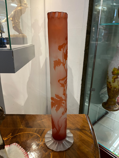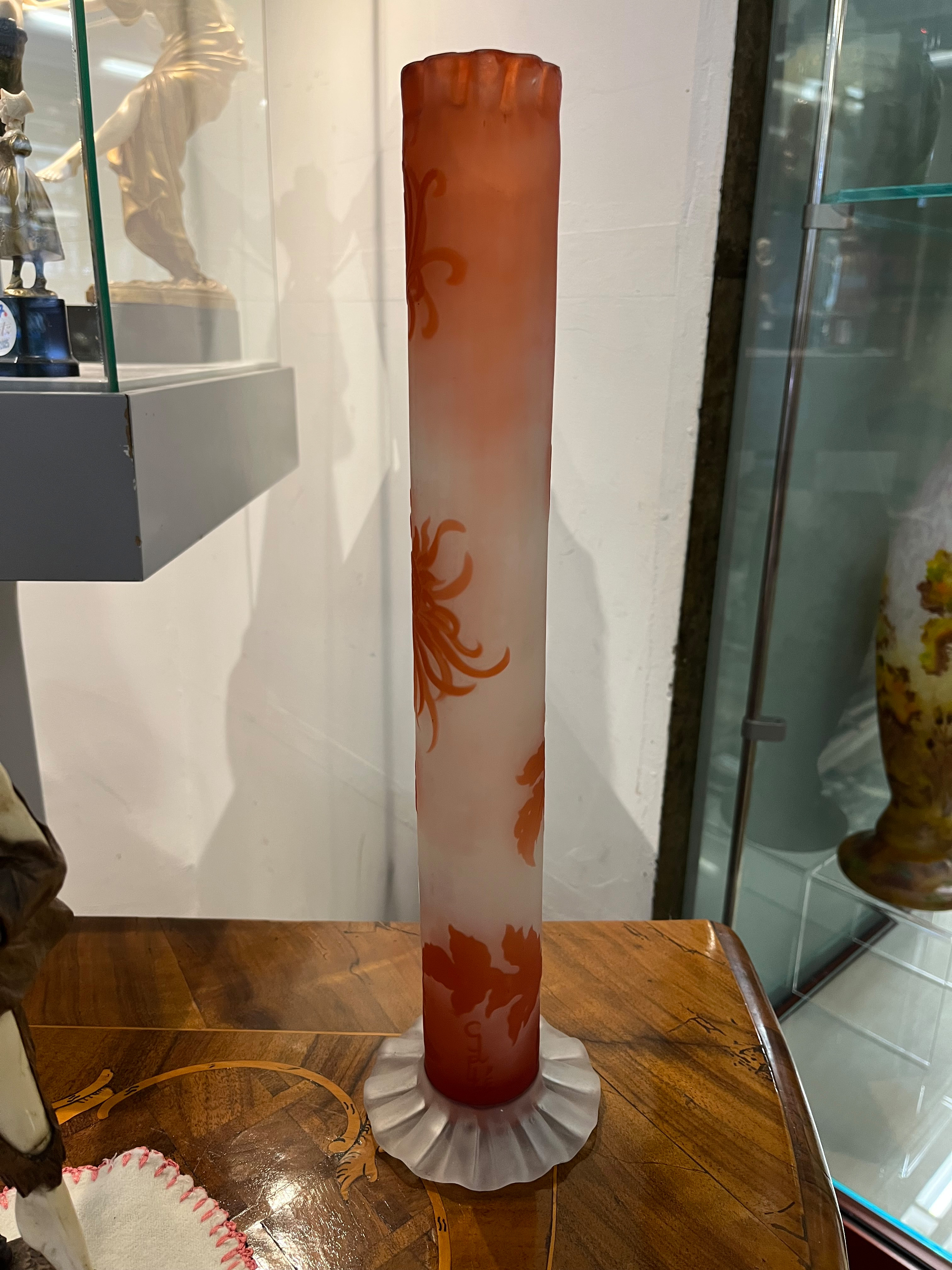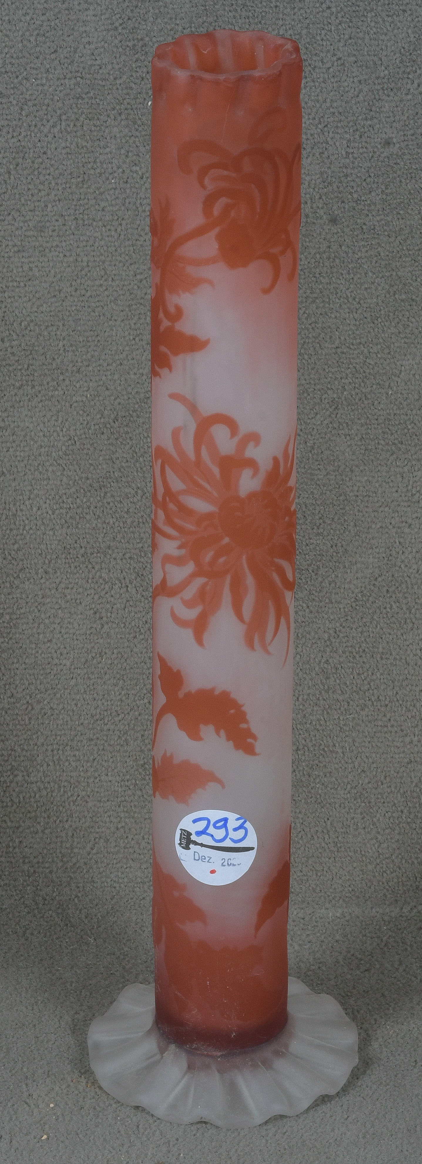 - Katalog-Nr: 293Jugendstil-Stangenvase. Nancy, Émile Gallé um 1900. Farbloses Glas, farbig überfangen, umlaufend floral geschnitten, geätzt und poliert; an der Wandung sign., H=39,3 cm.o.L.
