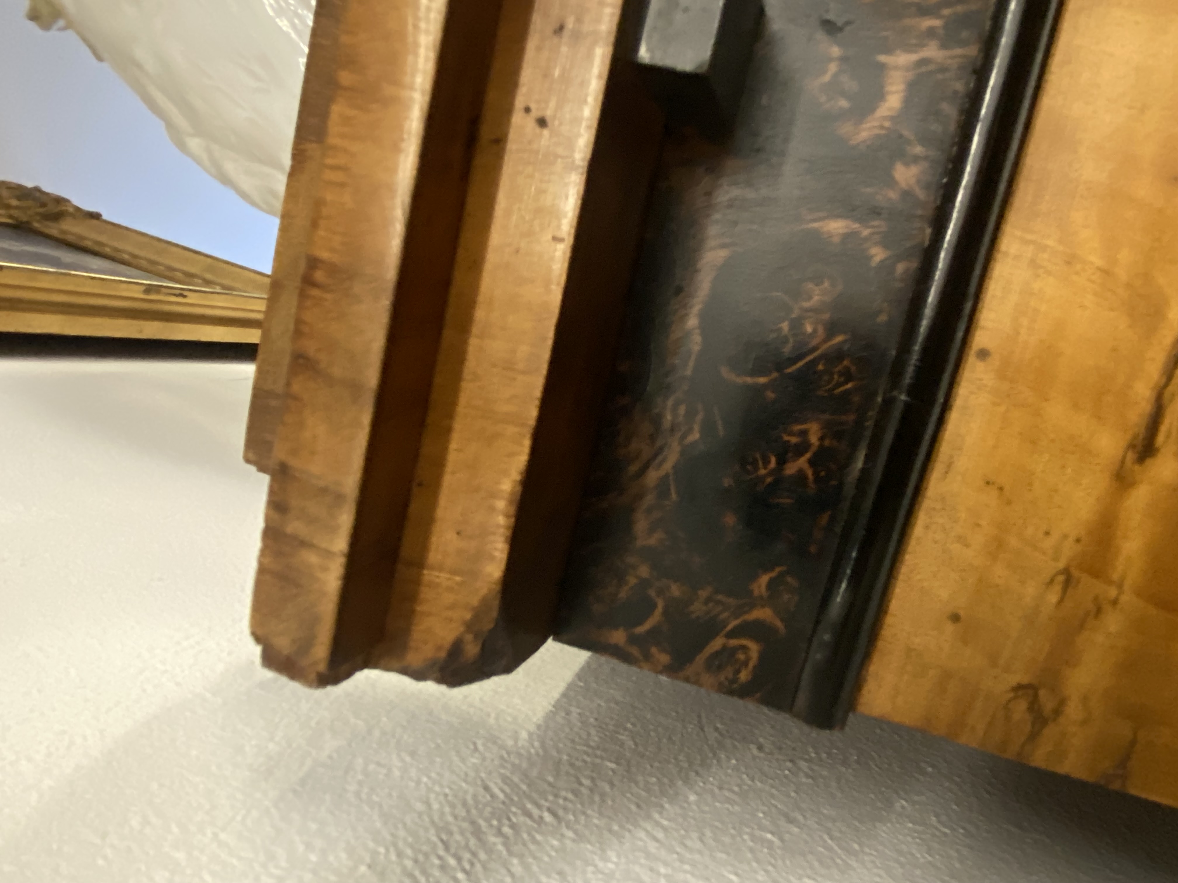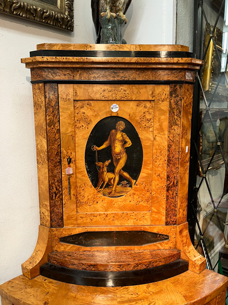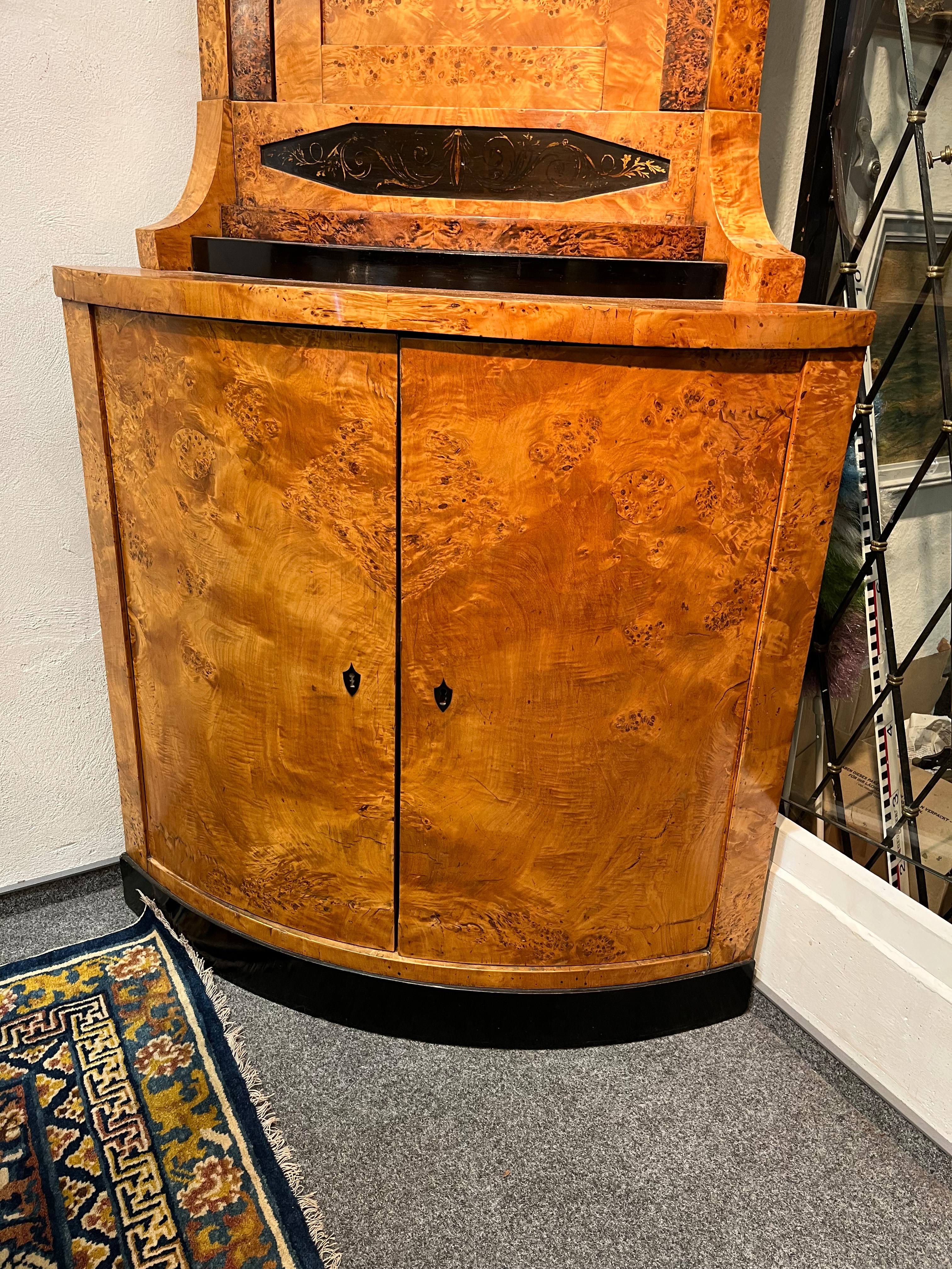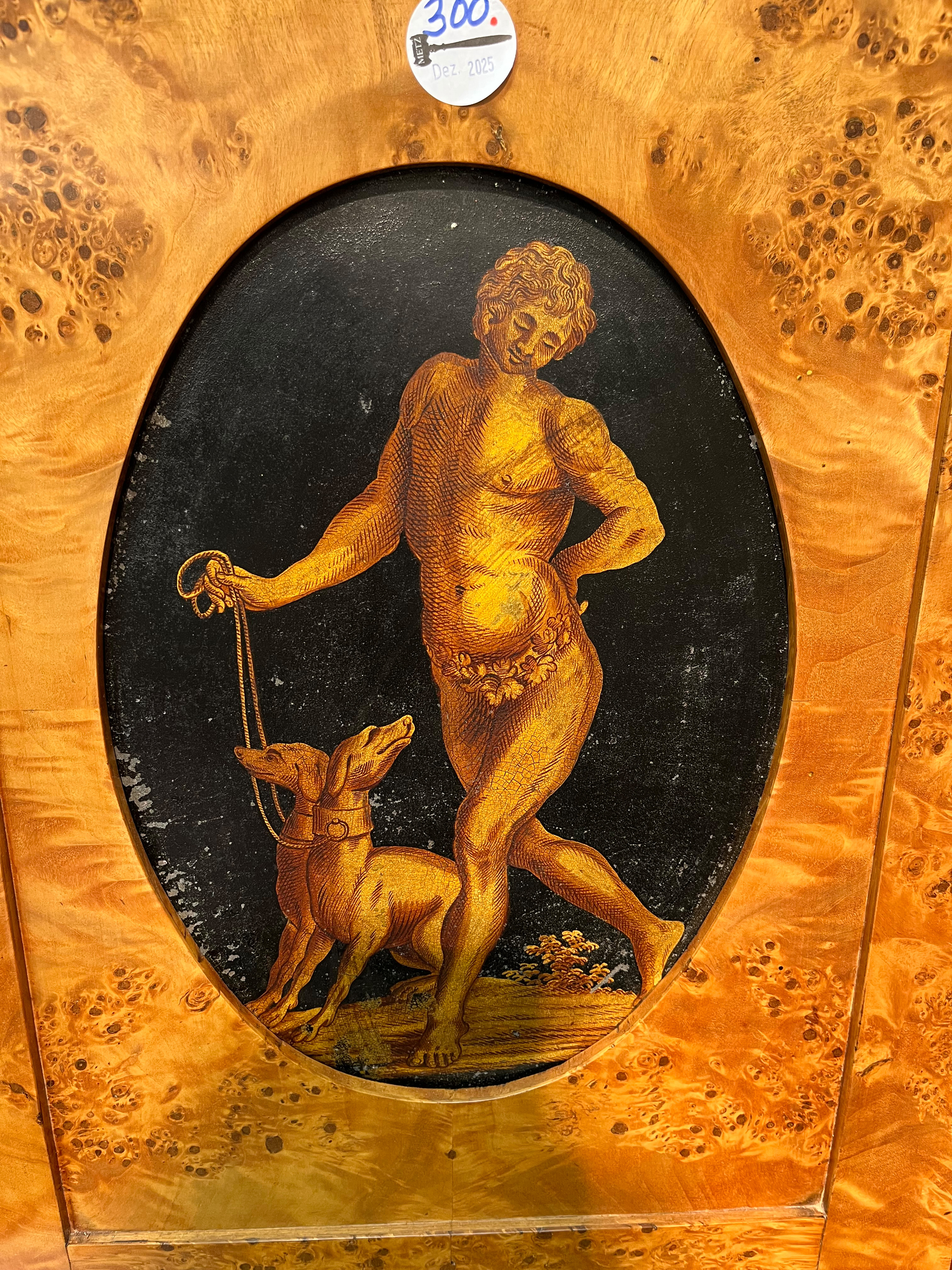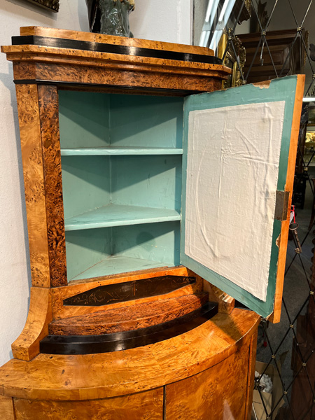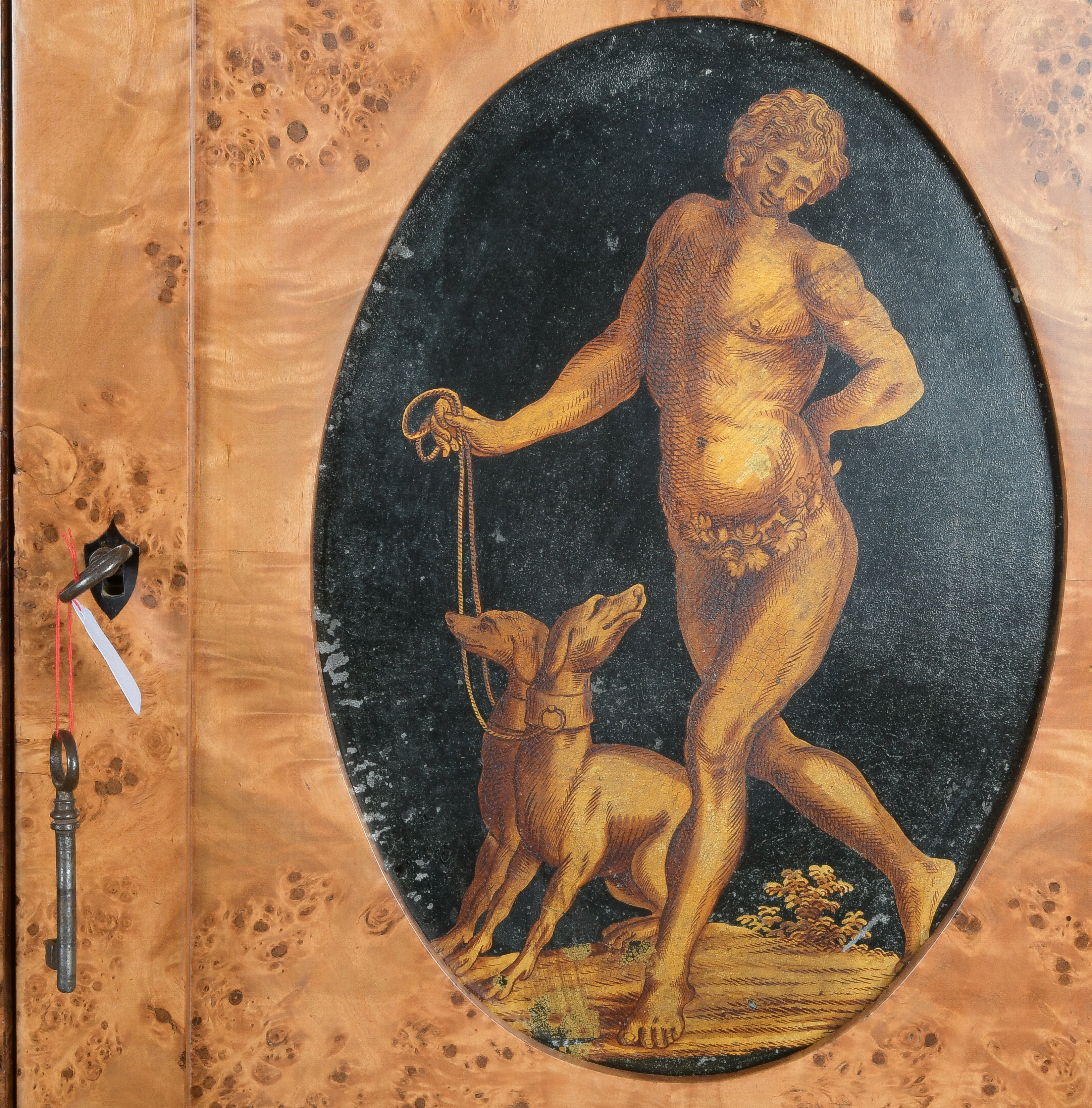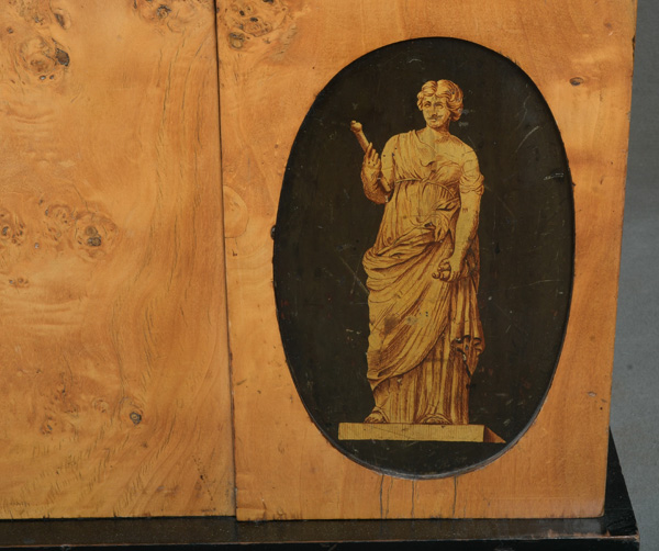 - Katalog-Nr: 300Biedermeier-Eckschrank. Weimar 1810-15. Passend zur Vornummer. Vogelaugenahorn furniert, teilw. ebonisiert und bemalt mit mythologischen Szenen; gerader Sockel, zurückgesetzter, eintüriger Aufsatz, abgeschrägte, nach unten leicht gebogene Lisenen, feinstens gearbeitet mit fortlaufendem Furnierbild, gerade Platte, getreppter, profierter Giebel, H=181 cm, ST=63 cm. (alte Patina)o.L.