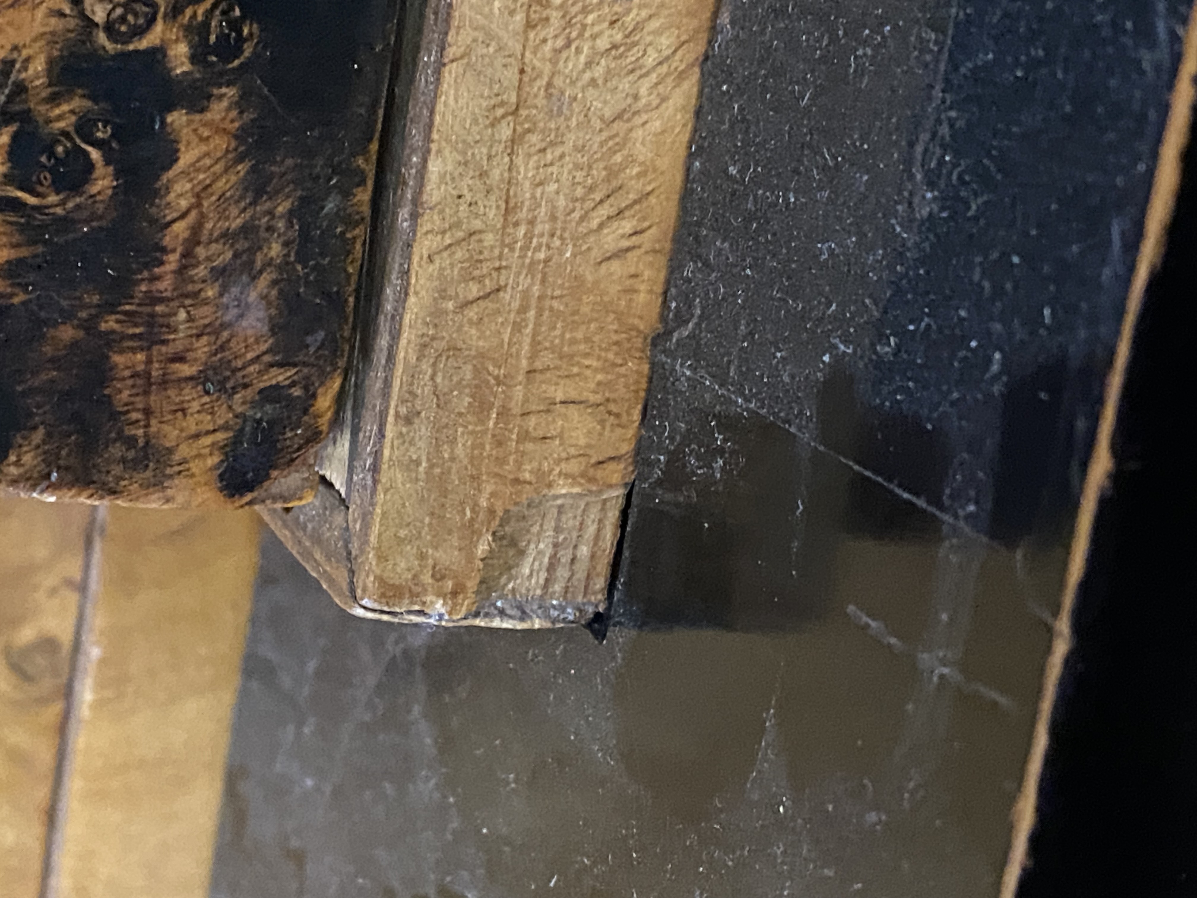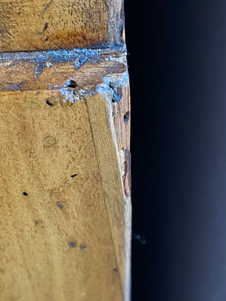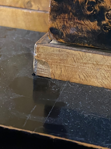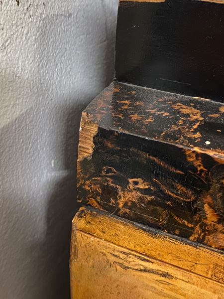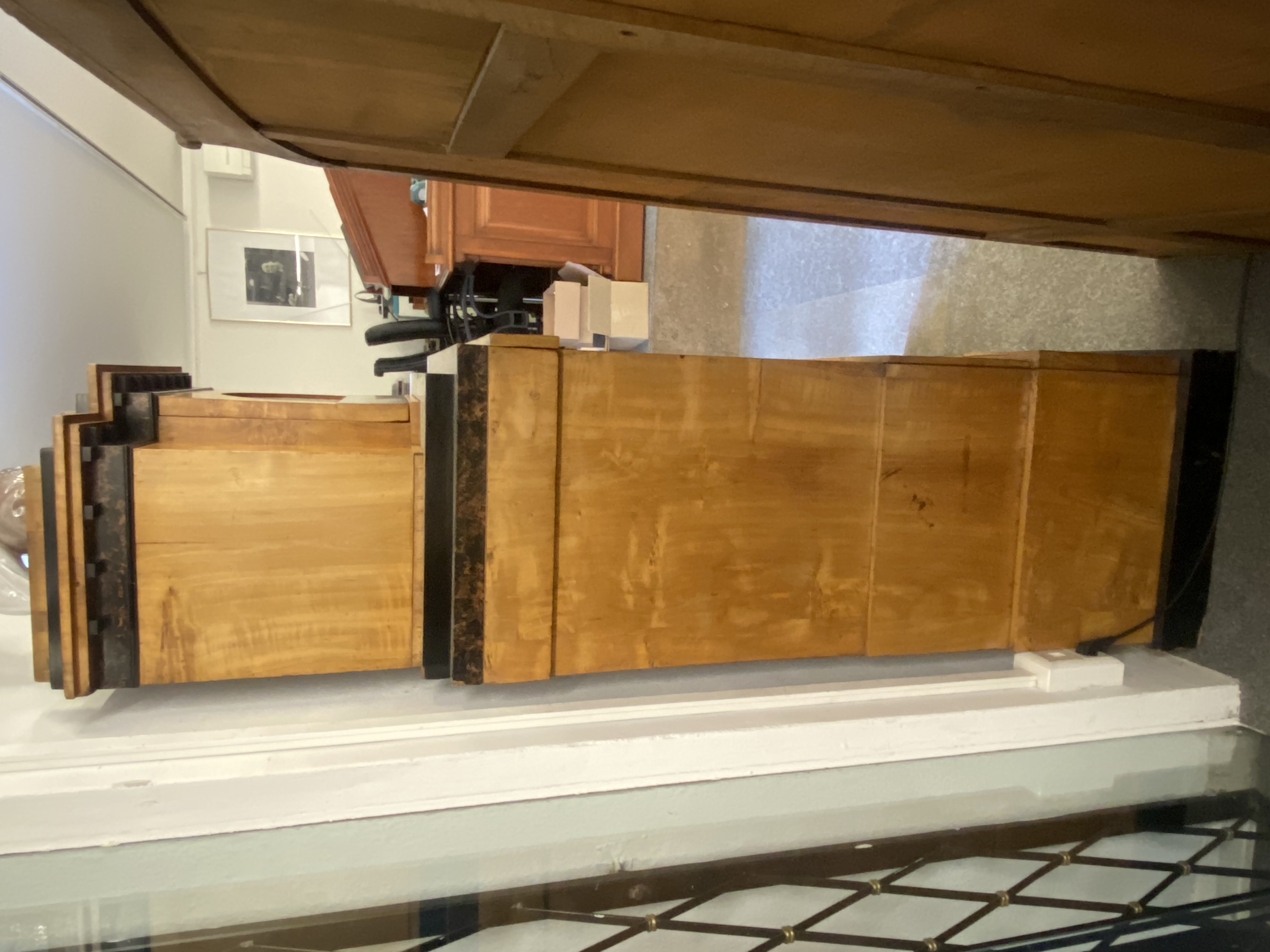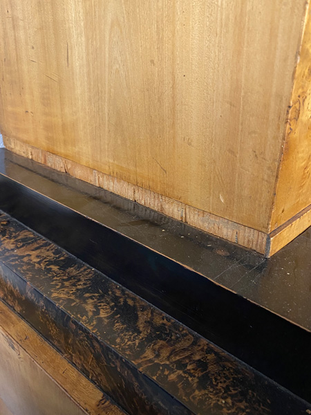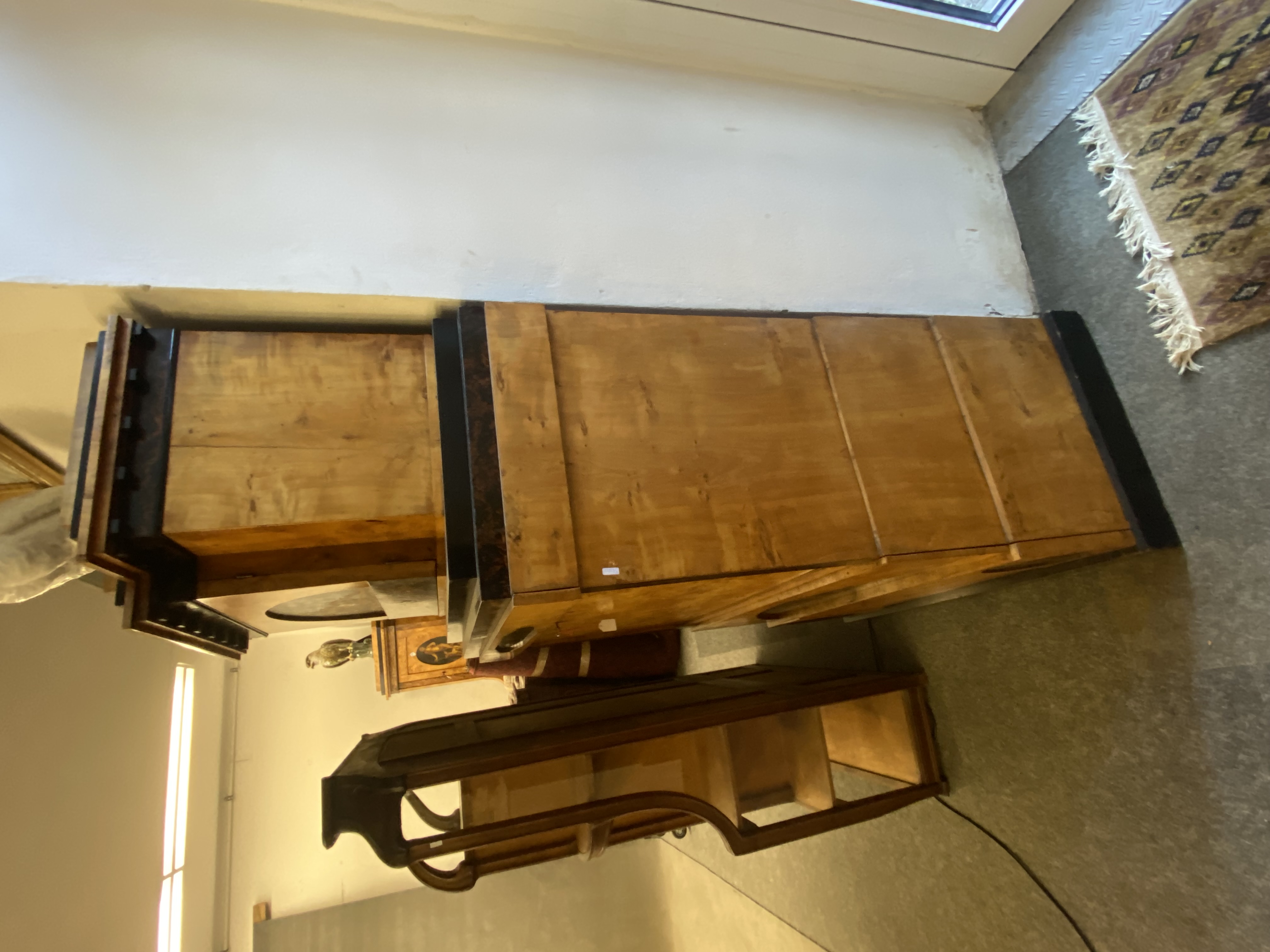 - Katalog-Nr: 300Biedermeier-Eckschrank. Weimar 1810-15. Passend zur Vornummer. Vogelaugenahorn furniert, teilw. ebonisiert und bemalt mit mythologischen Szenen; gerader Sockel, zurückgesetzter, eintüriger Aufsatz, abgeschrägte, nach unten leicht gebogene Lisenen, feinstens gearbeitet mit fortlaufendem Furnierbild, gerade Platte, getreppter, profierter Giebel, H=181 cm, ST=63 cm. (alte Patina)o.L.