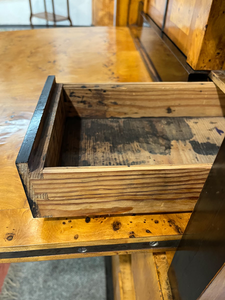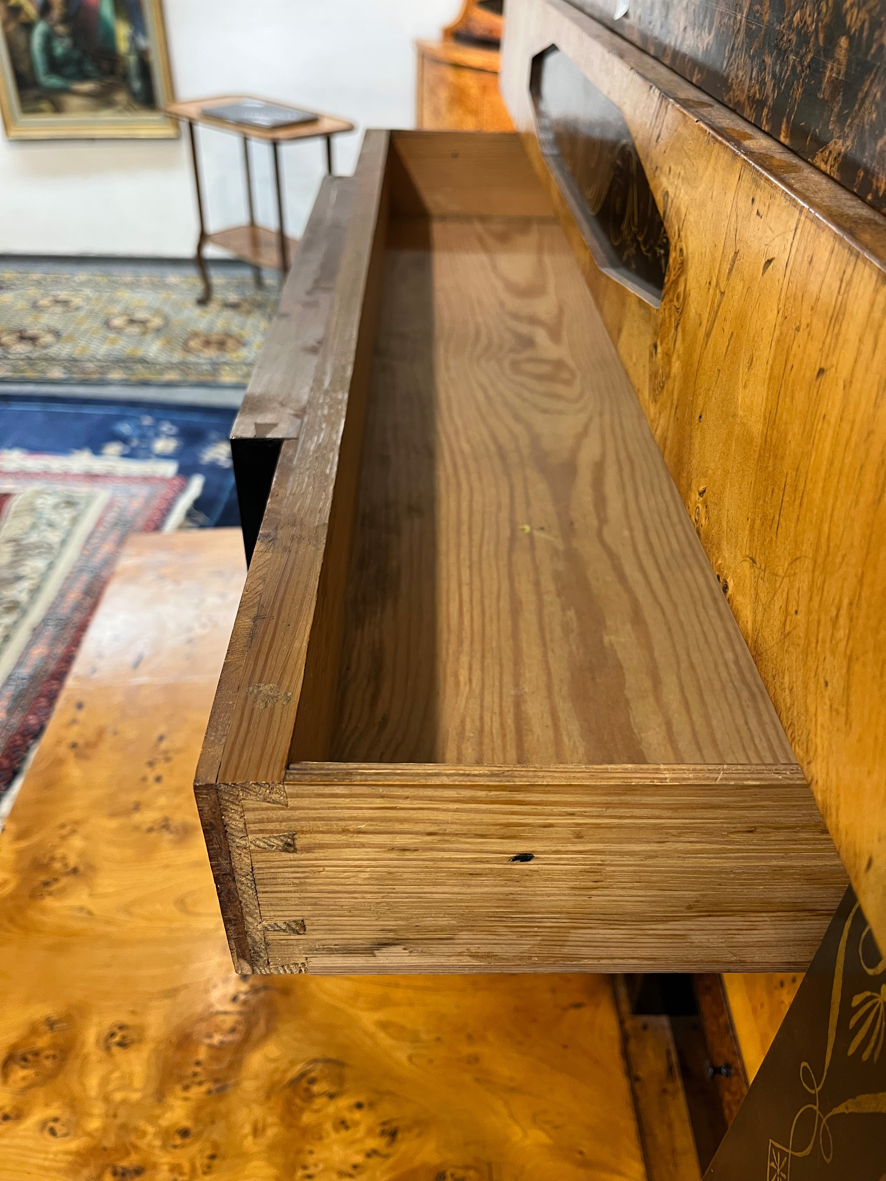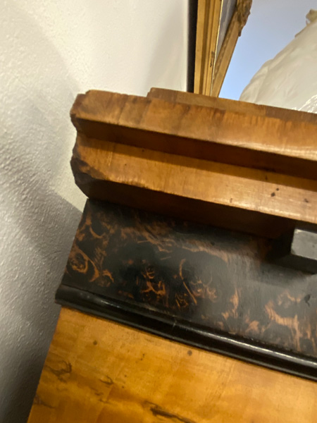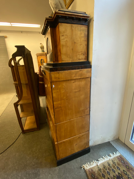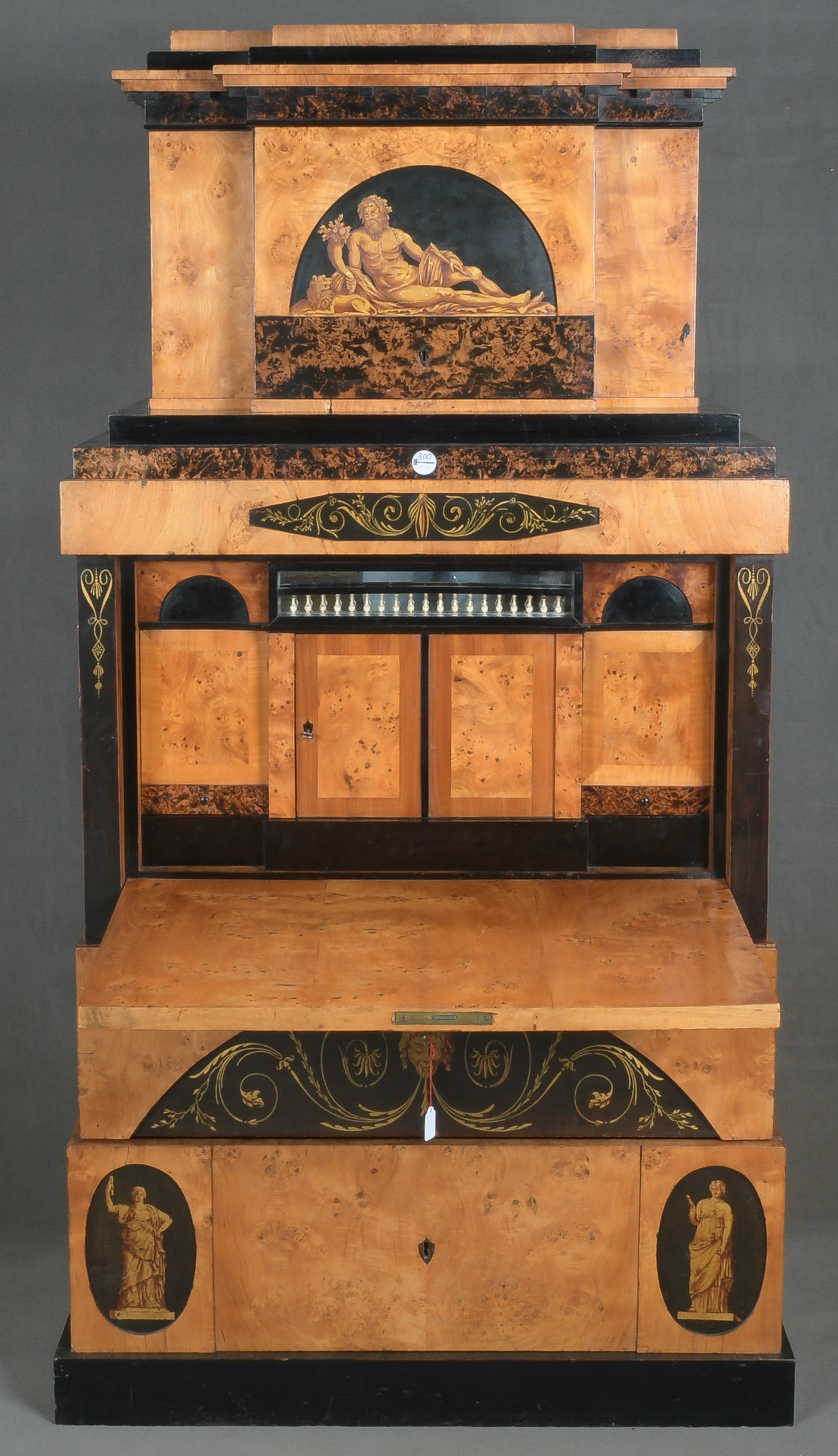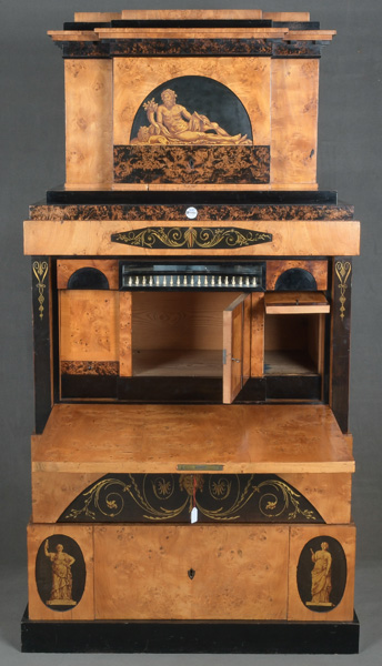 - Katalog-Nr: 299Biedermeier-Standsekretär. Weimar 1810-15. Vogelaugenahorn furniert, teilw. ebonisiert und bemalt mit Blättern, mythologischen Motiven - wohl Hirtenszenen mit Raja, Rauta und Paika - und Rocaillen; getreppter Sockel und Gesims, teilw. mit Zahnschnitt, zwei Schübe, darüber Schreibklappe mit aufwendigem Innenleben, zurückgesetzter, eintüriger, verkröpfter Aufsatz, H=188 cm, B=94 cm, T=49,5 cm. (alte Patina)o.L.