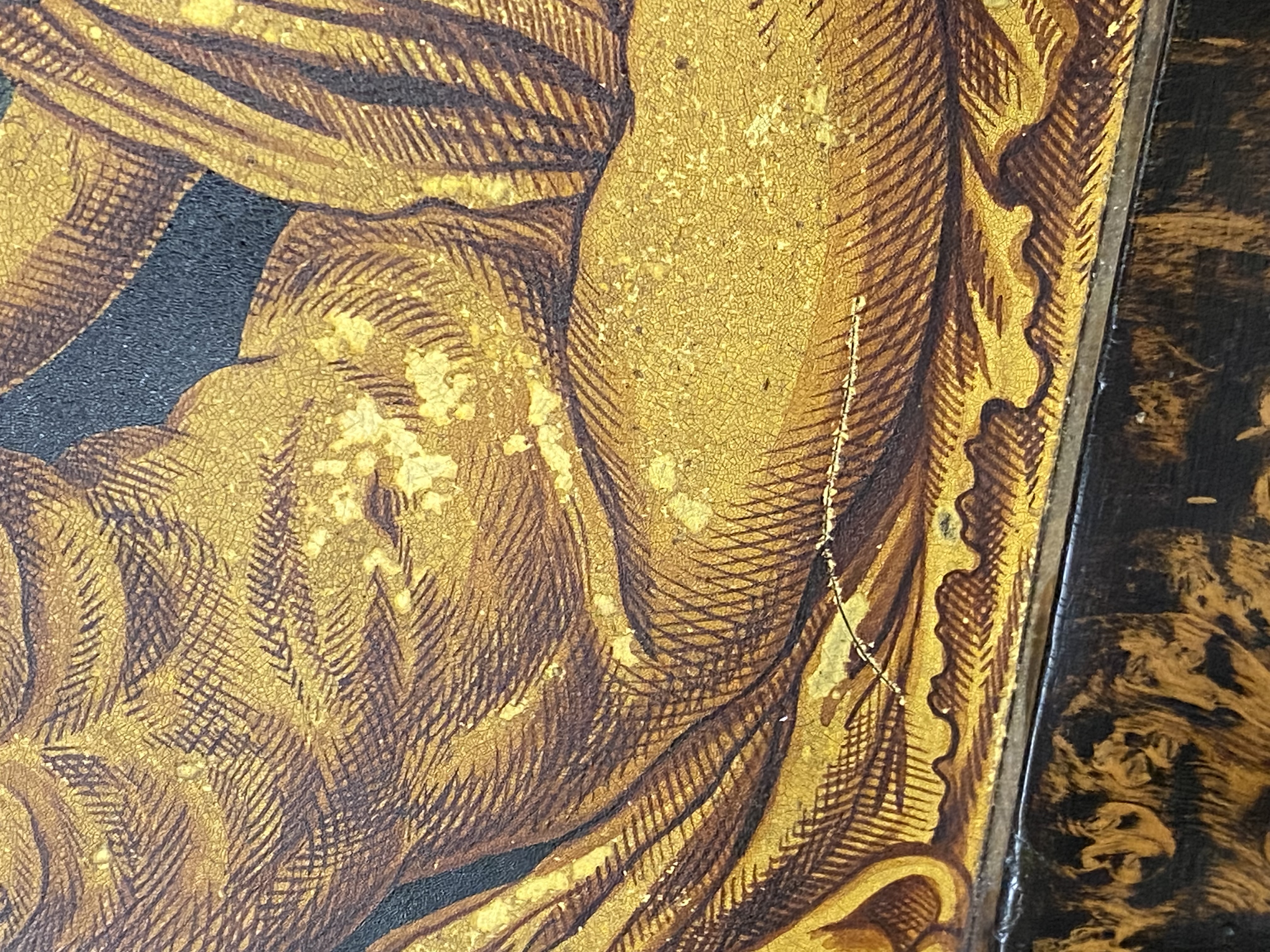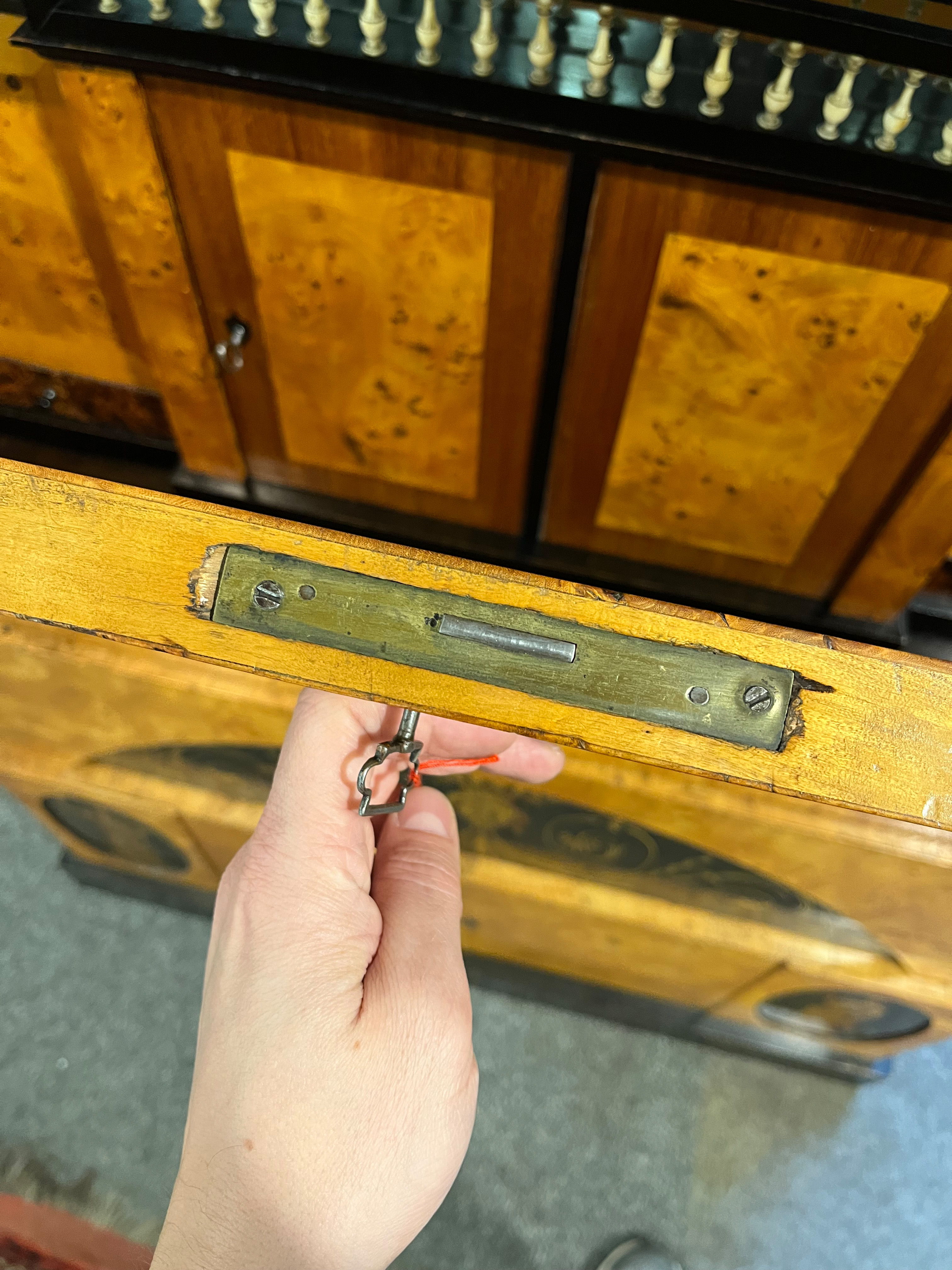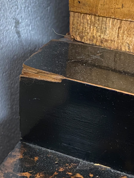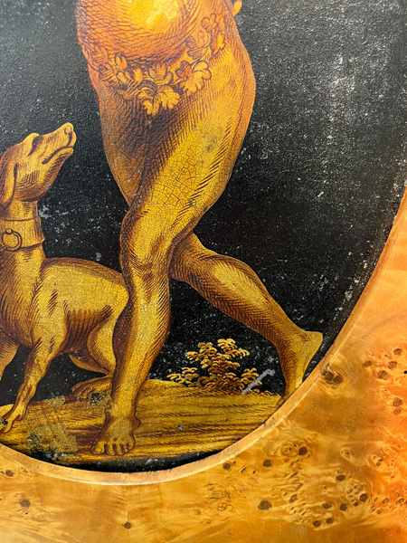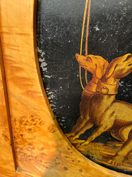 - Katalog-Nr: 299Biedermeier-Standsekretär. Weimar 1810-15. Vogelaugenahorn furniert, teilw. ebonisiert und bemalt mit Blättern, mythologischen Motiven - wohl Hirtenszenen mit Raja, Rauta und Paika - und Rocaillen; getreppter Sockel und Gesims, teilw. mit Zahnschnitt, zwei Schübe, darüber Schreibklappe mit aufwendigem Innenleben, zurückgesetzter, eintüriger, verkröpfter Aufsatz, H=188 cm, B=94 cm, T=49,5 cm. (alte Patina)o.L.