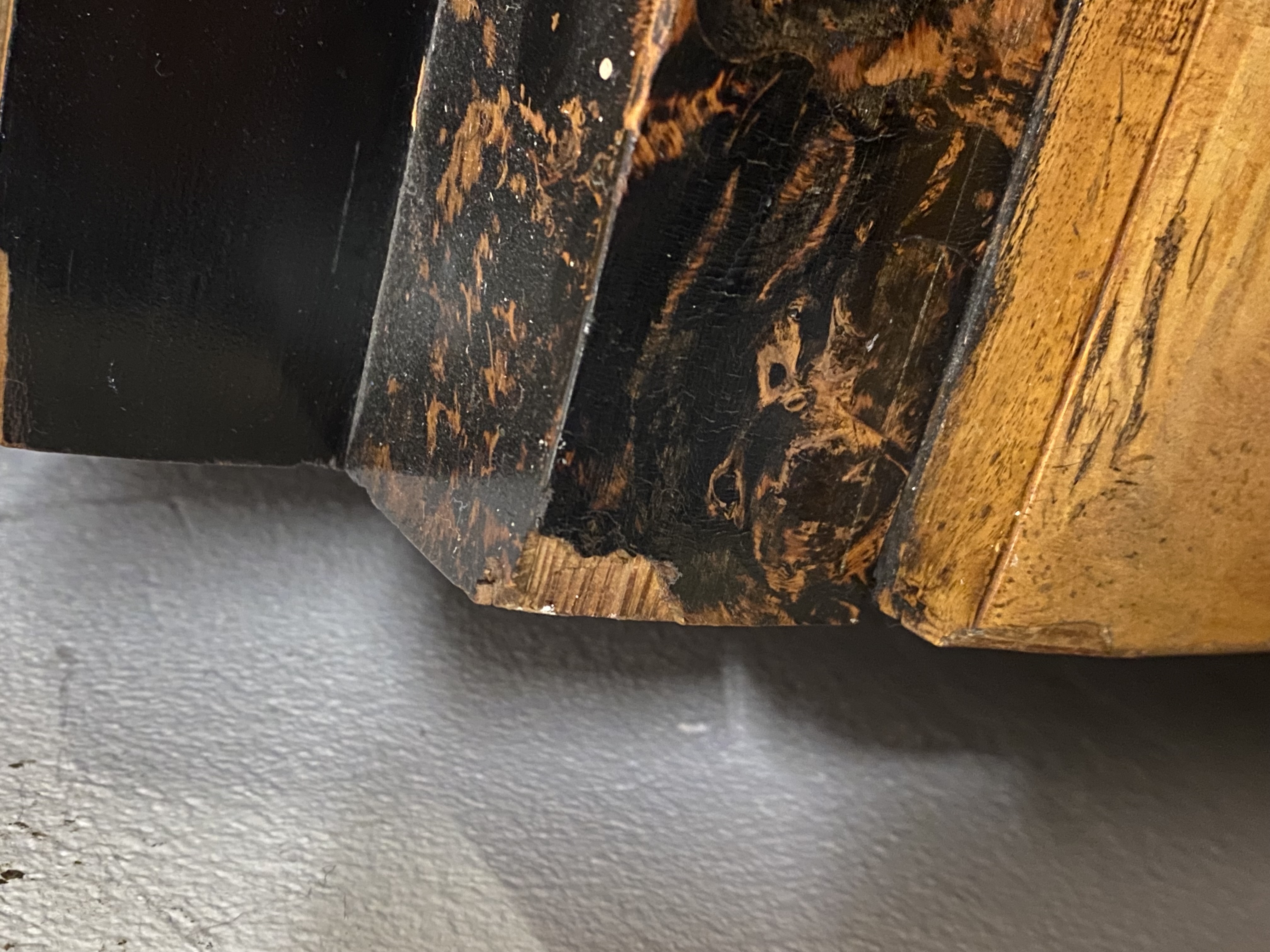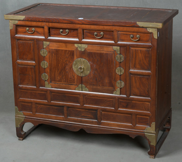 - Katalog-Nr: 288Kommode. Asien. Massivholz, teilw. in Füllung gearbeitet, mit Metallbeschlägen; leicht gebogene Füße und Zarge, eintürig mit vier Schüben und zwei Türen, überstehende Platte, H=86,5 cm, B=101 cm, T=46,5 cm. (besch.)o.L.