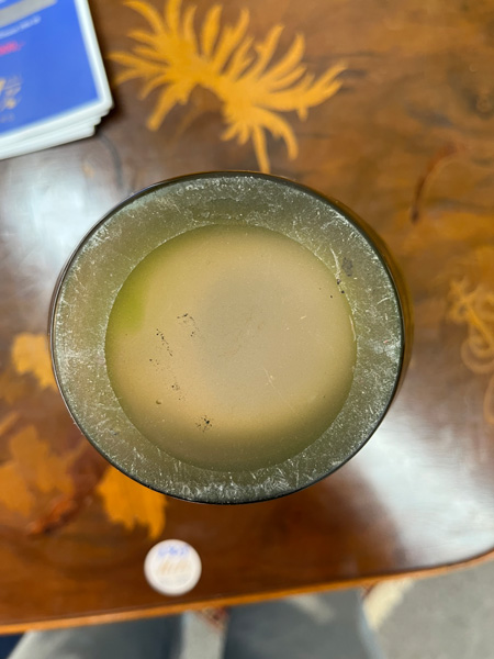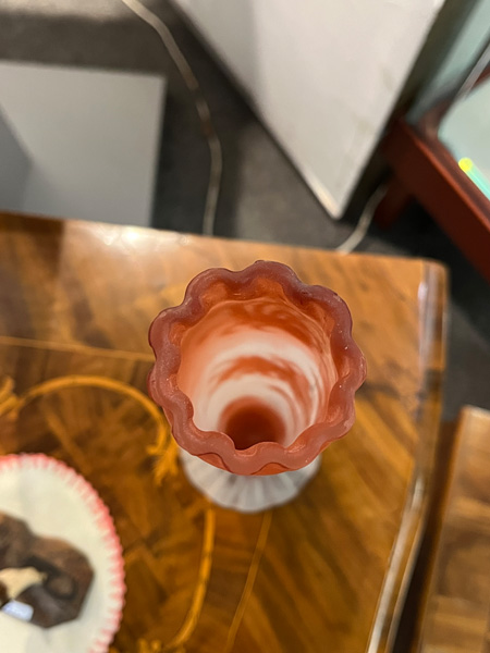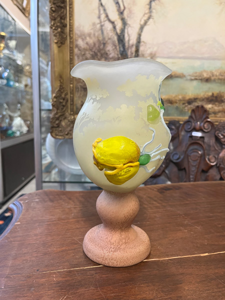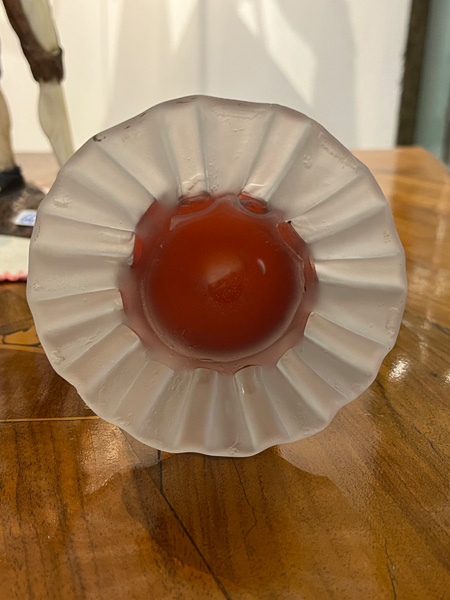 - Katalog-Nr: 276Vase. China, Tittot. Dickwandiges Glas mit erhabenen Eichhörnchen- und Kirschblütendekor, rückseitig gravierte chinesische Schriftzeichen, H=9,2 cm.o.L.