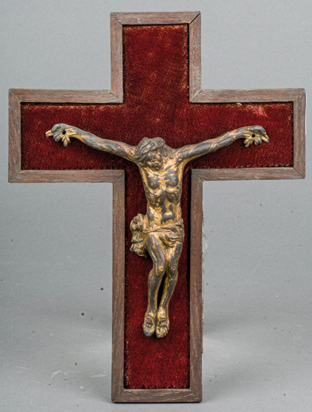 - Katalog-Nr: 278Deutscher Bildgießer des 16. Jhs. Kruzifixus. Bronze, teilweise mit alter Vergoldung. Dazu neuzeitliches Holzkreuz mit rotem Samtbezug, H=13,2 cm, B=13,4 cm / H=23,5 cm, B=17,7 cm.o.L.