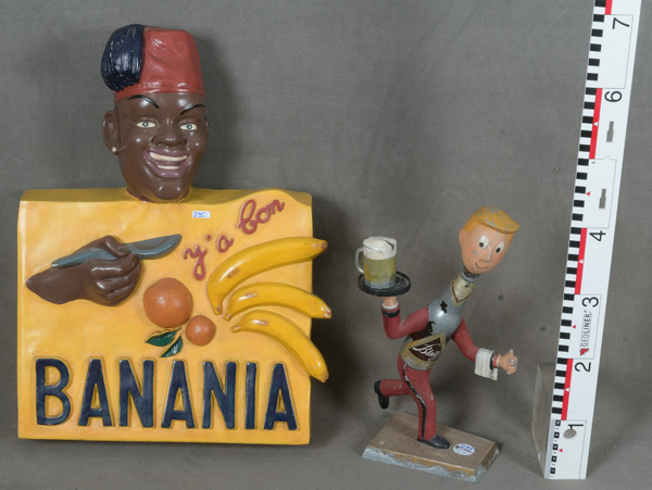 - Katalog-Nr: 295Reklamefigur „Blatz Brewing company“, USA, Metall, bemalt (H=42 cm) / buntes „BANANIA“-Reklameschild, wohl Frankreich, Kunstmasse, H=63 cm, B=43 cm, T=13 cm.o.L.