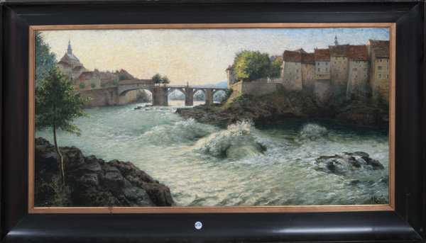 - Katalog-Nr: 297Michael Koch (1853-1927). Reißender Fluss mit Felsen, Gebäuden und Brücke. Öl/Lw., re./u./sign., gerahmt, 80 x 160 cm.o.L.