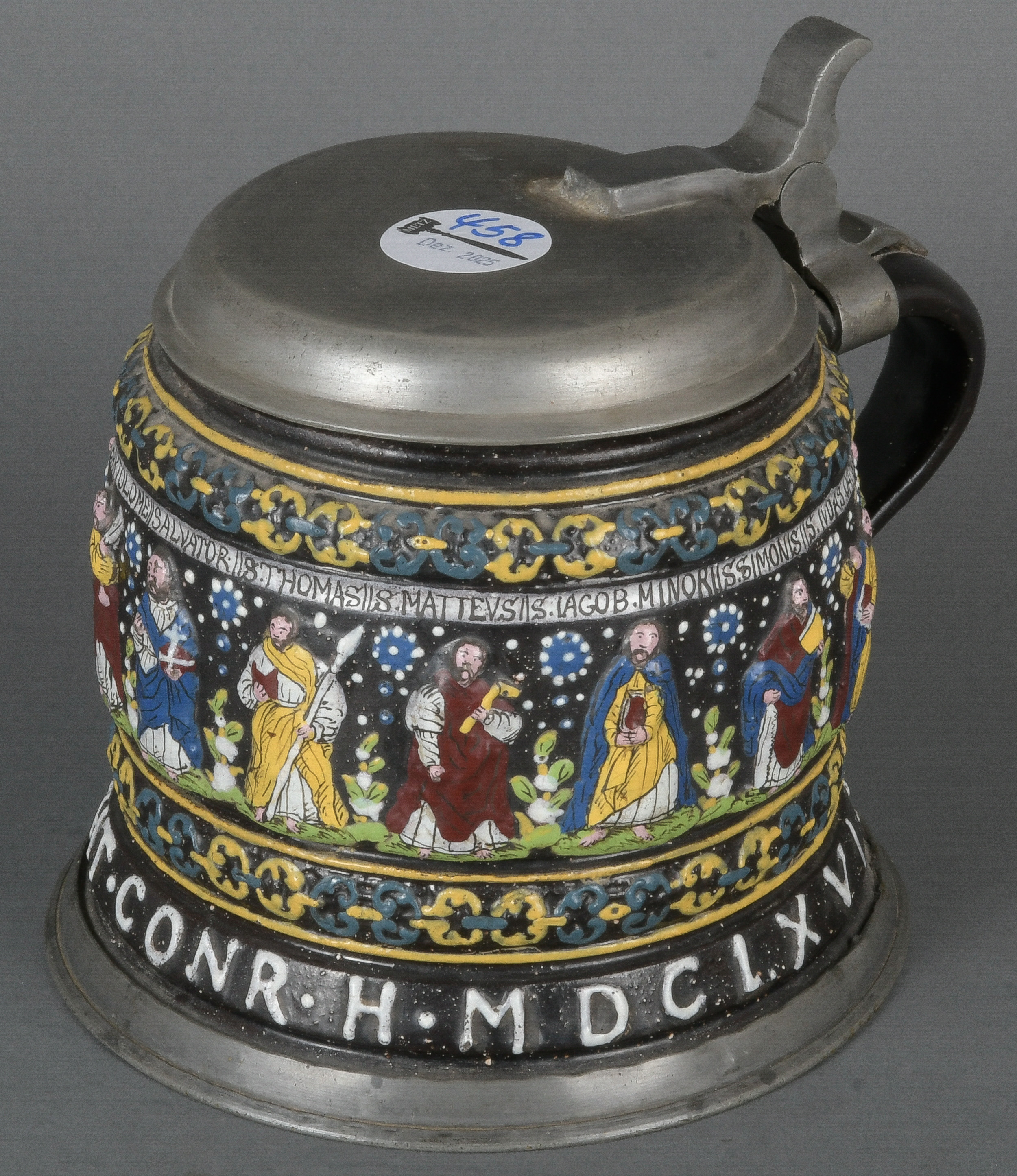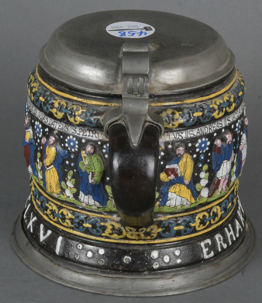 - Katalog-Nr: 458Apostelkrug. Creussen. Steinzeug, umlaufend reliefiert, beschriftet und farbig emailliert, mit Zinnstandring, -montur und -deckel, H=13,7 / 17,2 cm.o.L.