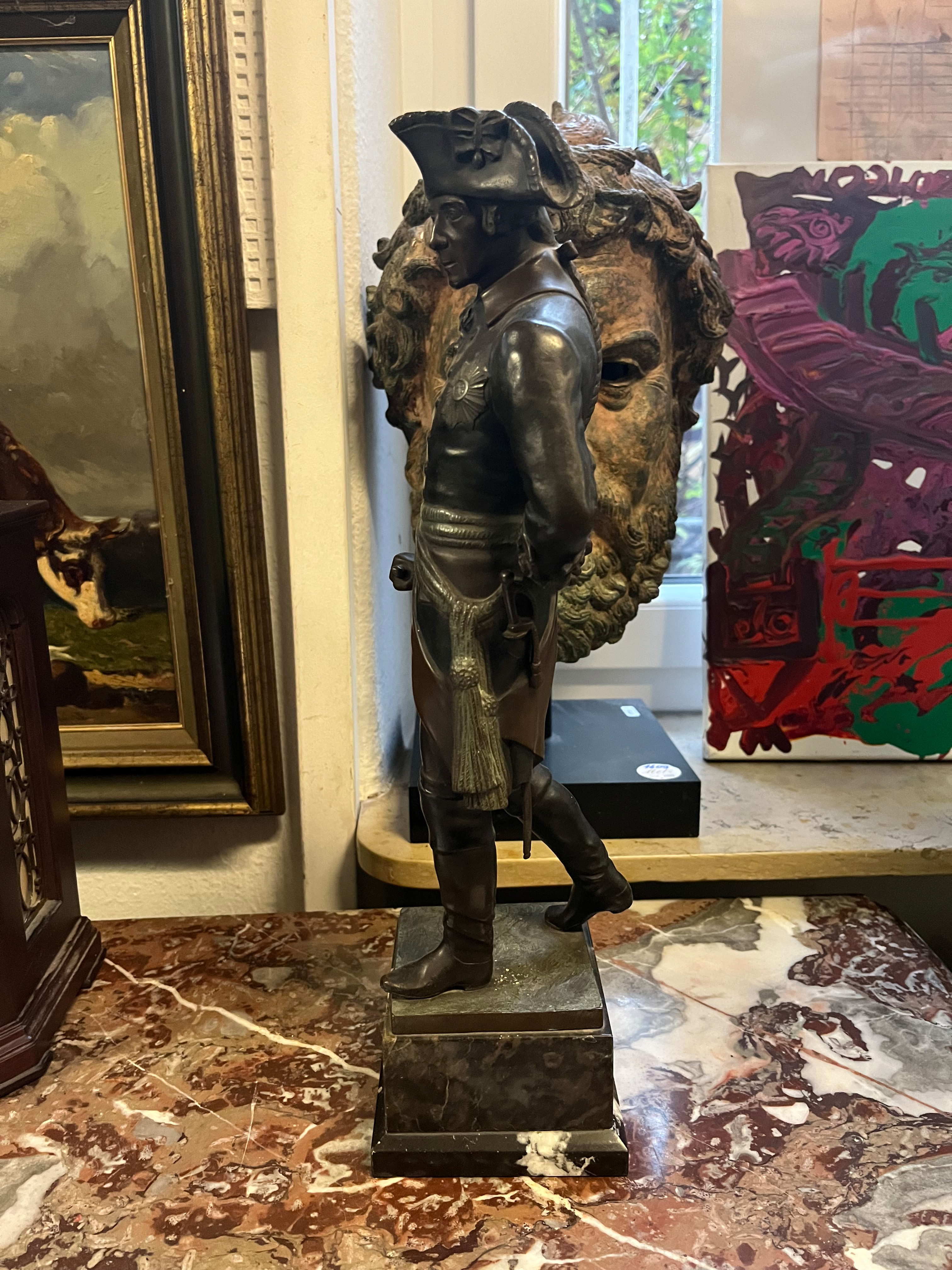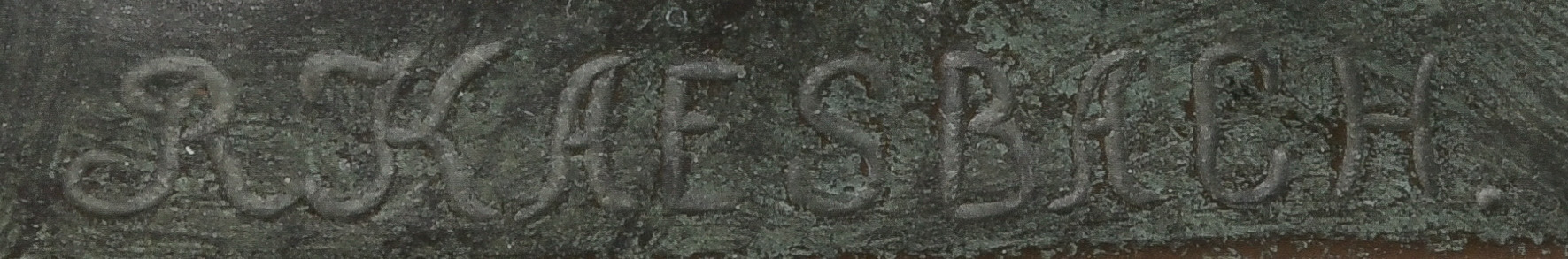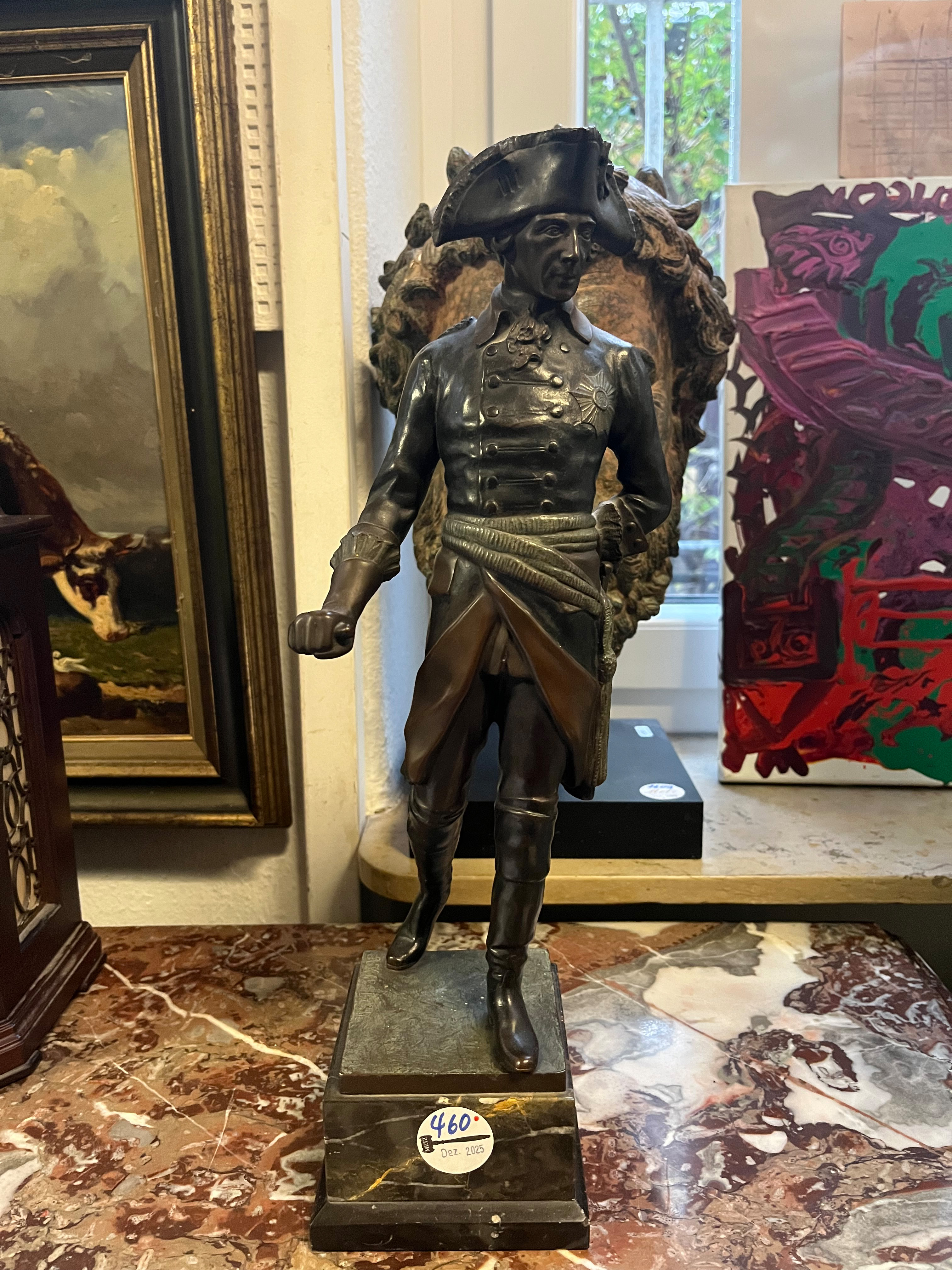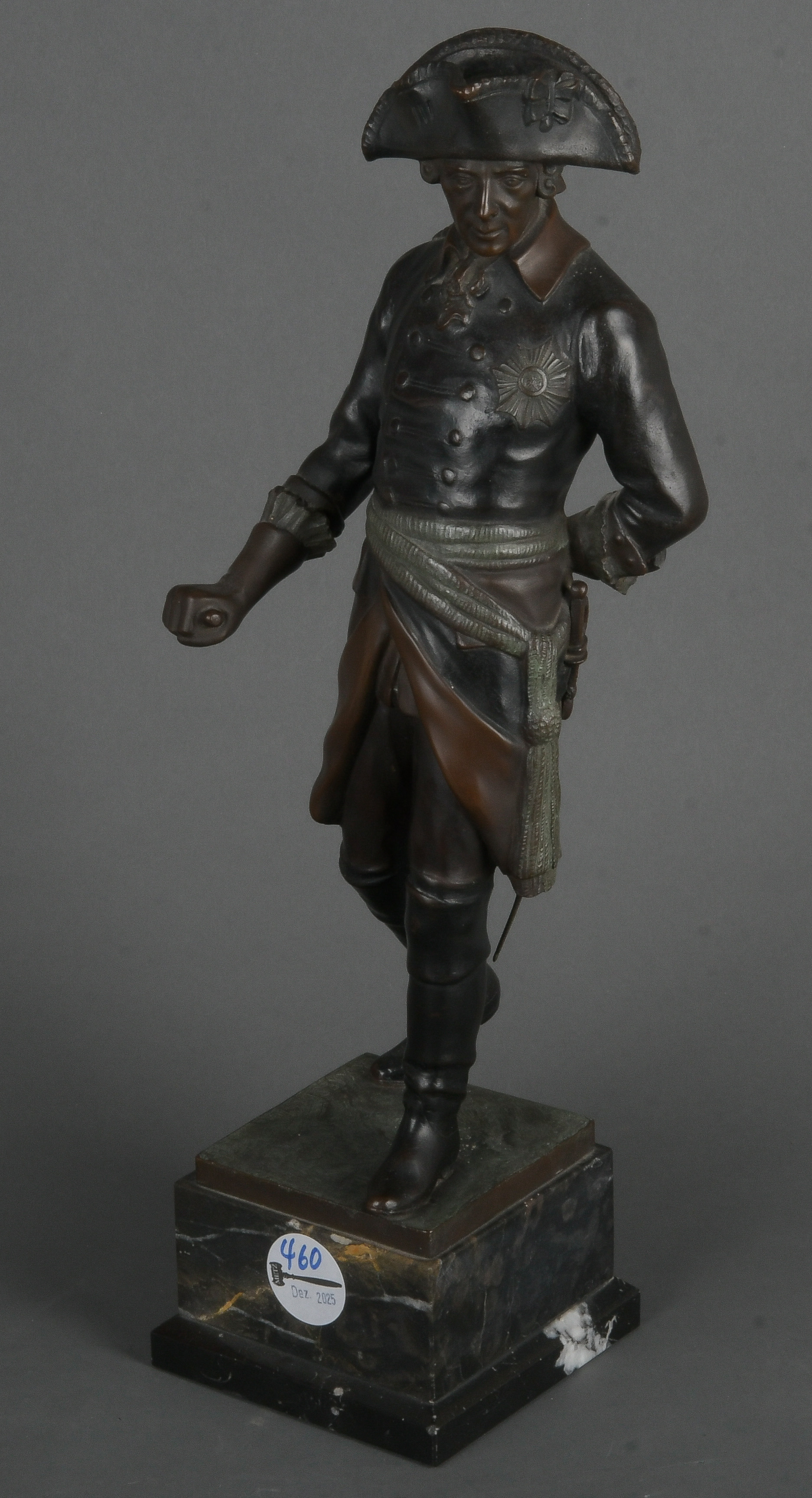 - Katalog-Nr: 460Rudolf Kaesbach (1873-1955). Statue des Alten Fritz. Bronze, brüniert, seitl. sign., auf quadratischem Marmorsockel, H=36,7 / 43,5 cm. (Stock fehlt)o.L.