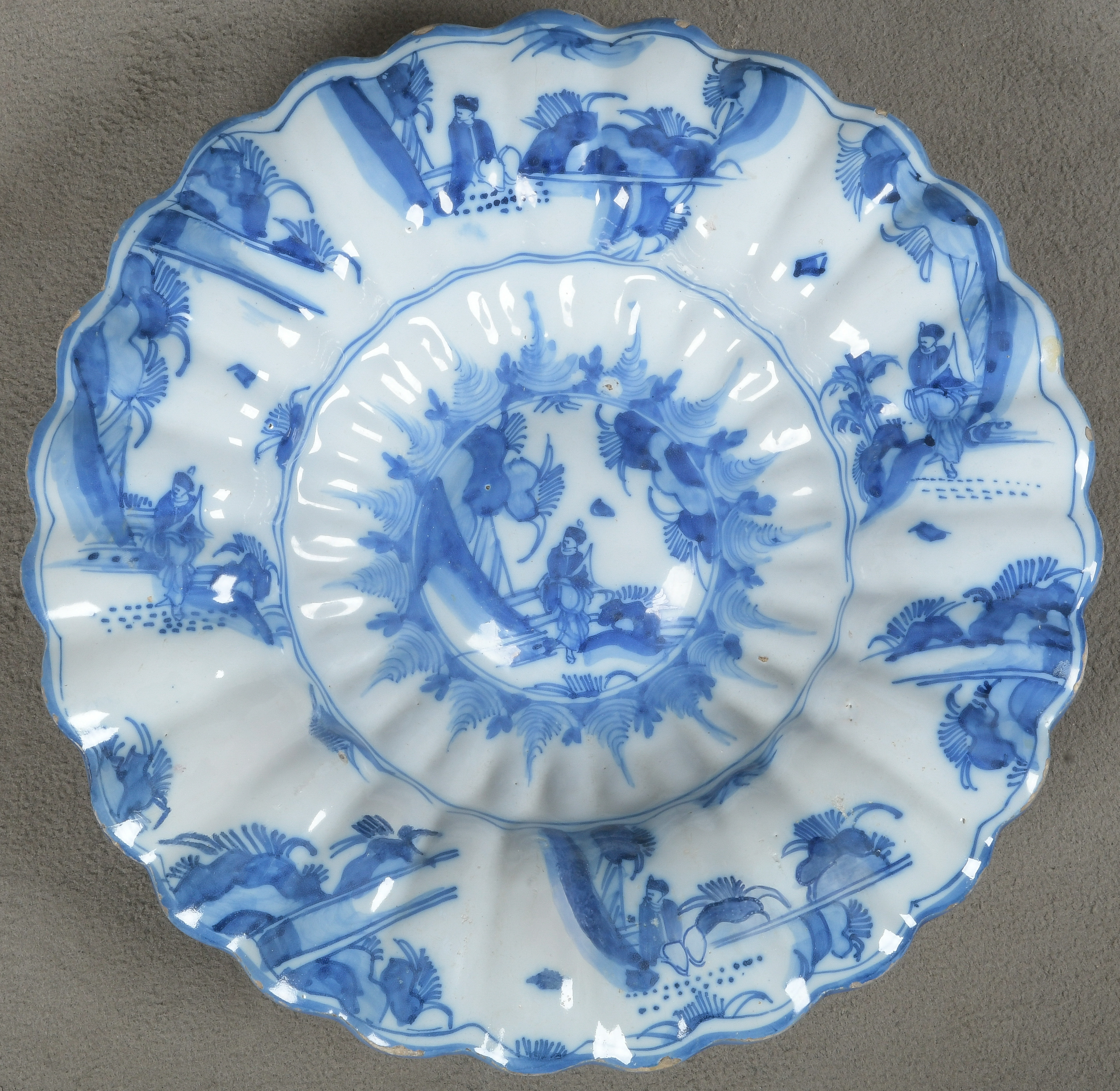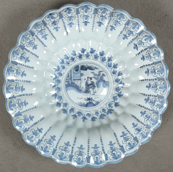 - Katalog-Nr: 464Fächerplatte. Frankfurt um 1700. Fayence, unterglasurblau bemalt mit Chinoiserie, verso Ziffer „18“, D=34 cm. Provenienz: Sammlung Bruno Sandner, Hofheim.o.L.