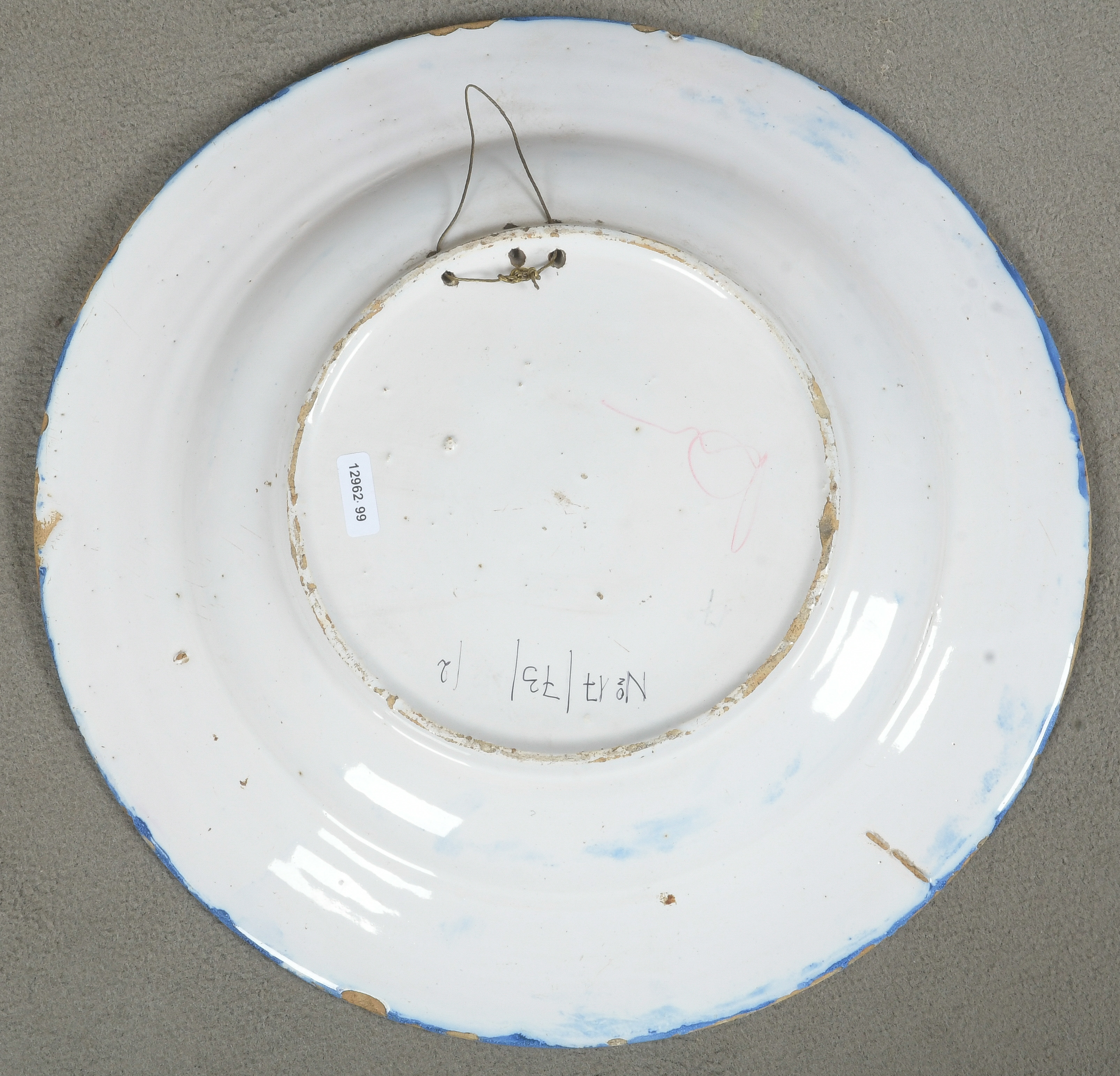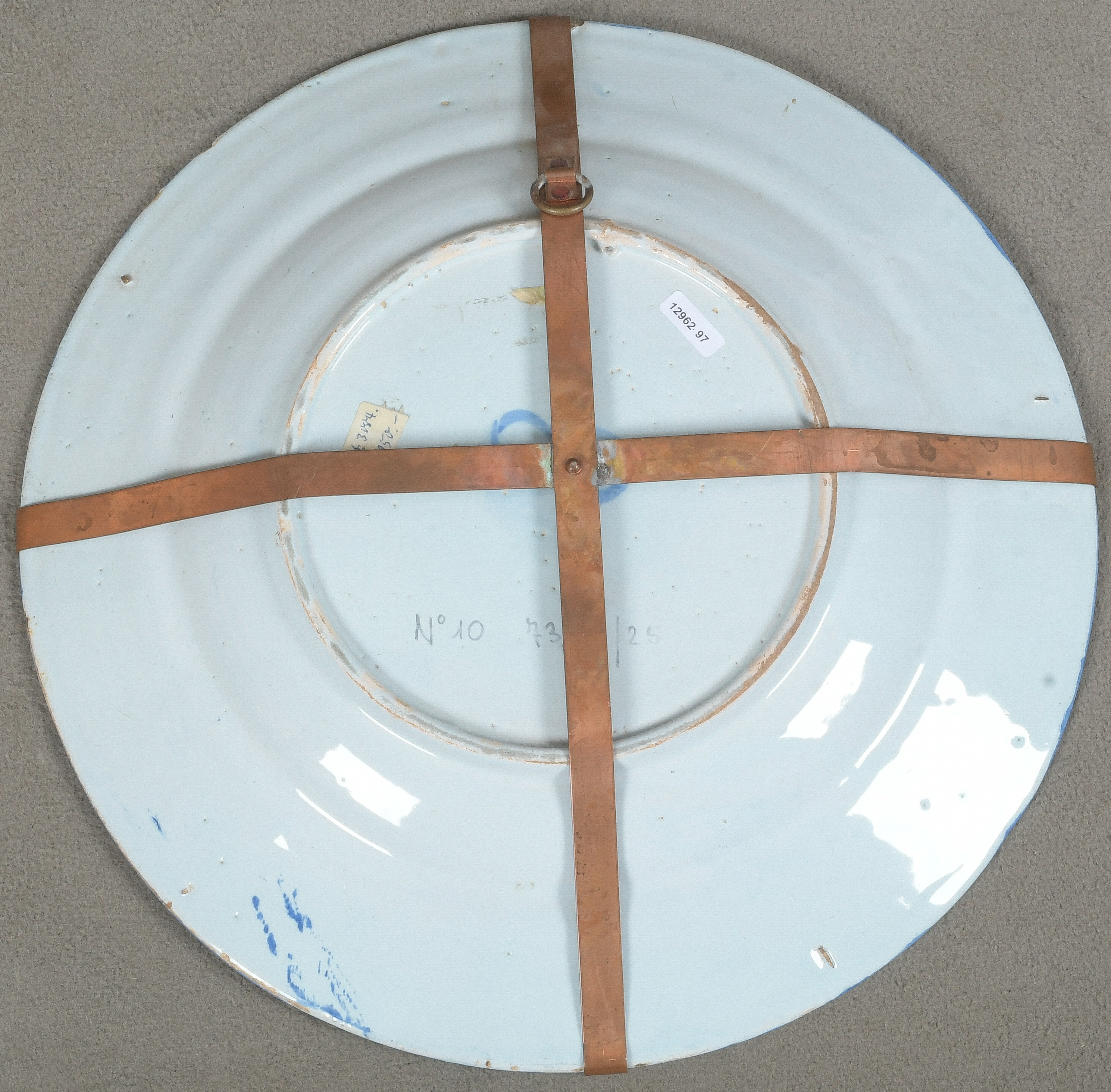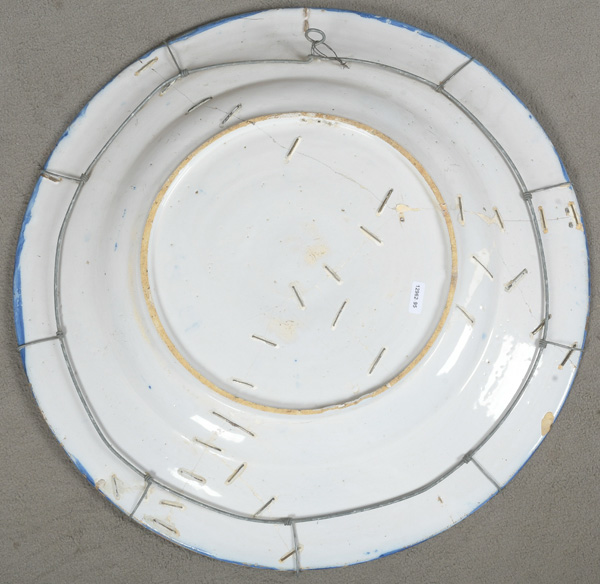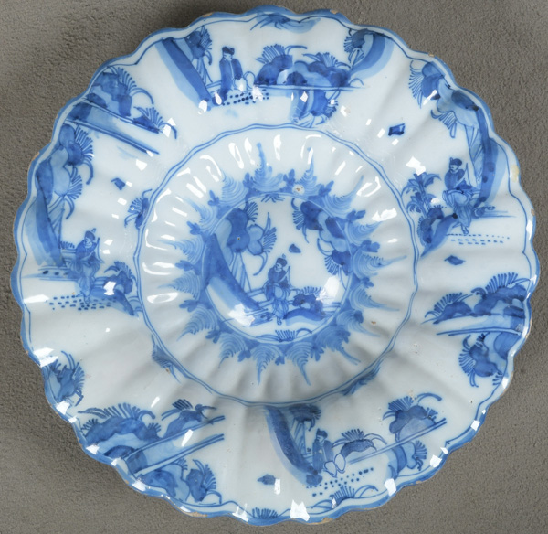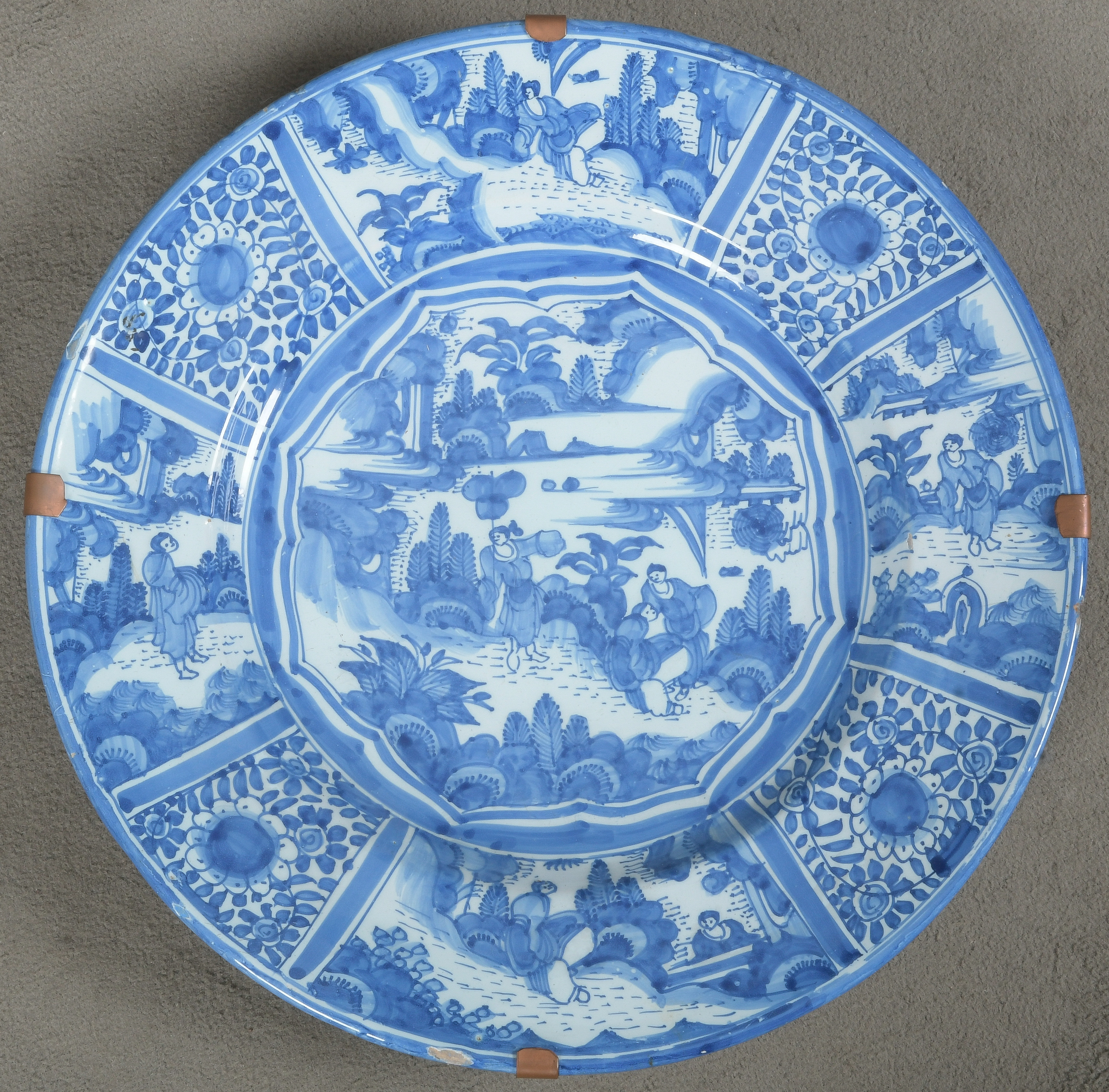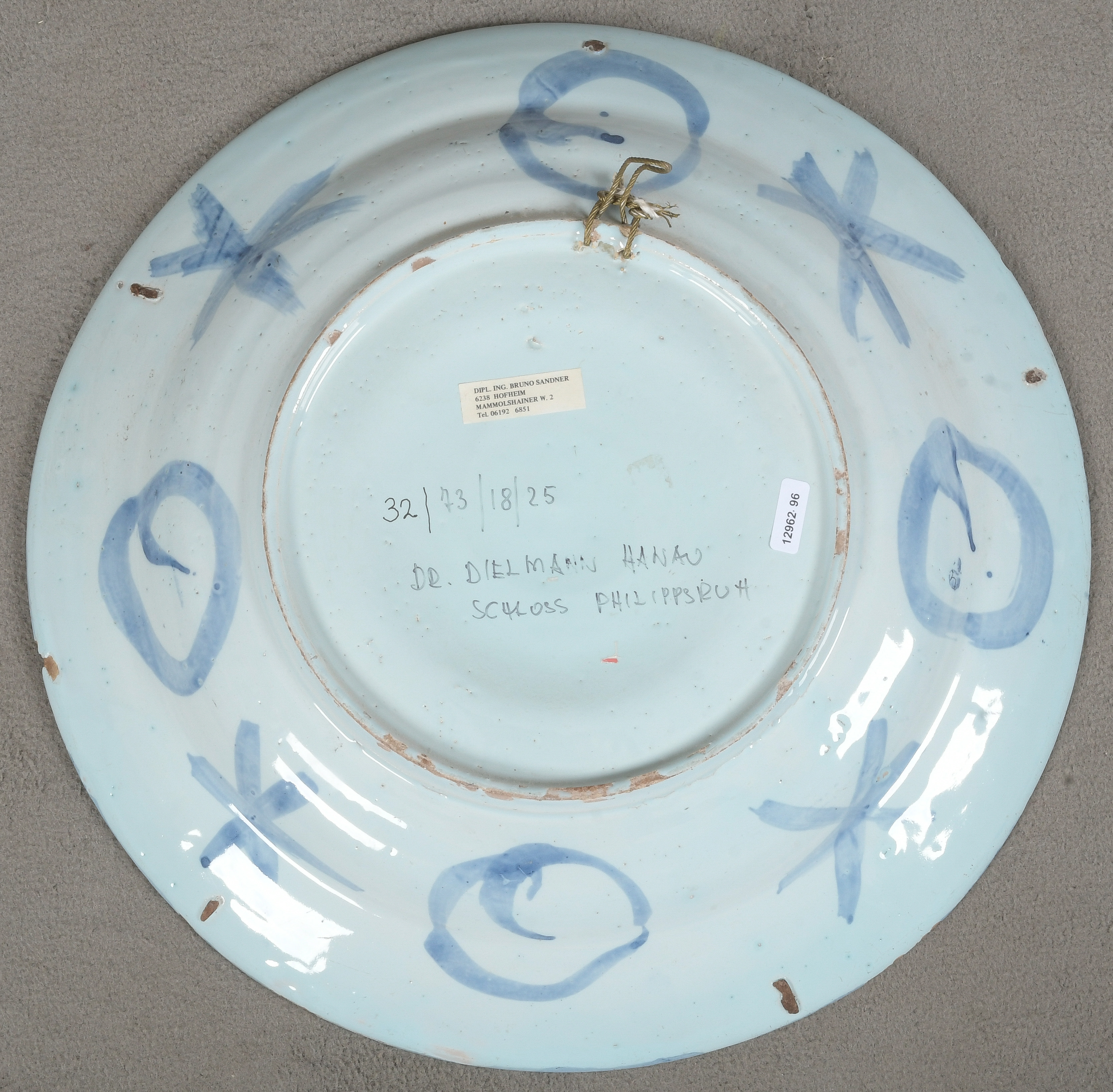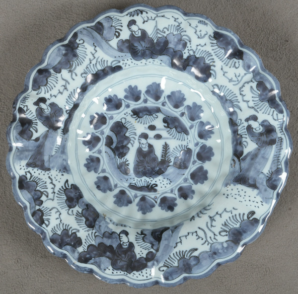 - Katalog-Nr: 465Fächerplatte. Frankfurt um 1700. Fayence, unterglasurblau bemalt mit Chinoiserien, ohne Marke, D=34,5 cm. Provenienz: Sammlung Bruno Sandner, Hofheim. (Standring best.)o.L.