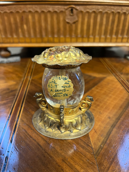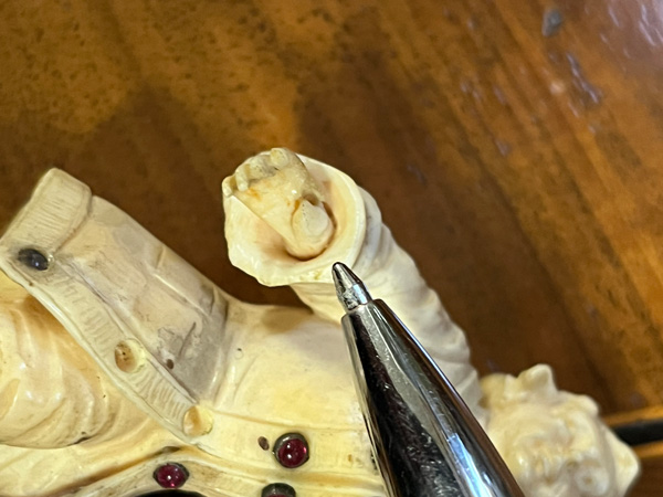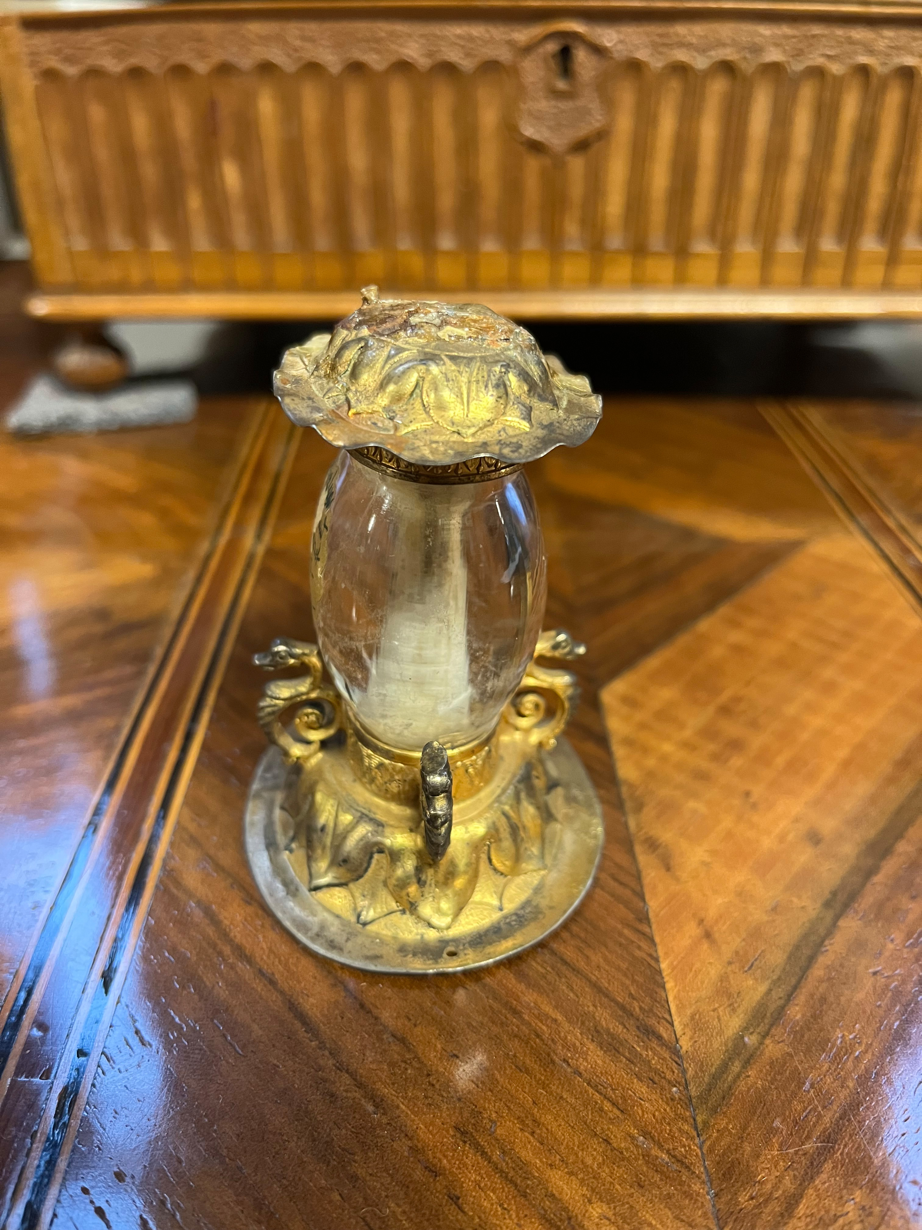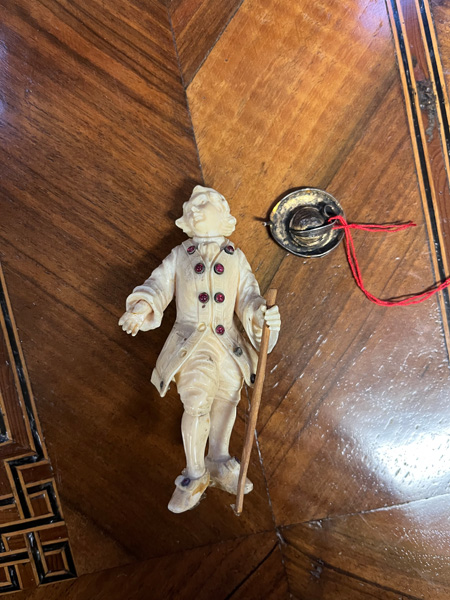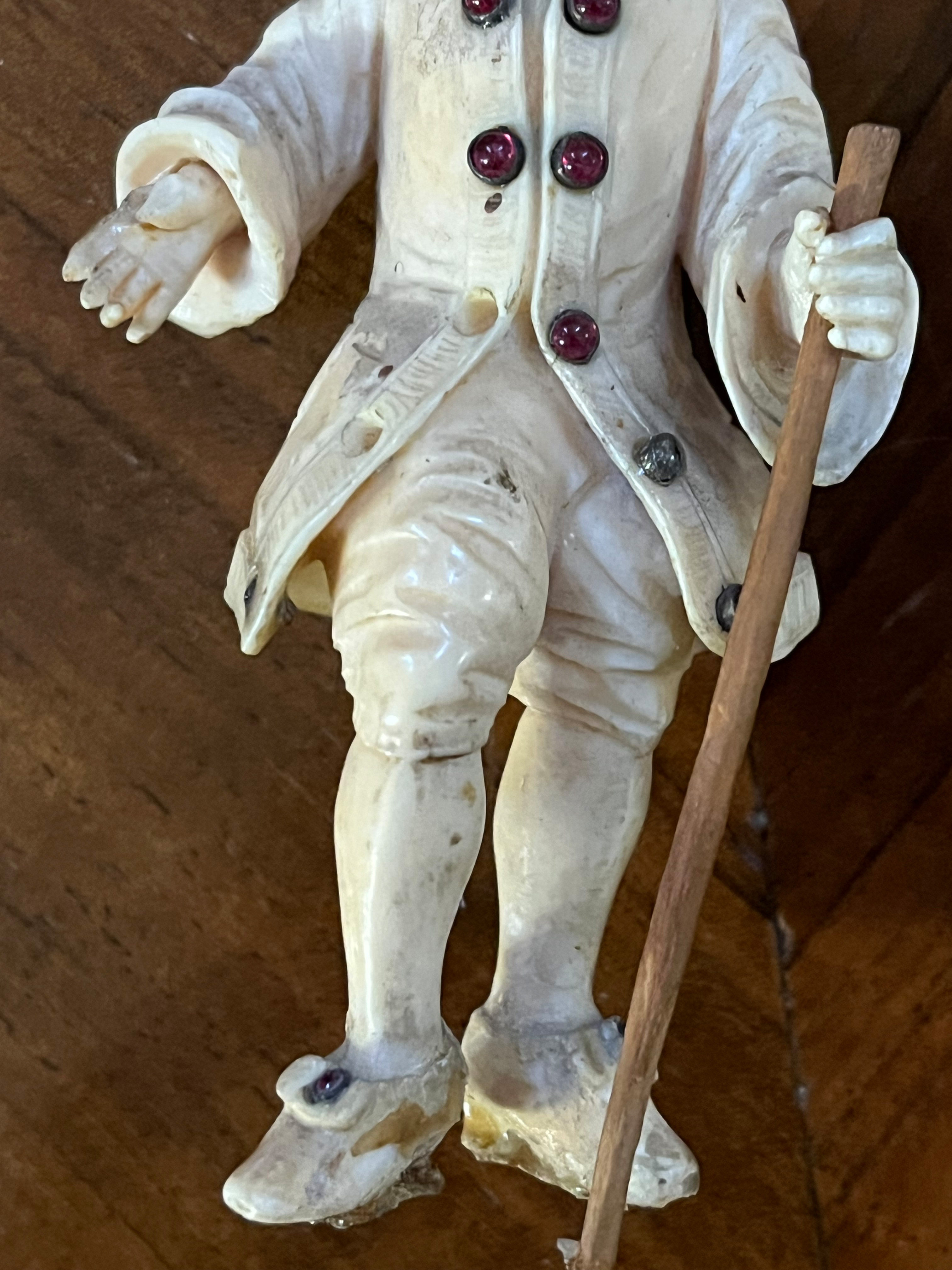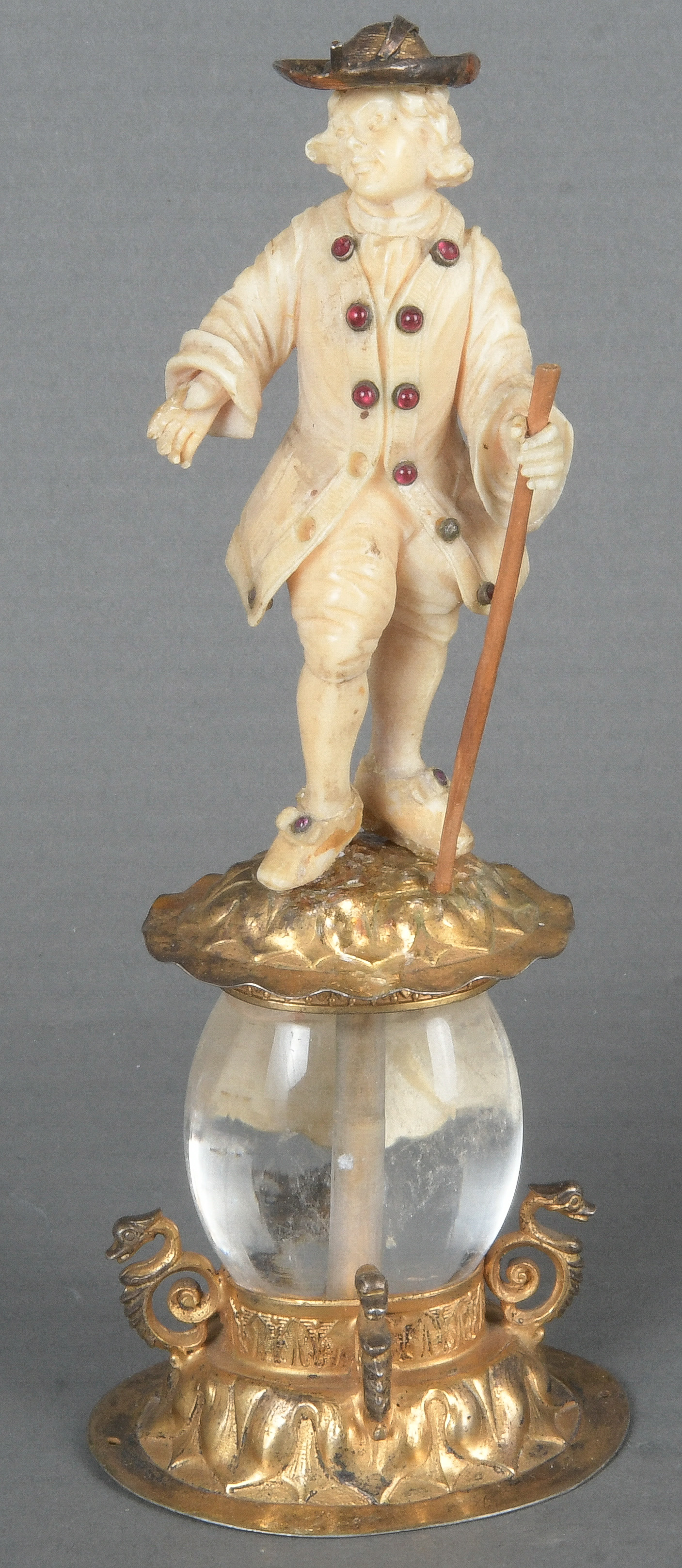 - Katalog-Nr: 473Johann Melchior Dinglinger (Biberach 1664 - 1731 Dresden) attrib. Stehender Edelmann mit Stock und Hut. Elfenbein, geschnitzt, montiert auf ovalen Bergkristall mit vergoldetem Silberstandfuß und -standfläche, H=9 cm. Elfenbein-Gutachten und EU-Verkaufsgenehmigung liegen vor und können für EUR 150,00 erworben werden. This item is illegal to sell to the U.K.o.L.