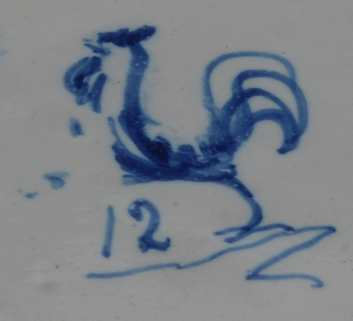 - Katalog-Nr: 466Buckelplatte. Frankfurt um 1700. Fayence, unterglasurblau bemalt mit Chinoiserien, verso gemarkt, D=35 cm. Provenienz: Sammlung Bruno Sandner, Hofheim.o.L.