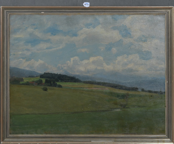- Katalog-Nr: 452Hermann Eichfeld (1845-1917). Wiesenlandschaft mit Gebirgszug im Hintergrund. Öl/Lw., re./u./sign., gerahmt, 76 x 97 cm.o.L.