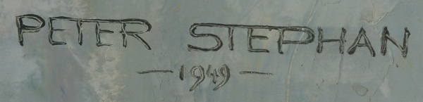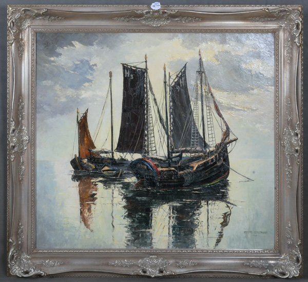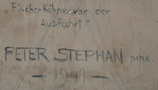 - Katalog-Nr: 454Peter Stephan (1927-2014). „Fischerkähne vor der Ausfahrt“. Öl/Lw., re./u./sign., verso bez./dat. 1949, gerahmt, 90,5 x 100 cm.o.L.