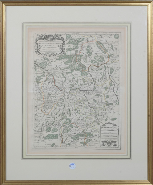 - Katalog-Nr: 455Alexis Hubert Jaillot (1632-1712). Karte von Mainz und Umgebung. Colorierter Kupferstich, re./o./sign./dat. 1694, mit Passepartout hi./Gl. gerahmt, 56 x 42 cm.o.L.