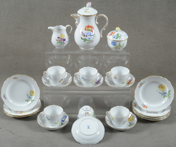 - Katalog-Nr: 45616-tlgs. Mokkaservice. Meissen 20. Jh. Porzellan, bunt bemalt mit Floraldekor; am Boden unterglasurblaue Schwertermarke. Bestehend aus: Eine Mokkakanne (H=16,5 cm), ein Milchgießer (H=8 cm), eine Zuckerdose (H=8,5 cm), sechs Mokkatassen mit Unterschalen und sieben Gebäckteller (D=14 cm).o.L.