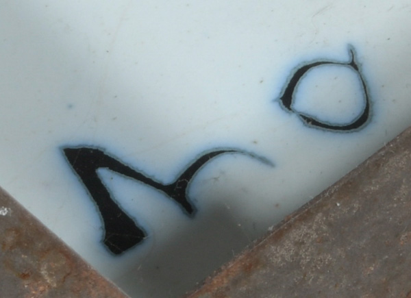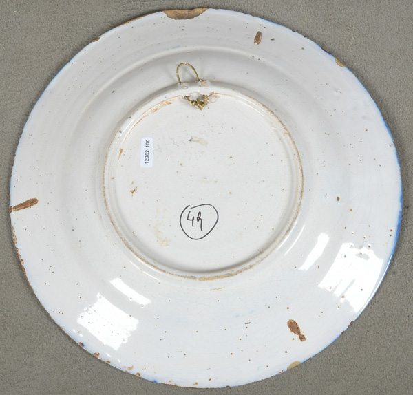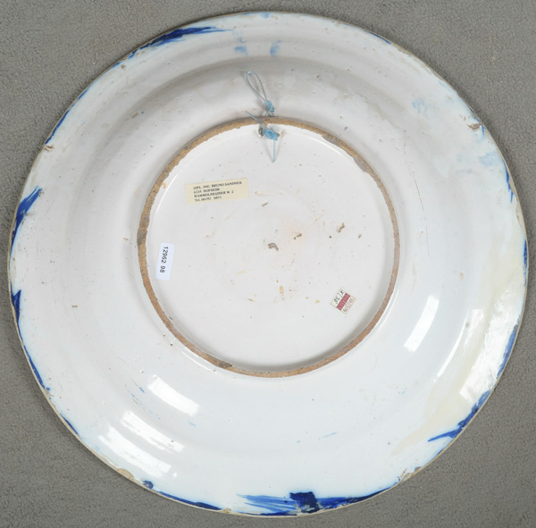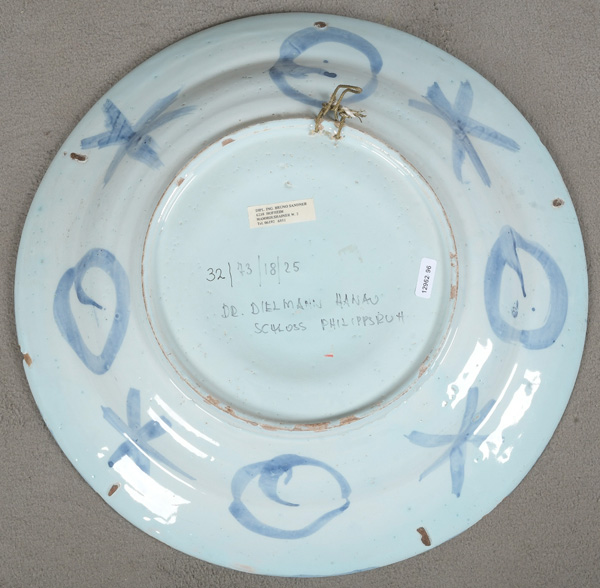 - Katalog-Nr: 471Runde Platte. Frankfurt um 1700. Fayence, unterglasurblau bemalt mit Chinoiserien, verso gemarkt, D=38 cm. Provenienz: Sammlung Bruno Sandner, Hofheim.o.L.