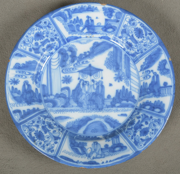 - Katalog-Nr: 467Runde Platte. Frankfurt um 1700. Fayence, unterglasurblau bemalt mit Chinoiserien, ohne Marke, D=32 cm. Provenienz: Sammlung Bruno Sandner, Hofheim.o.L.