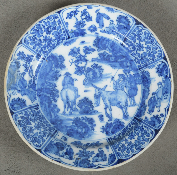 - Katalog-Nr: 470Runde Platte. Frankfurt um 1700. Fayence, unterglasurblau bemalt mit Chinoiserien und Eseln in Landschaft, ohne Marke, D=36,5 cm. Provenienz: Sammlung Bruno Sandner, Hofheim.o.L.