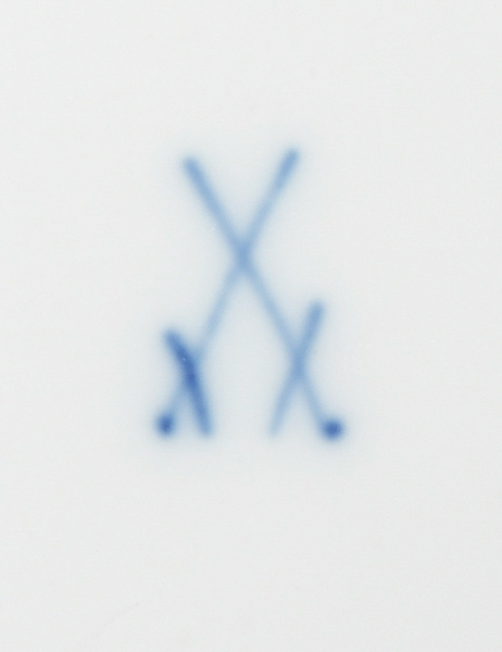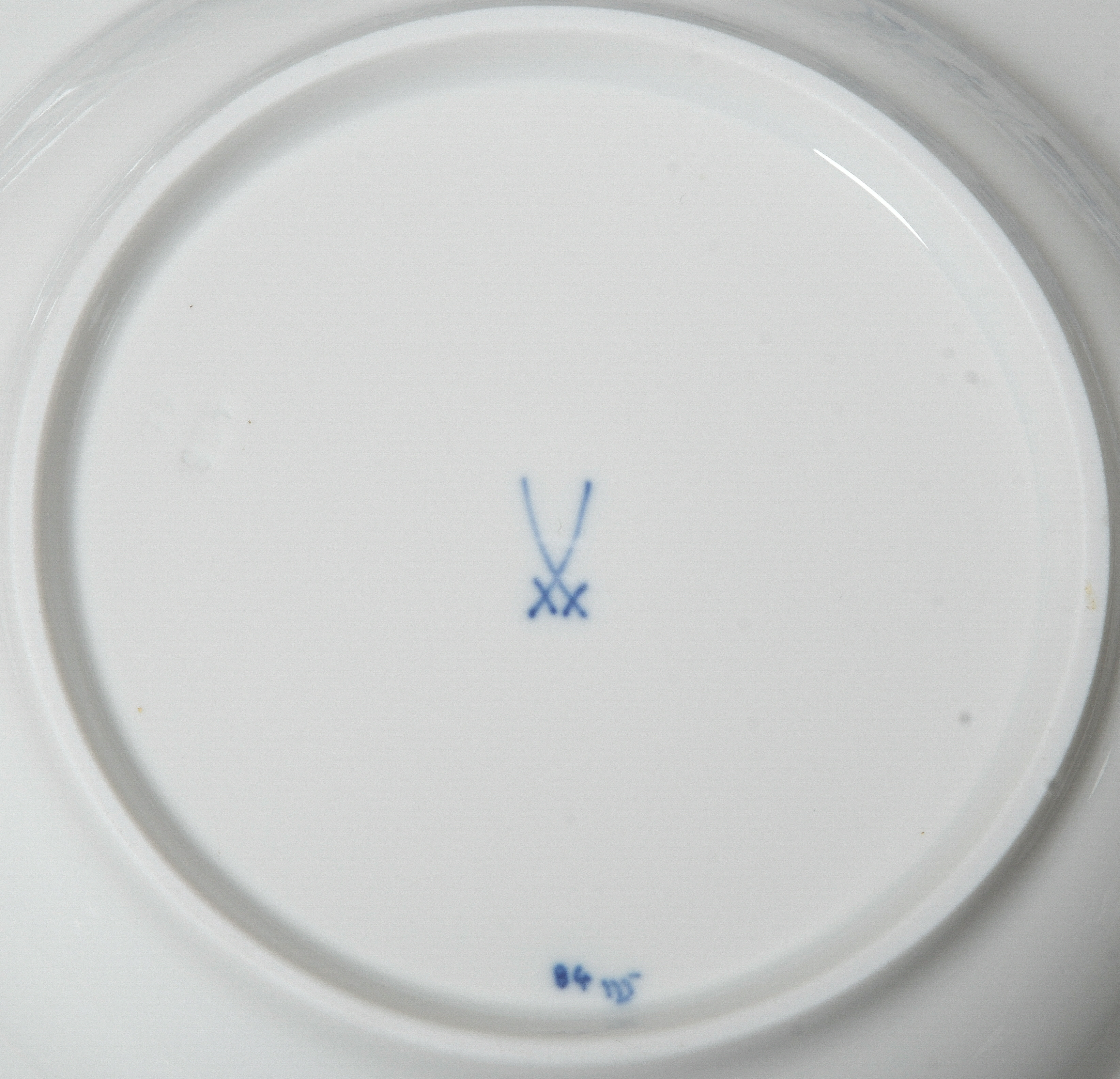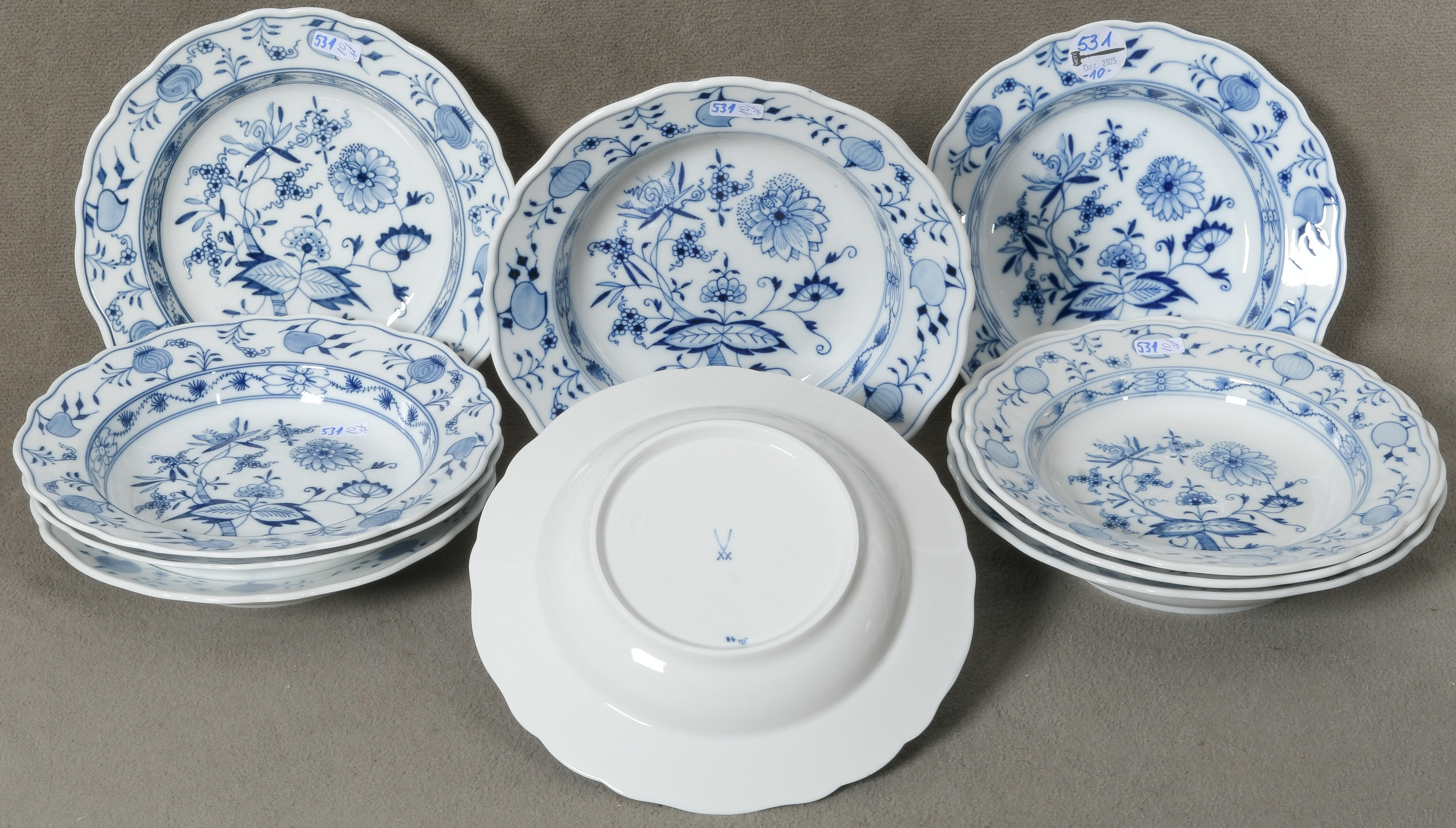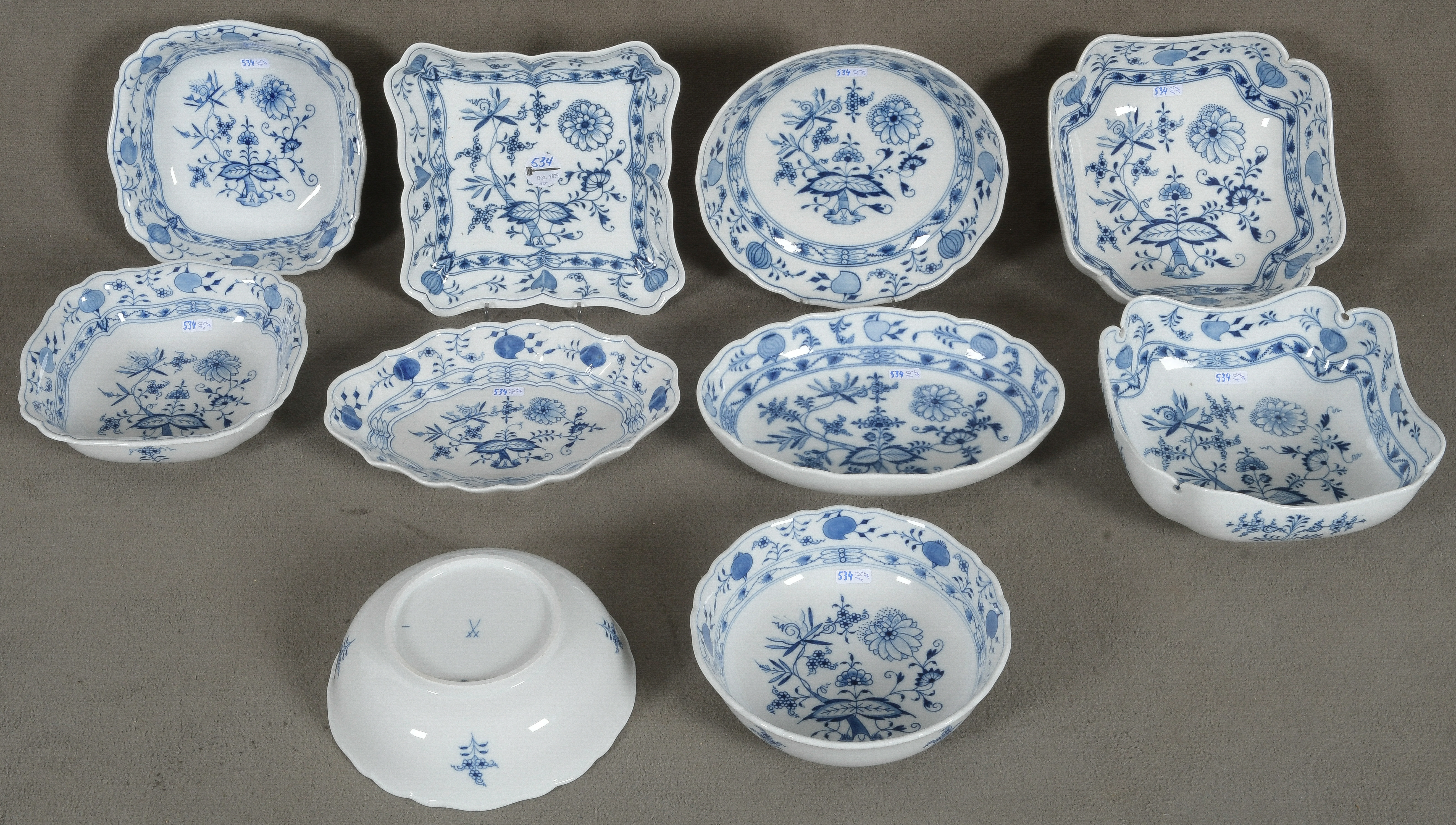 - Katalog-Nr: 534Zehntlgs. Service „Zwiebelmuster“. Meissen 19./20. Jh. Porzellan, unterglasurblau bemalt; am Boden unterglasurblaue Schwertermarke, teilw. mit zwei Schleifstrichen. Bestehend aus: Zwei runde Schalen (H=7 cm, D=21 cm), eine runde Schale (H=6 cm, D=25 cm), zwei quadratische Schalen (H=7 cm, B=22 cm), zwei quadratische Schalen (H=10 cm, B=22 cm), eine quadratische Schale (H=5 cm, B=24 cm), zwei ovale Schalen (H=4,5 cm, B=27 cm, T=19 cm / H=5 cm, B=28 cm, T=20 cm).o.L.