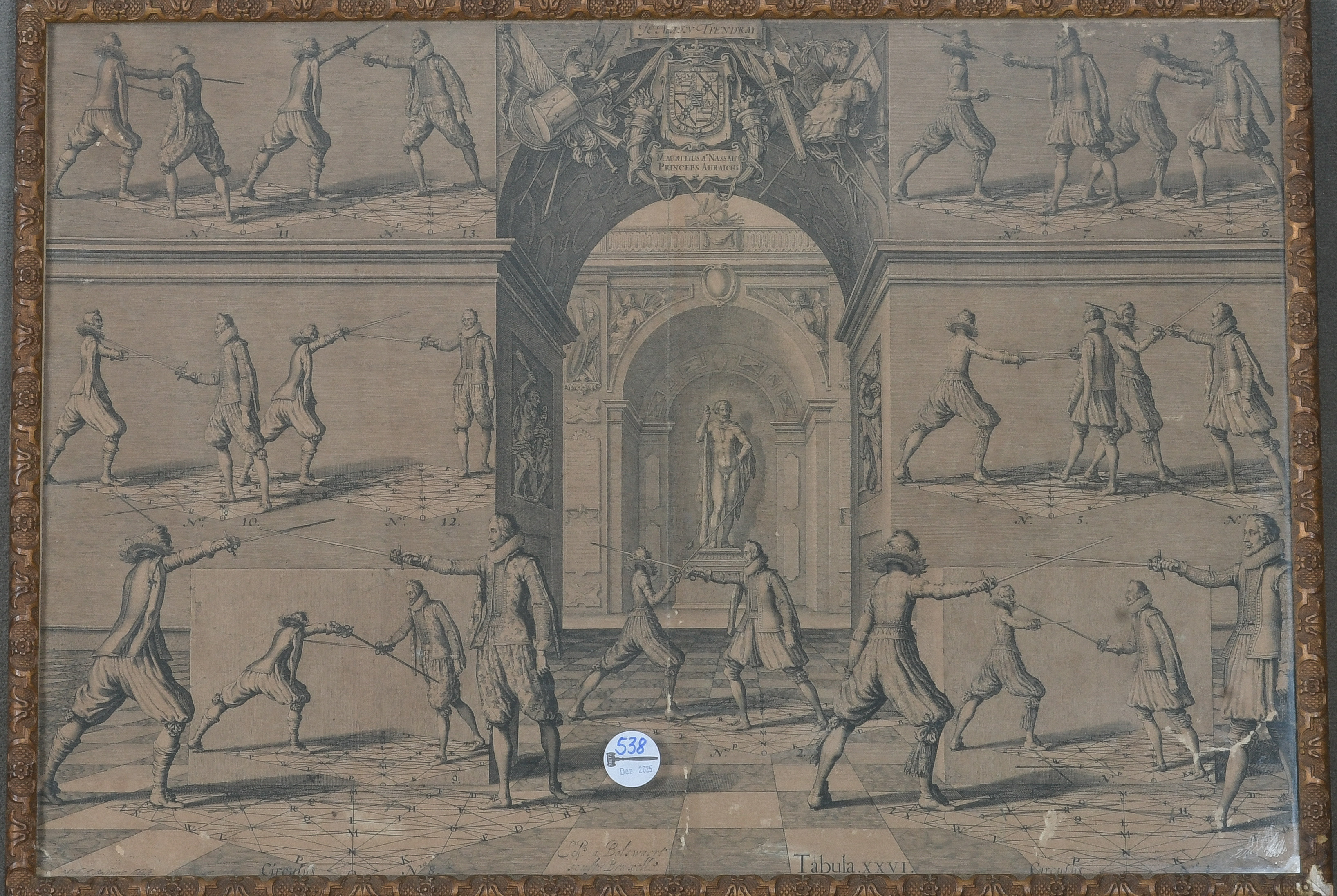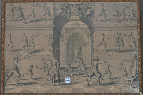 - Katalog-Nr: 539Crispiaen van den Broeck (ca. 1524/30-1590/91). Fechtunterricht. Kupferstich, li./u./sign., hi./Gl. gerahmt, 49 x 70,5 cm.o.L.
