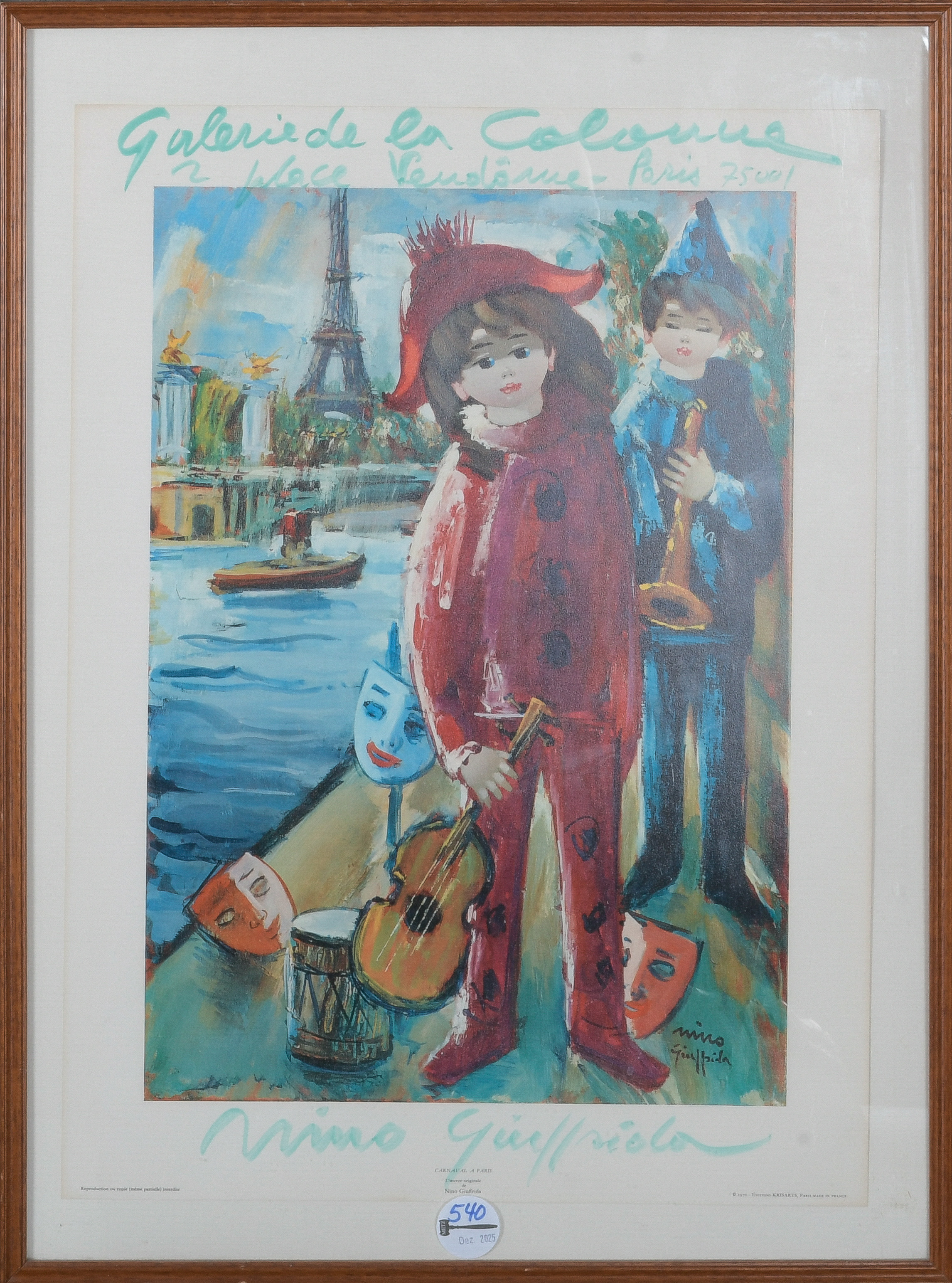 - Katalog-Nr: 540Antonio „Nino“ Giuffrida (1924-2015). Plakat der Galerie de La Colonne, Paris, mit Original-Unterschrift des Künstlers, mit Passepartout hi./Gl. gerahmt, 45 x 31,5 cm.o.L.