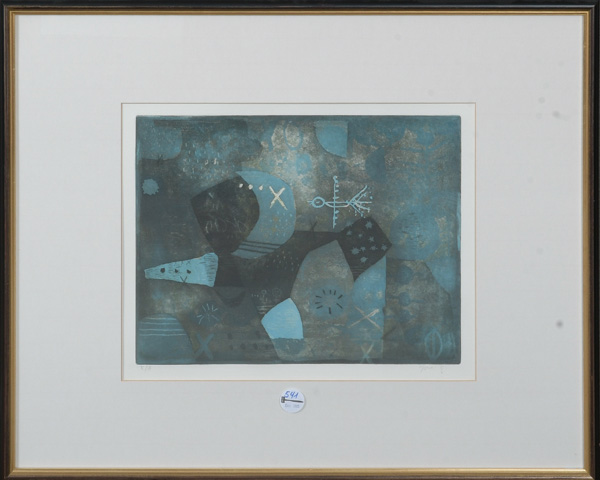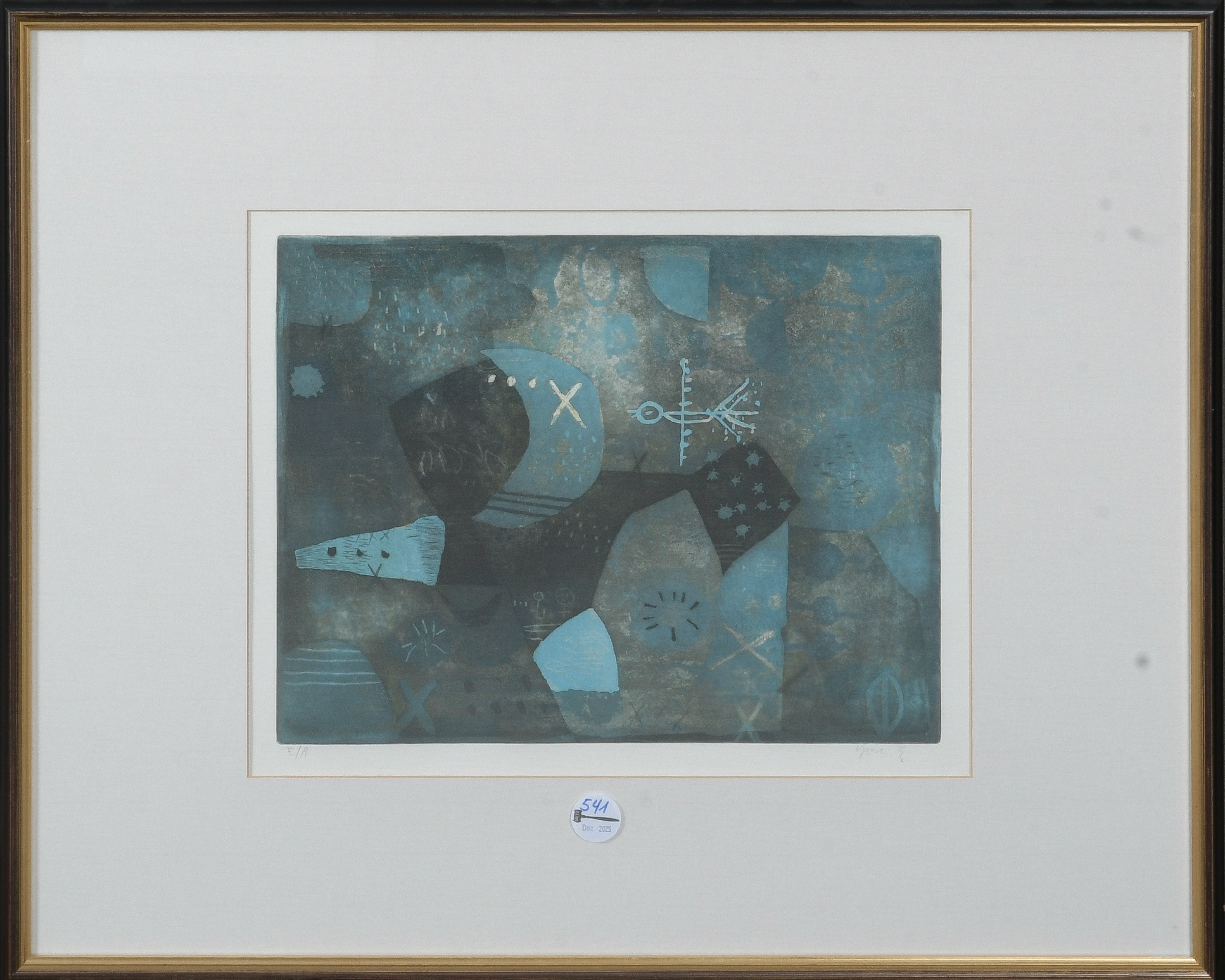 - Katalog-Nr: 541Yoshi Takahashi (1943-1998). Abstrakte Komposition. Farblithographie EA, re./u./sign., mit Passepartout hi./Gl. gerahmt, 32 x 41 cm.o.L.