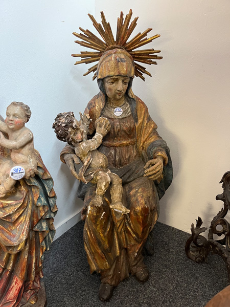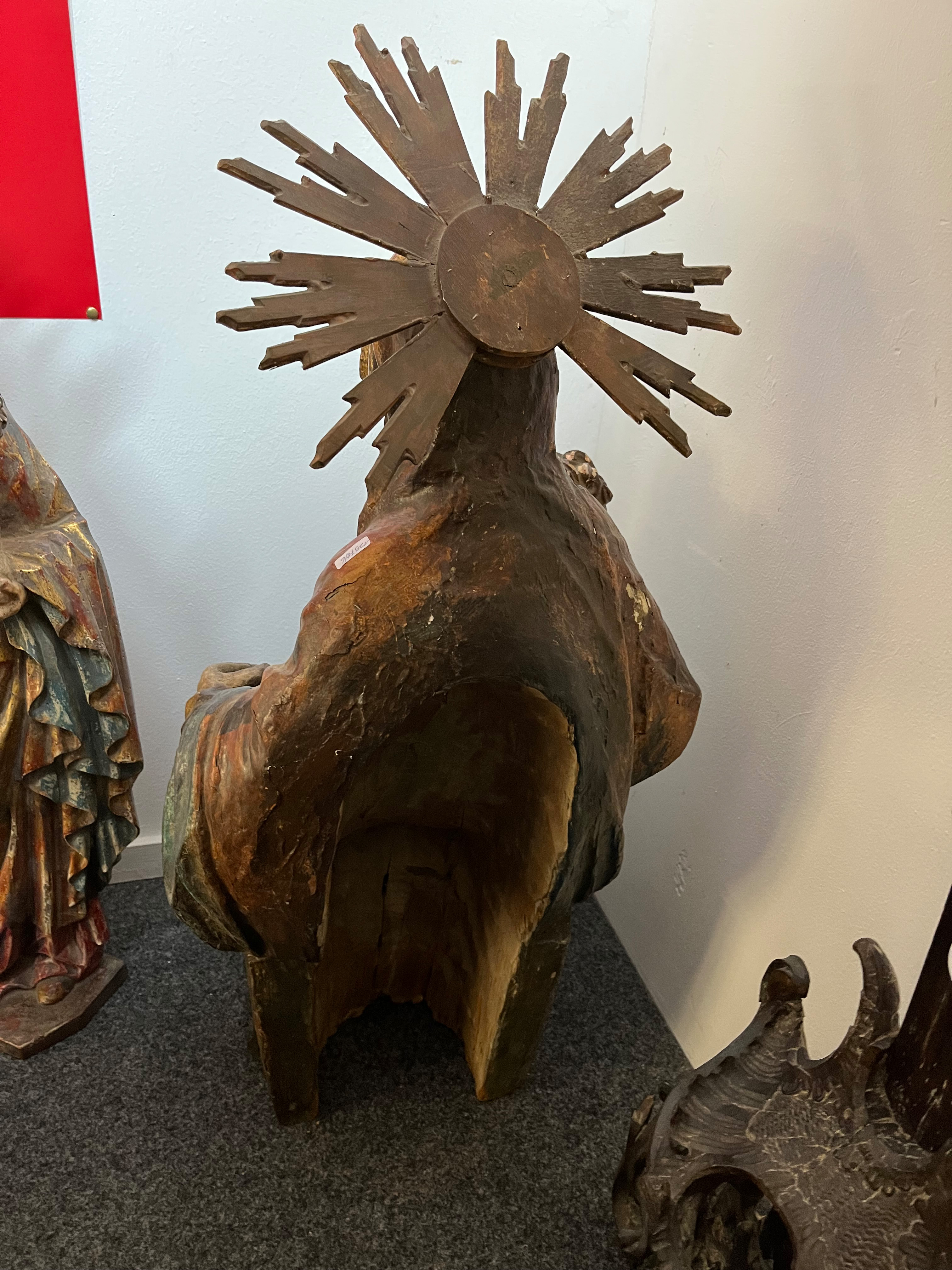 - Katalog-Nr: 542Strahlenkranzmadonna. Deutsch 18./19. Jh. Massivholz, geschnitzt, auf Kreidegrund gefasst mit Resten alter Vergoldung, H=87 cm. (besch.)o.L.