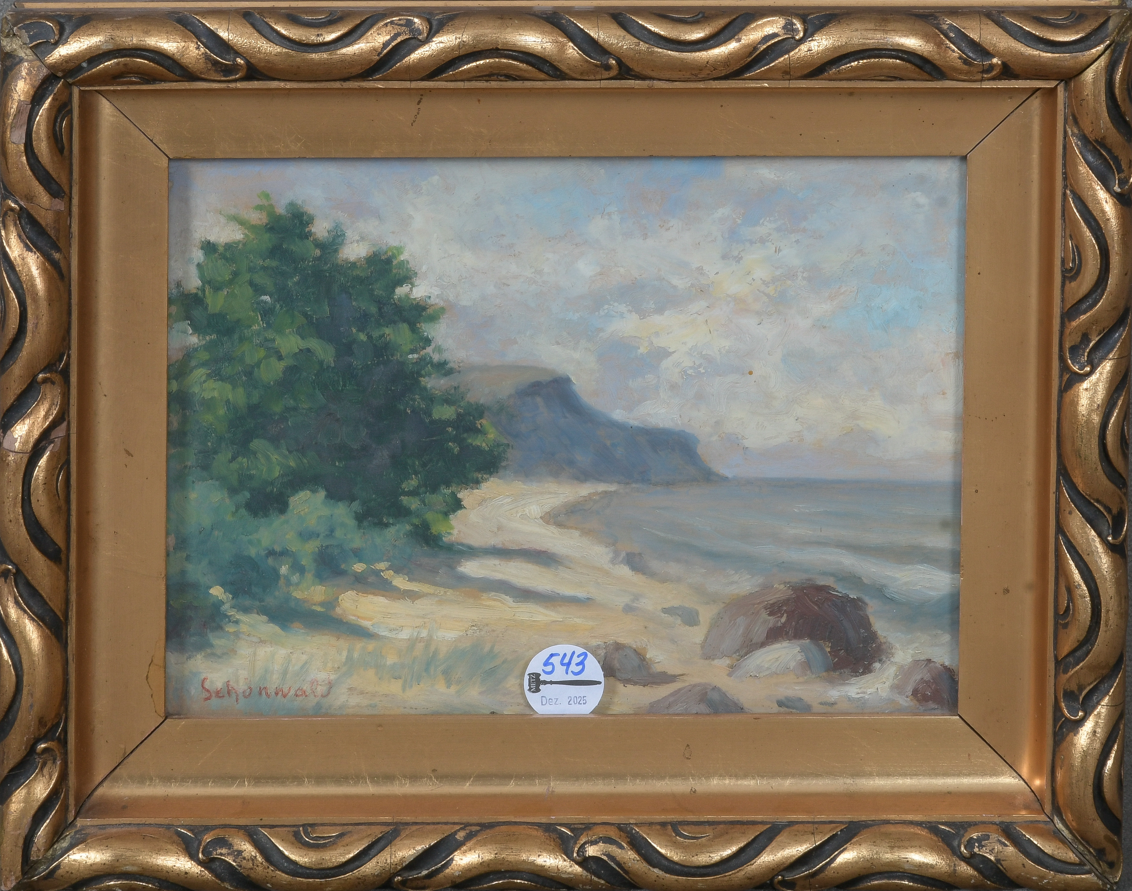 - Katalog-Nr: 543Hans Schönwald (akt. um 1930). Küstenlandschaft, wohl Ostsee. Öl/Lw., li./u./sign., mit Passepartout hi./Gl. gerahmt, 23,5 x 32 cm.o.L.