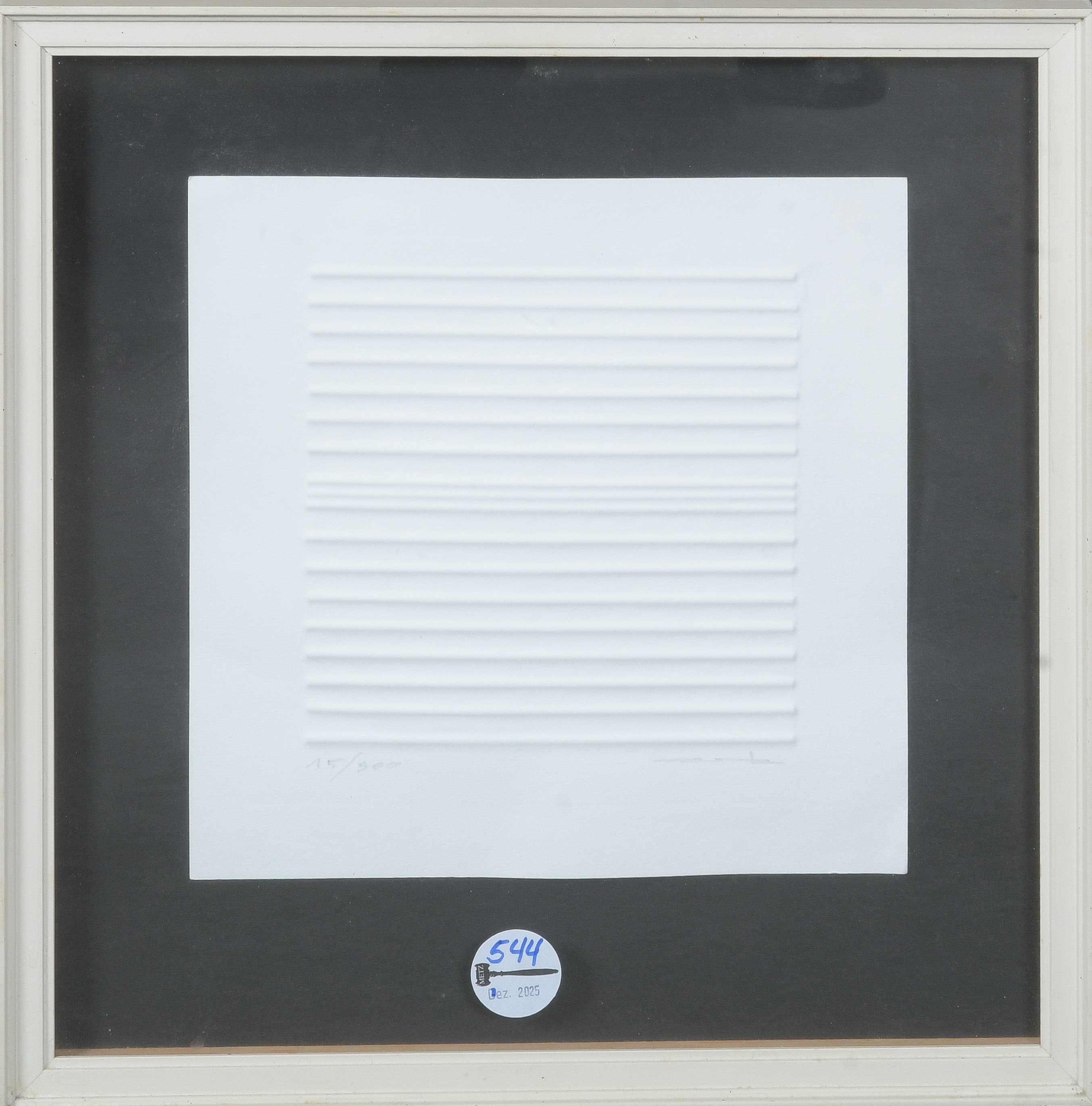 - Katalog-Nr: 544Leo Erb (1923-2012). Ohne Titel (Linienbild). Gefaltete Kartonage, Aufl. 15/900, re./u./sign., hi./Gl. gerahmt, 25 x 24 cm.o.L.