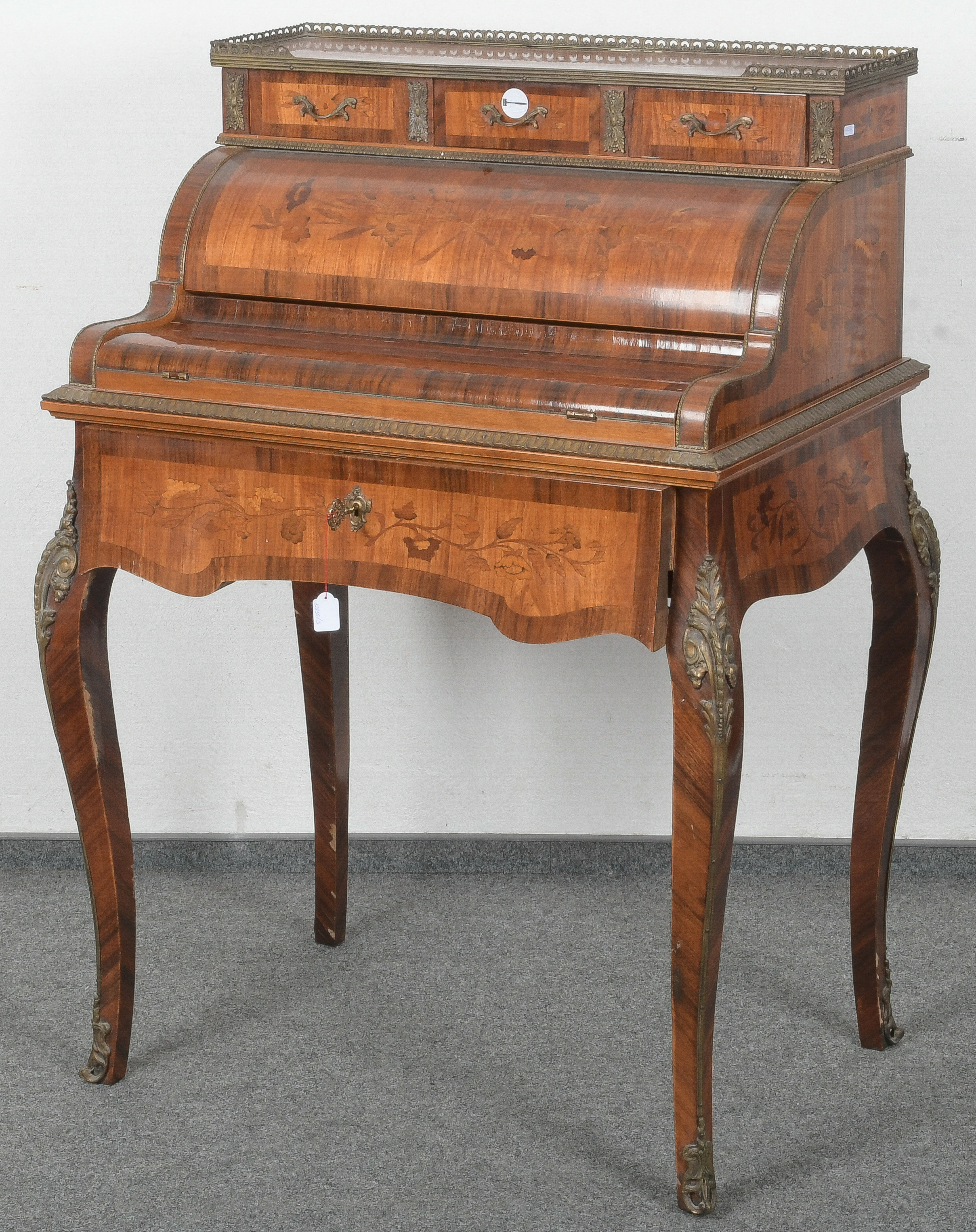 - Katalog-Nr: 547Kleiner Zylindersekretär. Frankreich 20. Jh. Furniert mit verschiedenen Hölzern und marketiert mit Blättern und Blumen, teilw. schattiert, vergoldete Bronzebeschläge; leicht gebogene Beine, einschübig, Rollklappe mit Inneneinteilung und Lederschreibfläche, zurückgesetzter Aufbau mit drei Schüben und durchbrochener Galerie, H=110 cm, B=78 cm, T=56 cm.o.L.