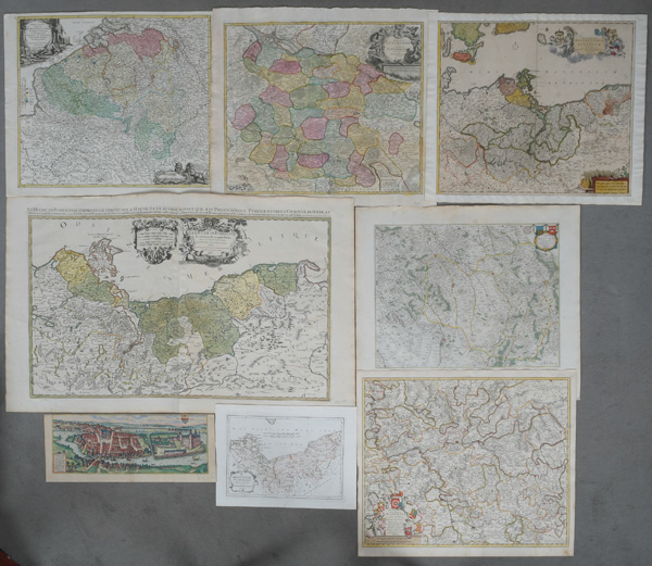 - Katalog-Nr: 526Konvolut Karten: Joan Blaeu (1596-1673), Rheinlandgebiet mit Umgebung, 41 x 53 cm / Johann Baptist Homann (1664-1772), Lüneburg, 48 x 57 cm / ders., Deutschland und angrenzende Länder, 48 x 56 cm / Johannes Janssonius & Georges Braun & Franz Hogenberg (Graphiker des 17./18. Jhs.), Hadersleben (Dänemark), 47 x 46 cm / Alexis Hubert Jaillot (1632-1712), Pommern, 56 x 88 cm / Franz Joseph von Reilly (1766-1820) attrib., Pommern, 23 x 33 cm / Frederik de Wit (1629/31-1706), Darmstadt und Umgebung, 49 x 59 cm / ders., Pommern, 49 x 56 cm. Colorierte Kupferstiche, re. bzw. li./u./sign., meist mit Wappenkartusche.o.L.