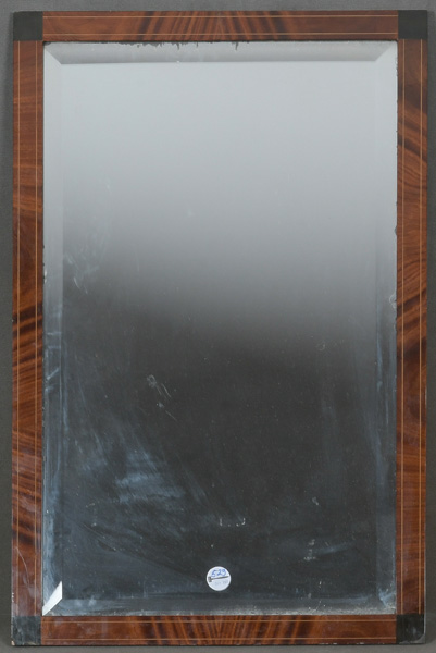 - Katalog-Nr: 529Spiegel. Deutsch 20. Jh. Mahagoni furniert, teilw. ebonisiert, mit Bandeinlagen und an den Kanten facettiert geschliffenem Spiegelglas, 84,5 x 55 cm.o.L.