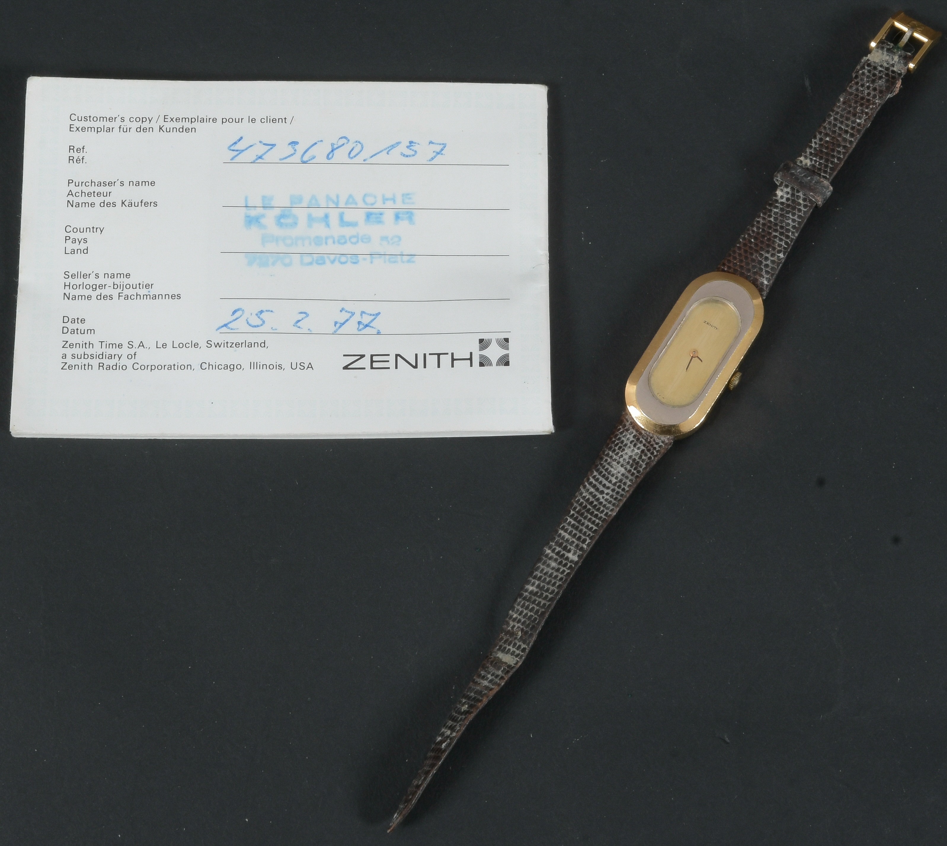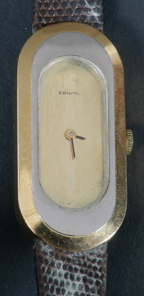 - Katalog-Nr: 602Damenarmbanduhr „Zenith“. 18 kt Goldgehäuse mit Handaufzug und Garantieheftchen vom 25.2.1977. (Funktion ungeprüft)o.L.