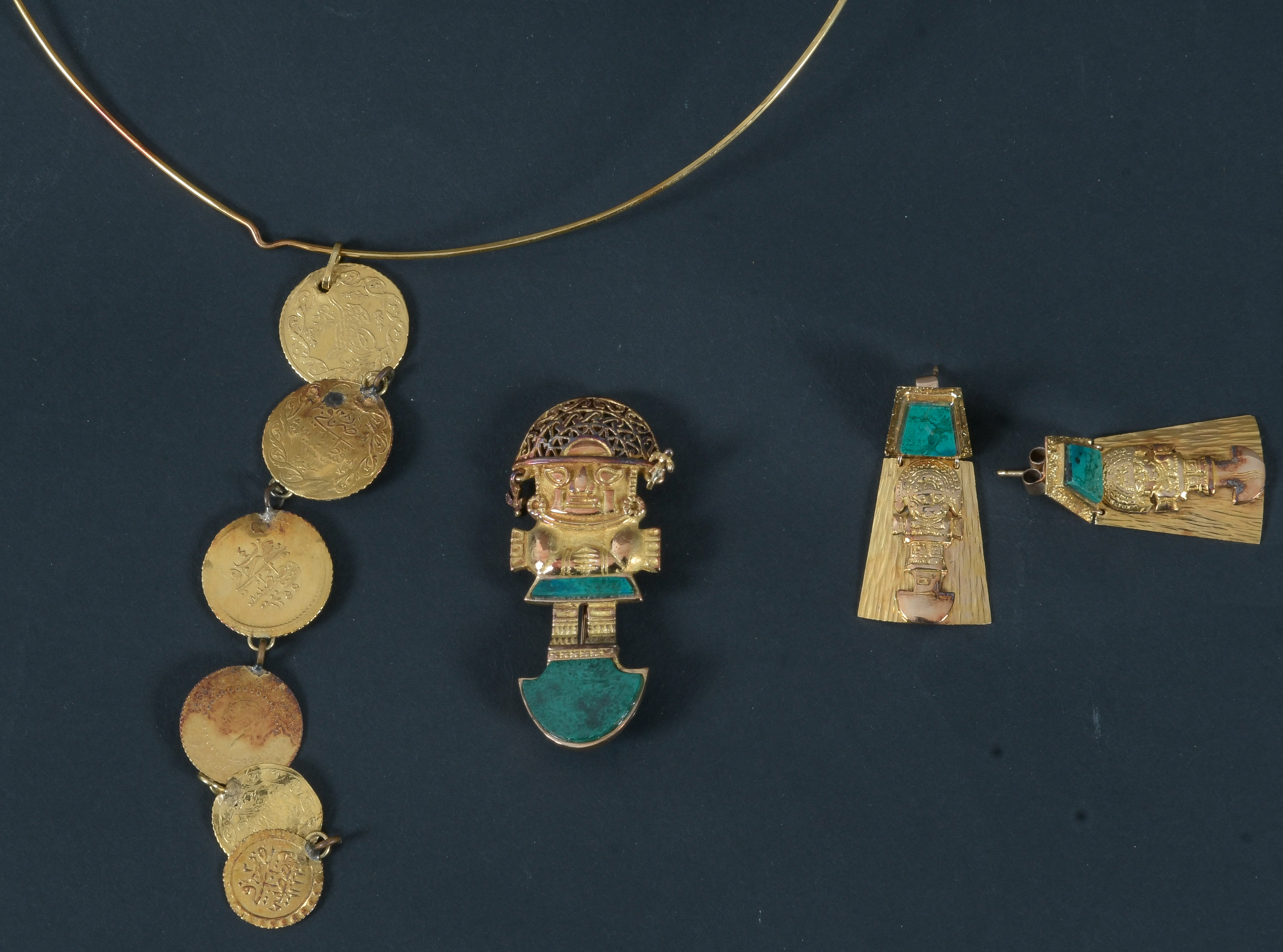 - Katalog-Nr: 607Dreitlgs. Konvolut Schmuck aus Peru: Eine Brosche, ein Paar Ohrhänger und ein Halsreif mit Münzanhängern. 18 kt Gold, teilw. besetzt mit Schmucksteinen, wohl Malachit, Gesamtgewicht ca. 44,5 g.o.L.