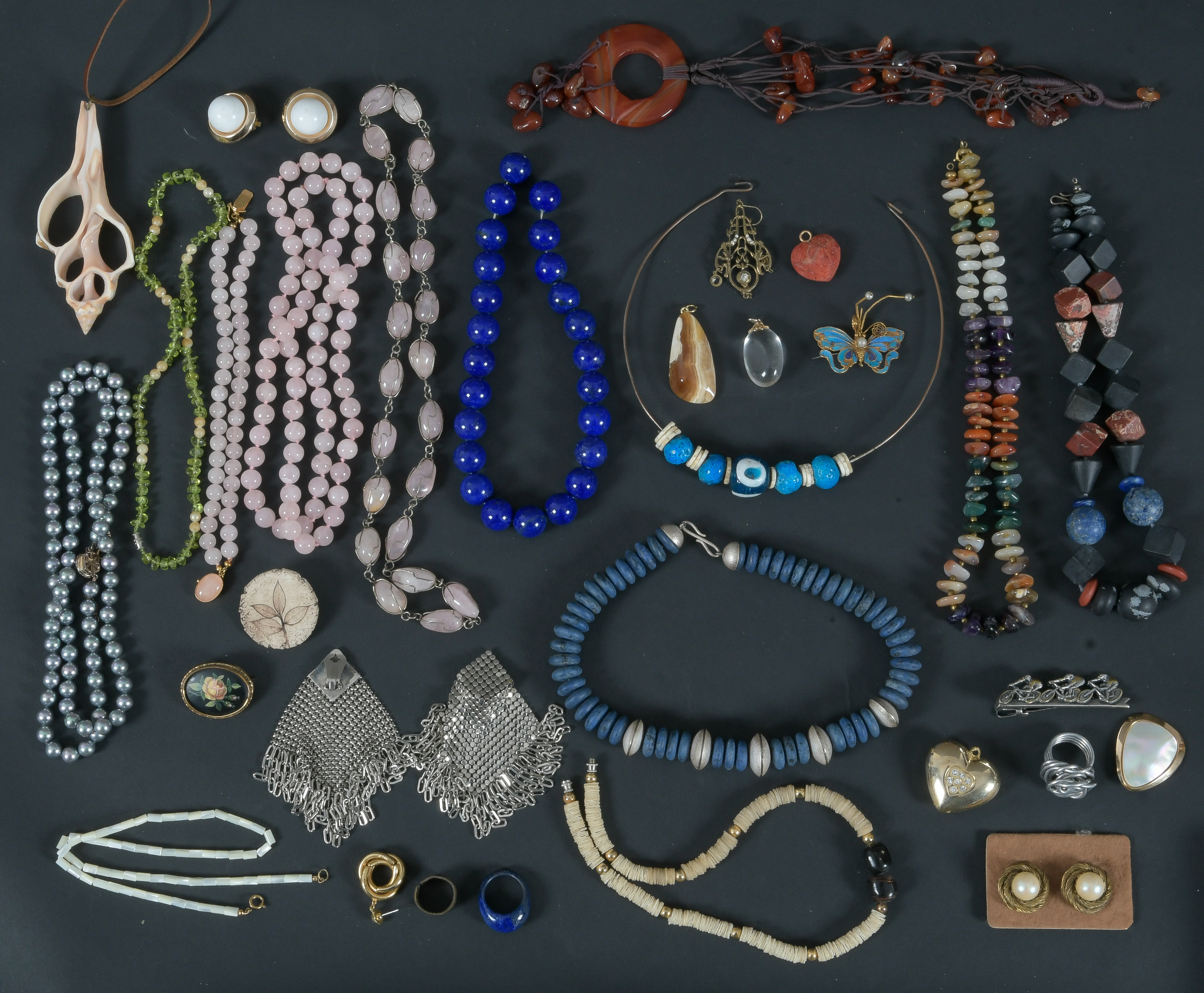 - Katalog-Nr: 608Großes Konvolut Modeschmuck, u.a. Anhänger, Armbänder, Broschen, Halsketten, Ohrclips, Ohrringe und Ringe, u.a. besetzt mit Jade, Koralle und Perlen, teilw. mit Silberverschluss, L=20 bis 90 cm.o.L.