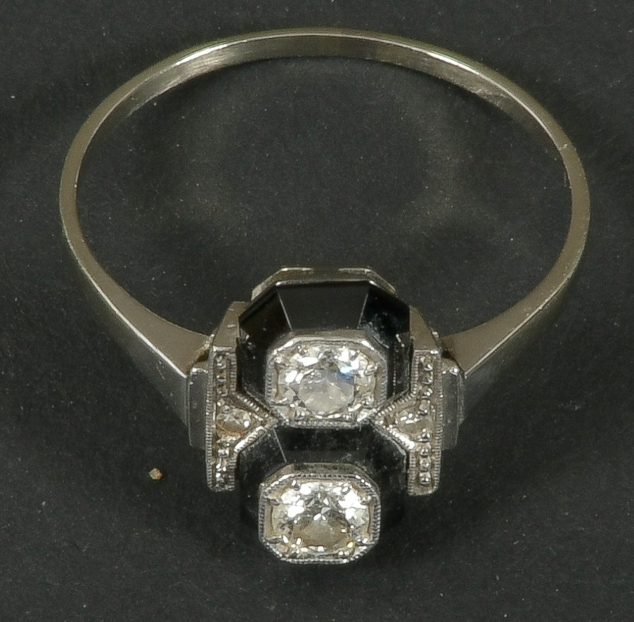 - Katalog-Nr: 610Art Déco-Ring. 18 kt Weißgold, besetzt mit zwei Brillanten, ca. 0,30 ct, und Onyx, Ringgröße 57.o.L.