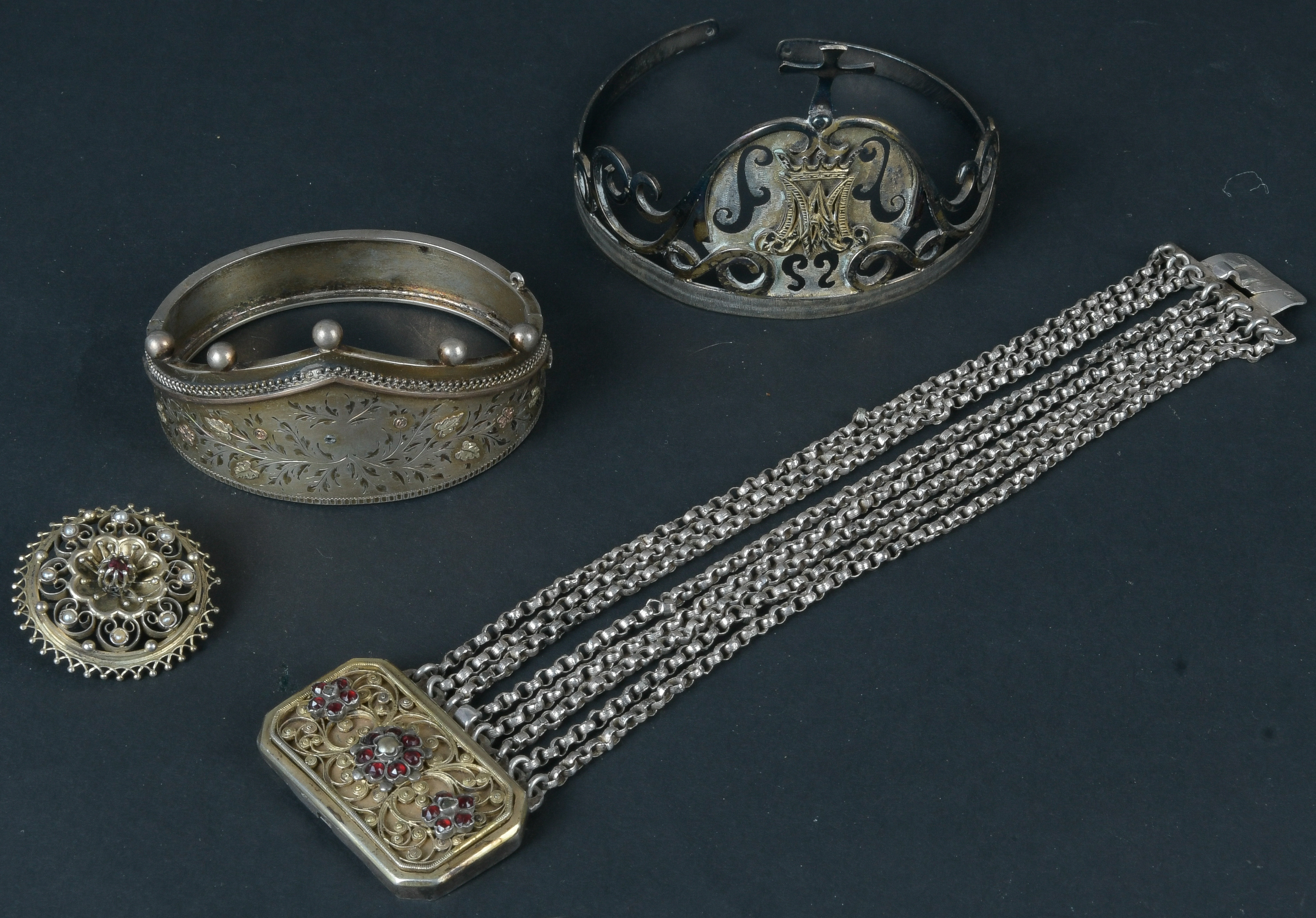 - Katalog-Nr: 612Viertlgs. Konvolut Trachtenschmuck: Zwei Armreife, eine Brosche und ein Gliederarmband. Silber, besetzt mit Granaten und Perlen, Gesamtgewicht ca. 65,06 g, L=20 cm, D=6,5 bis 7,5 cm.o.L.