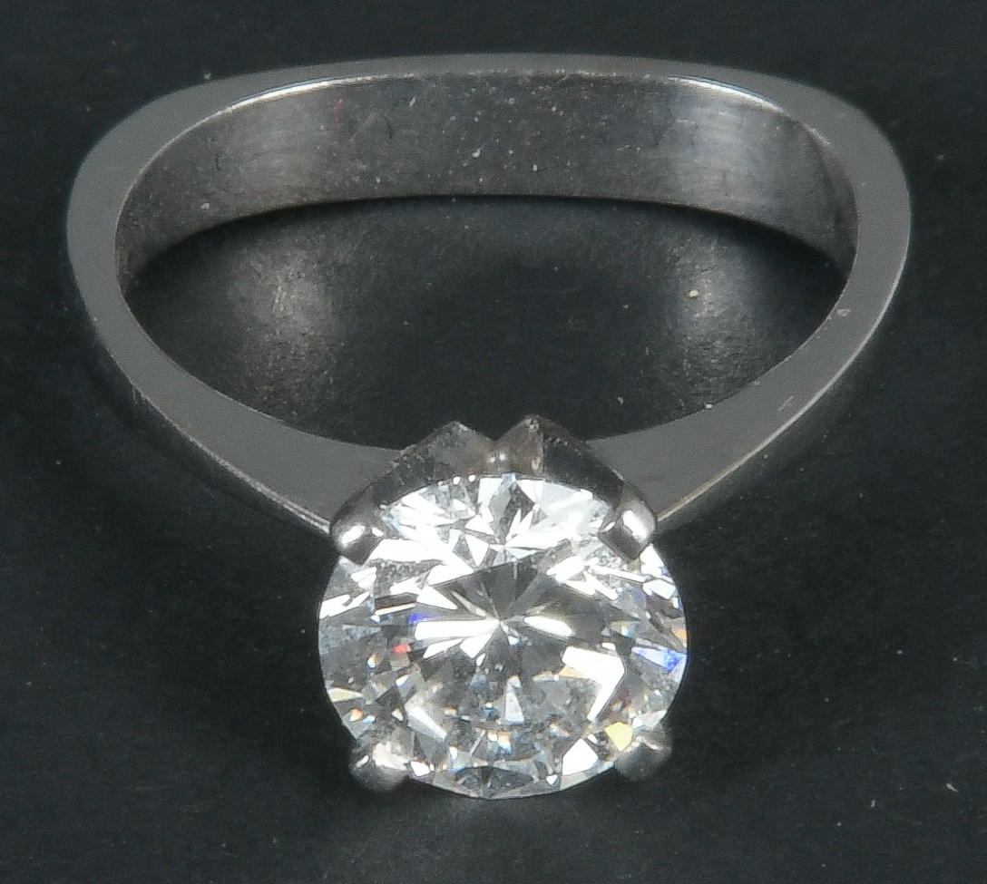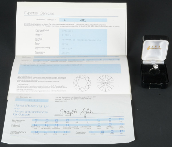 - Katalog-Nr: 613Solitärring. 18 kt Weißgold, besetzt mit Brillant, ca. 2,028 ct, Gesamtgewicht ca. 4,5 g, Ringgröße 53. Mit Expertise Nr. A 401 der Diamant Prüflabor GmbH, Idar-Oberstein vom 26.9.1977.o.L.