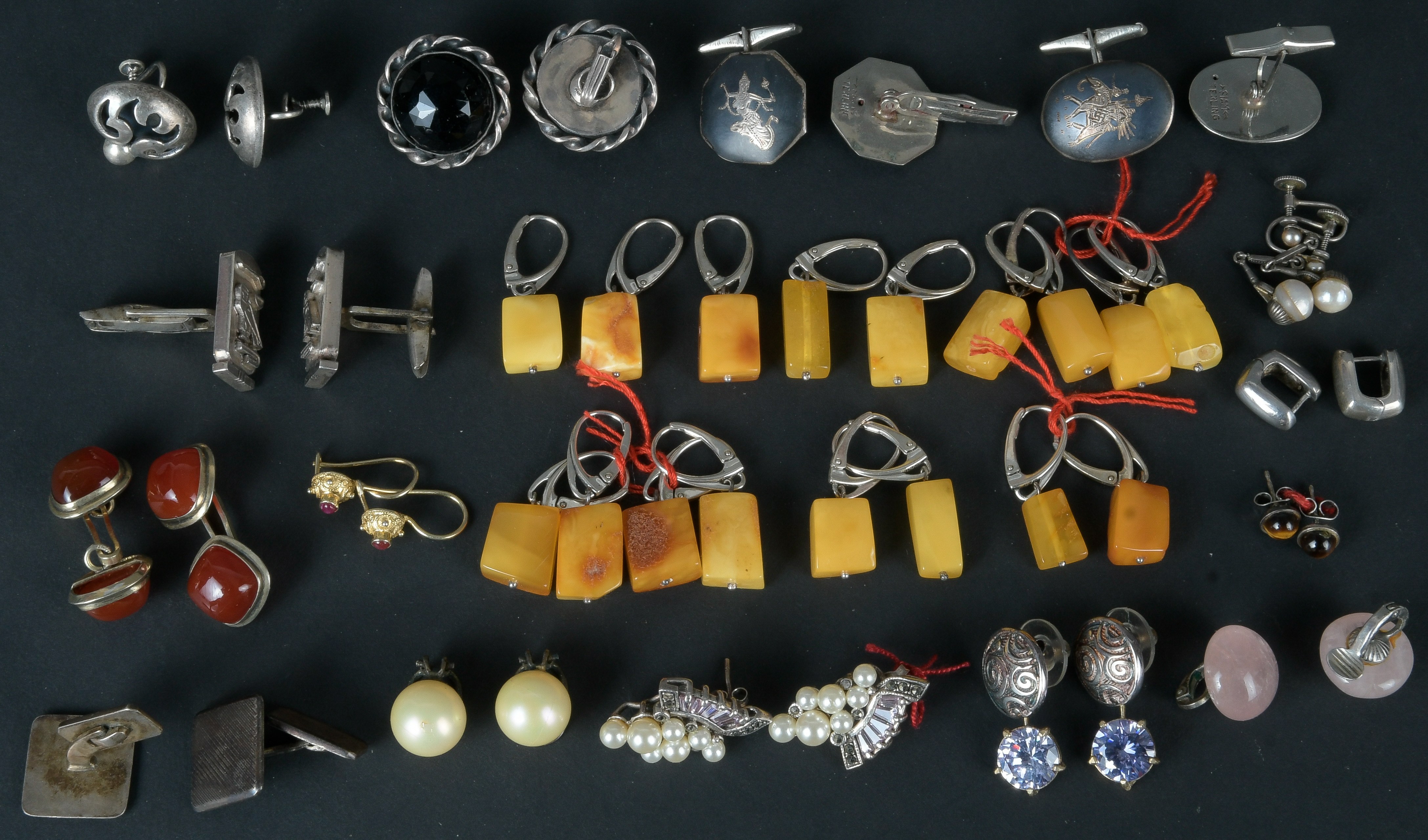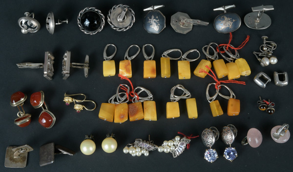 - Katalog-Nr: 614Konvolut Silber-Schmuck: Ohrclips, Ohrstecker und Manschettenknöpfe, besetzt mit Bernstein, Karneol, Perlen, Rosenquarz und Tigerauge, Gesamtgewicht ca. 65,06 g.o.L.