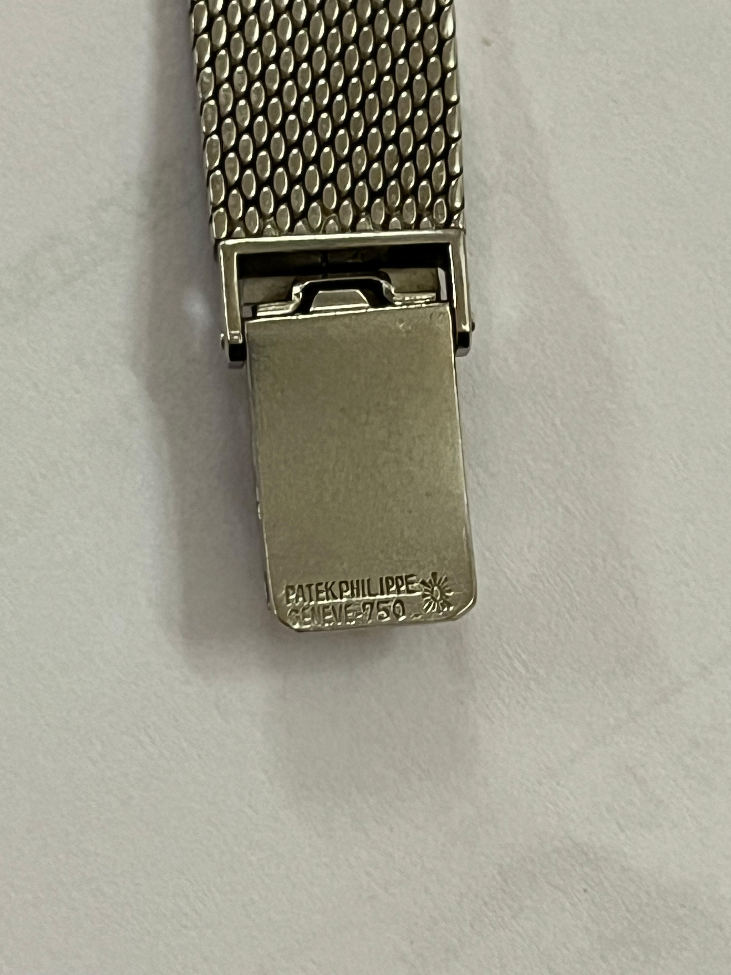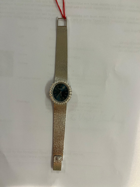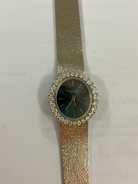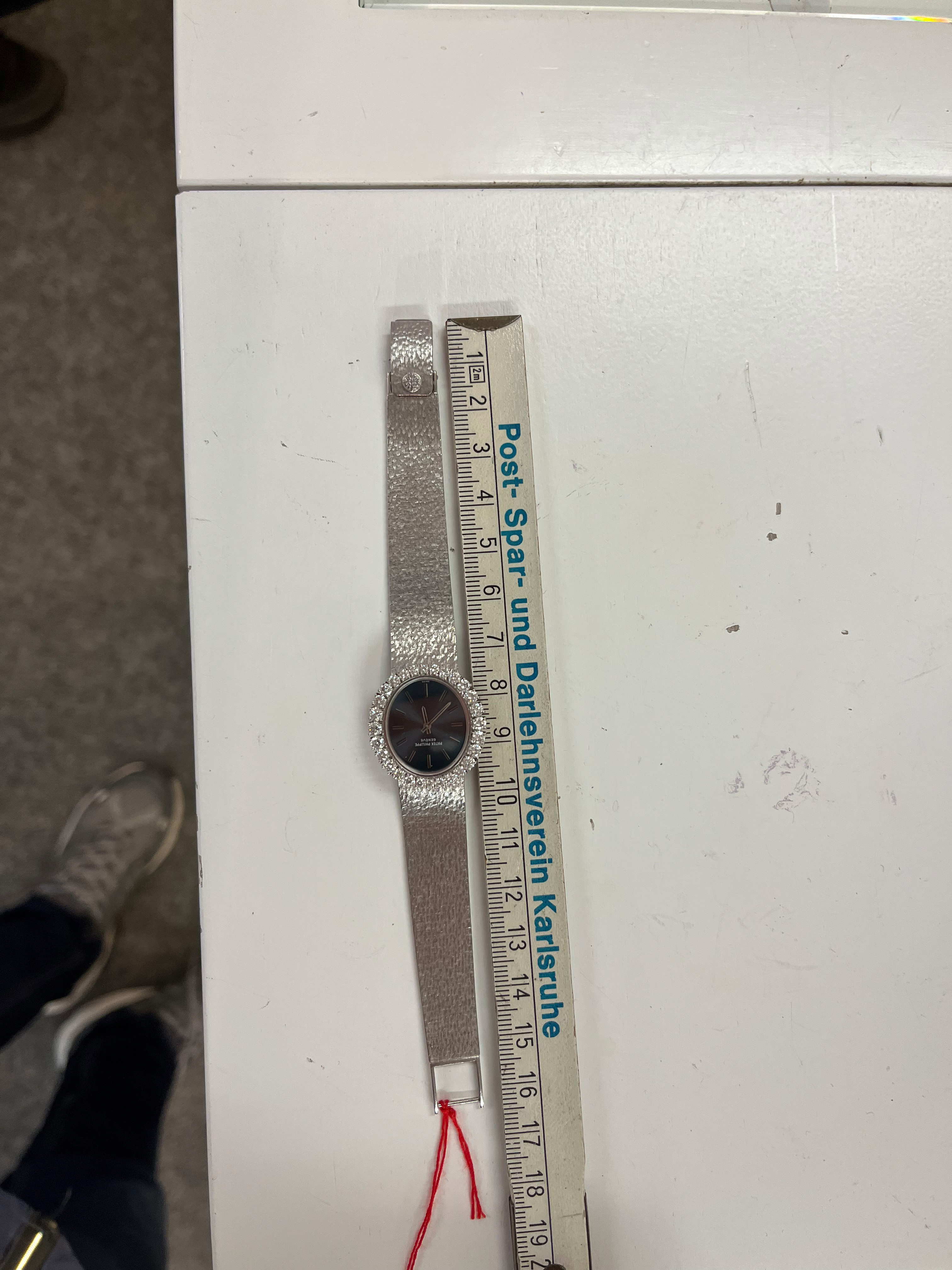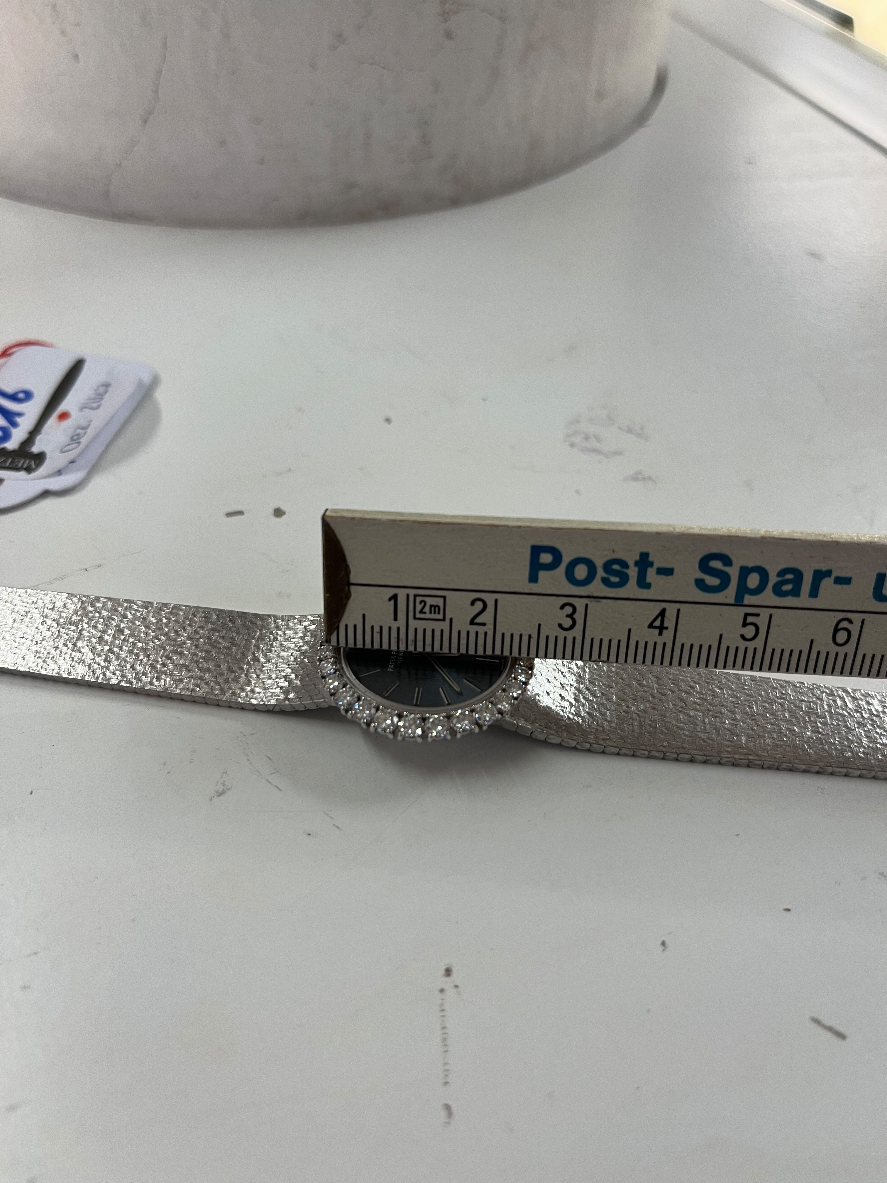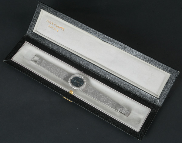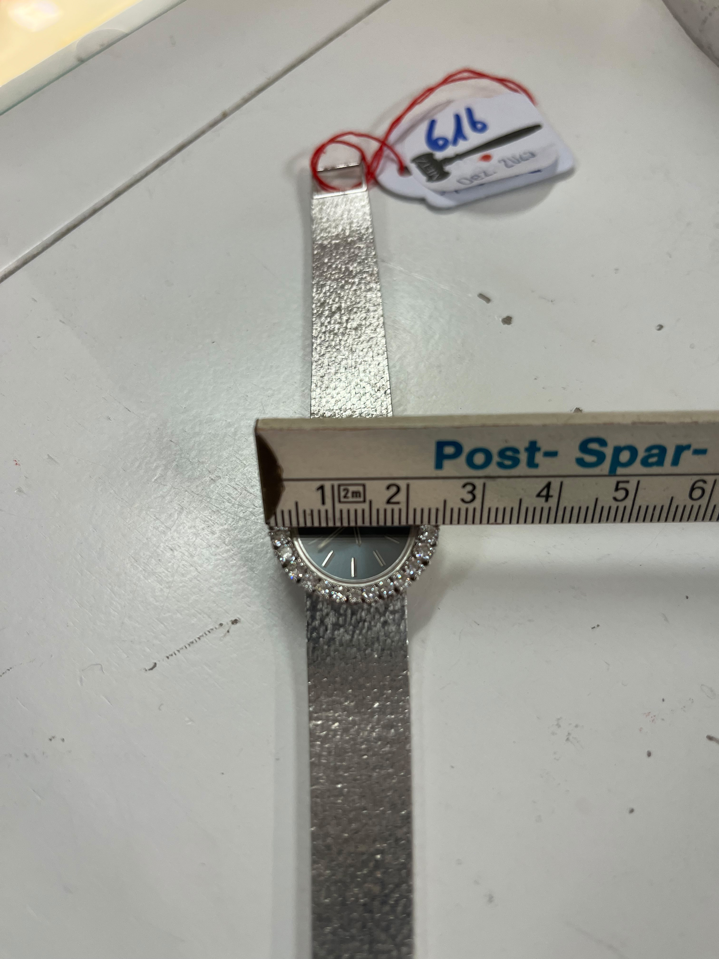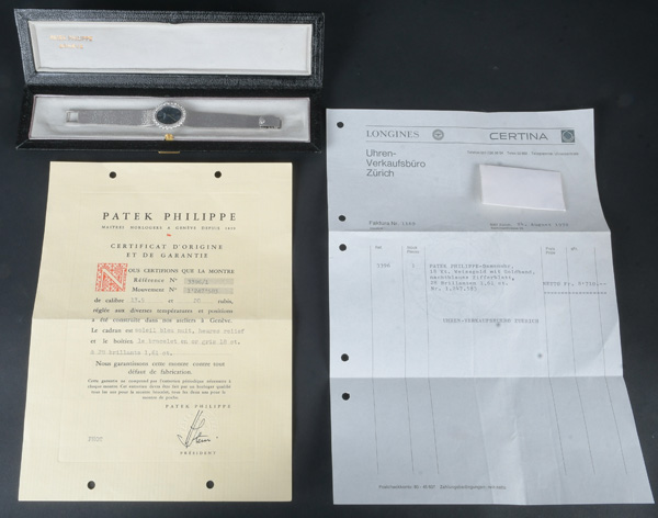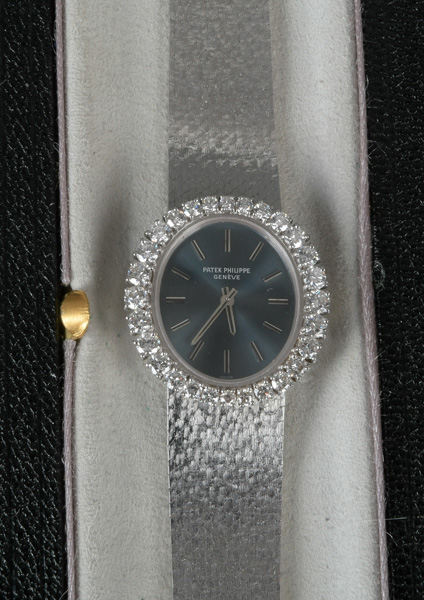 - Katalog-Nr: 616Damenarmbanduhr „Patek Philippe“. 18 kt Weißgold, besetzt mit Brillanten, ca. 1,61 ct, mit Handaufzug. Mit Zertifikat und Rechnung, Zürich 24. August 1972, über SFR 8.710,00. (Funktion ungeprüft)o.L.