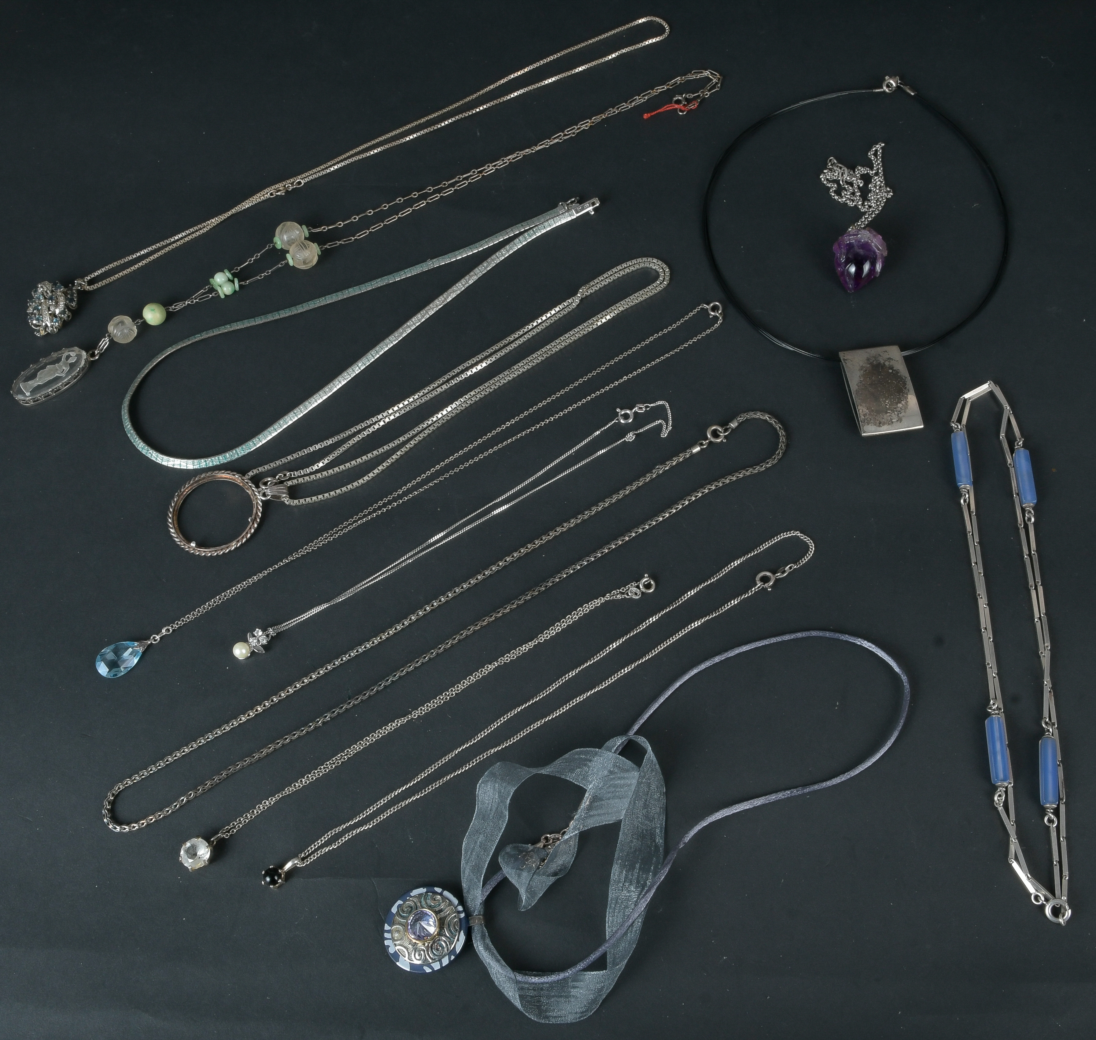 - Katalog-Nr: 617Konvolut Silber-Schmuck, ca. 135,91 g, u.a. besetzt mit Bernstein: Anhänger, Colliers und Halsketten, L=40 bis 80 cm.o.L.