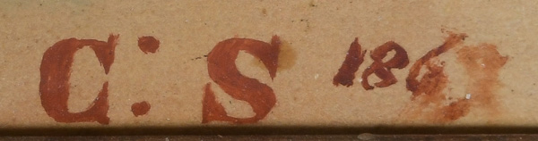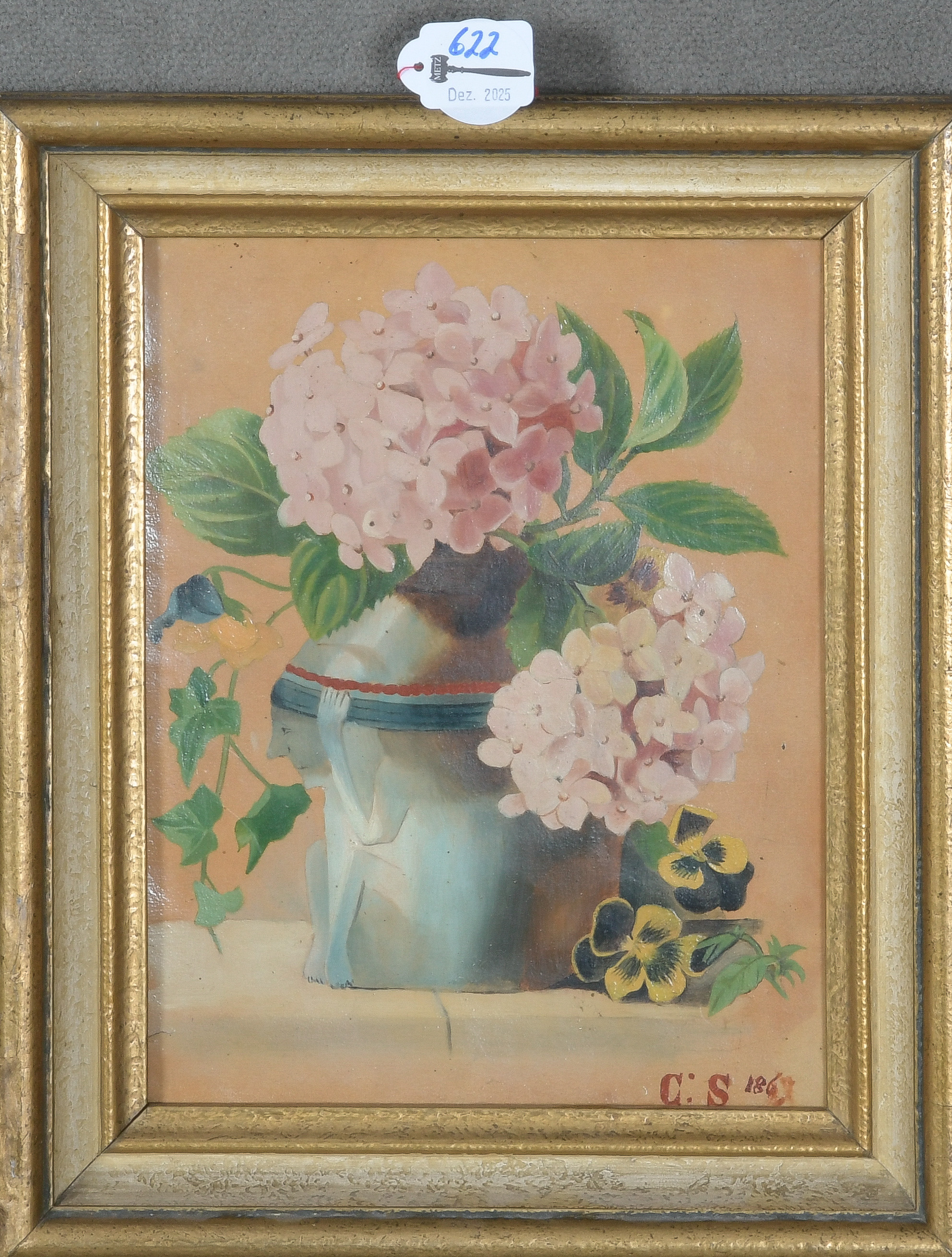 - Katalog-Nr: 622Maler des 19. Jhs. Stillleben mit Hortensienblüten in Figurenvase. Öl/Malkarton, re./u./monogr. „C.S.“/dat. 1869, gerahmt, 27 x 21,5 cm.o.L.