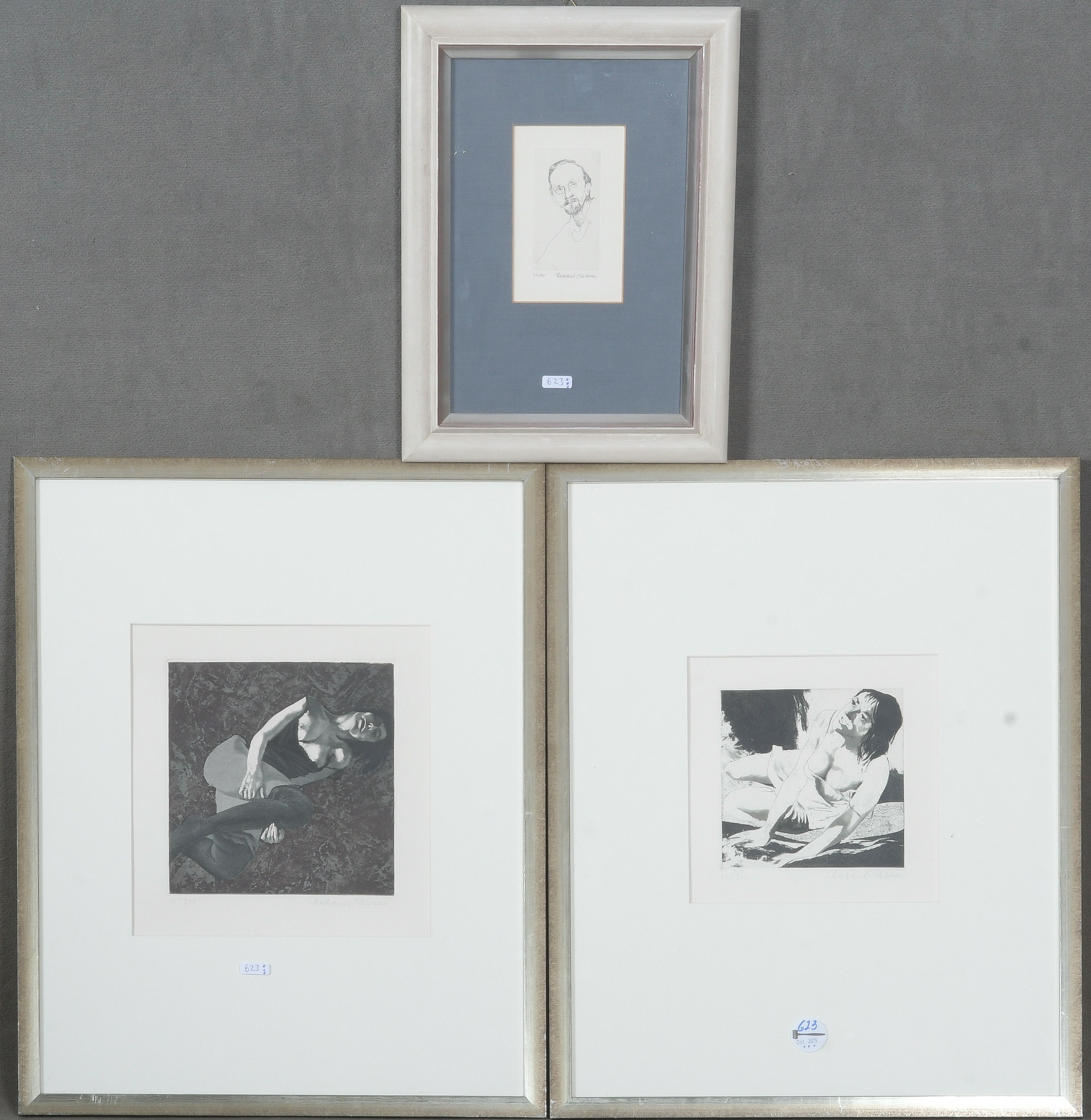 - Katalog-Nr: 623Eberhard Schlotter (1921-2014). Zwei weibliche Akte und Selbstporträt. Drei Lithographien, Aufl. 30/40 bzw. 2 x 45/250, re./u./sign., mit Passepartout hi./Gl. gerahmt, 20,5 x 19,5 / 10 x 5,5 cm.o.L.
