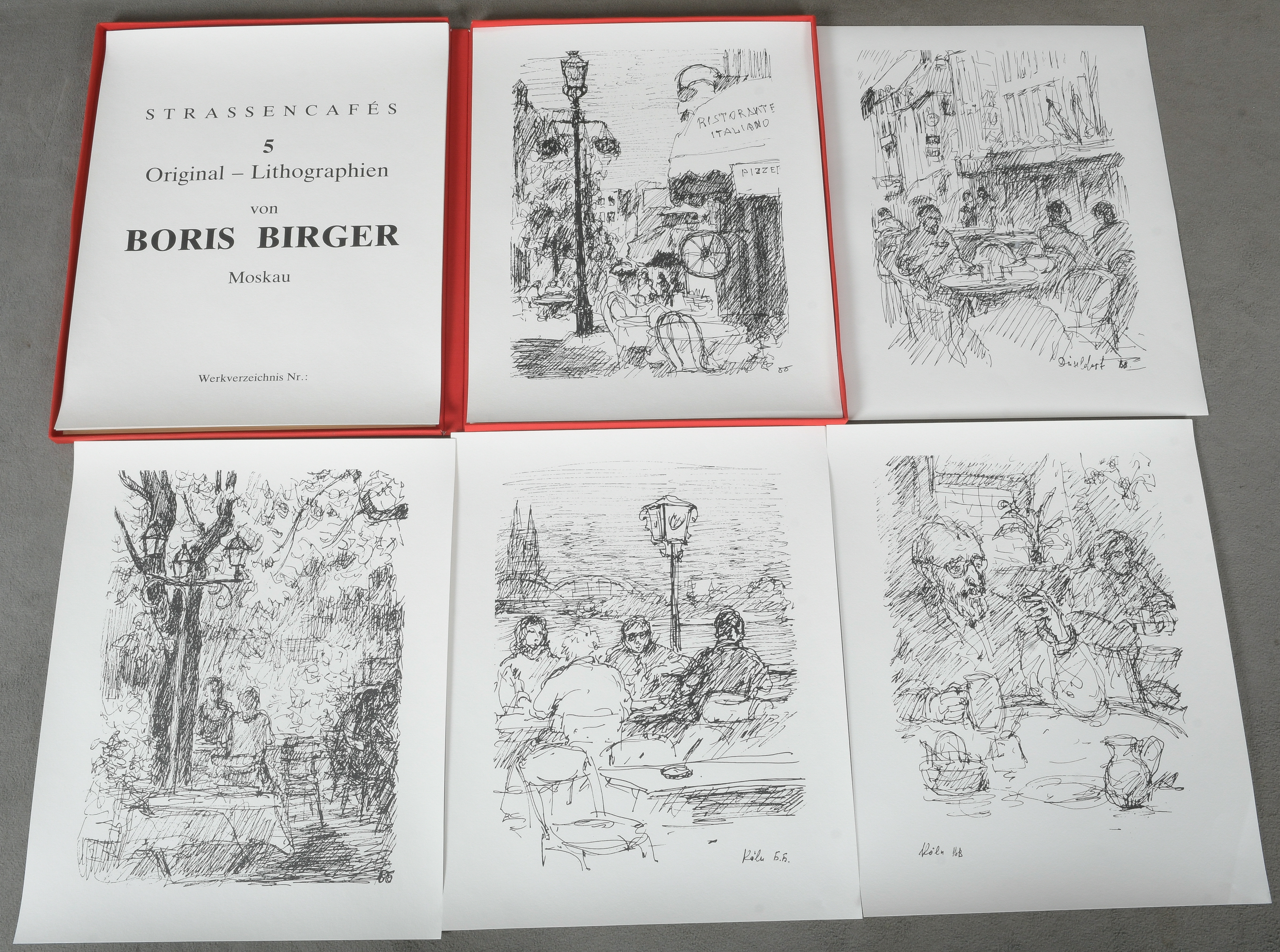 - Katalog-Nr: 624Boris G. Birger (1923-2001). Mappe „Strassencafés“. Fünf Lithographien, re./u./monogr./dat. 1988, 50 x 39 cm.o.L.