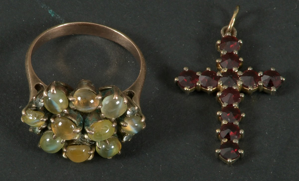 - Katalog-Nr: 601Damenring und Kreuzanhänger. 8 kt Gold, besetzt mit Mondsteinen bzw. Granaten, Gesamtgewicht ca. 4,3 g, Ringgröße 55.o.L.