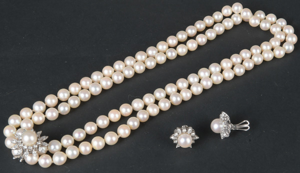 - Katalog-Nr: 605Doppelreihige Perlenkette mit Clip und ein Paar Ohrclips. 18 kt Gold, besetzt mit Brillanten, ca. 1,70 ct, Gesamtgewicht ca. 15,7 g (Clips), L=90 cm.o.L.