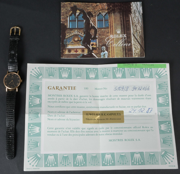 - Katalog-Nr: 606Damenarmbanduhr „Rolex Cellini“. 18 kt Goldgehäuse mit Handaufzug. Mit Garantieschein Nr. 5109/8 9472166 von Juwelier B. Kamphues, Karlsruhe 24.12.1987.o.L.