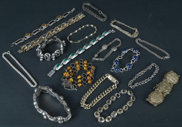 - Katalog-Nr: 615Konvolut Silber-Gliederarmbänder, ca. 362,08 g, besetzt mit Bernstein, Citrin und Lapislazuli.o.L.